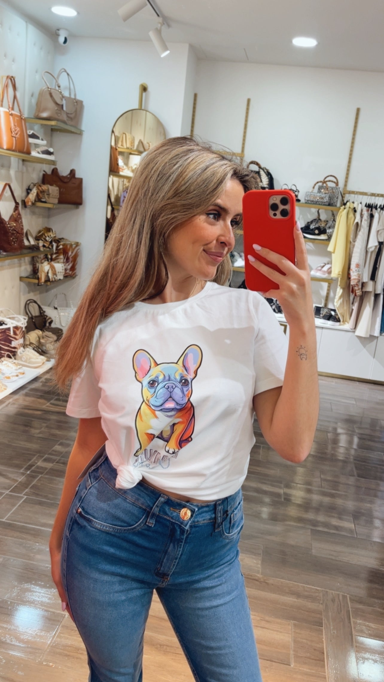 White t-shirt with colorful logo