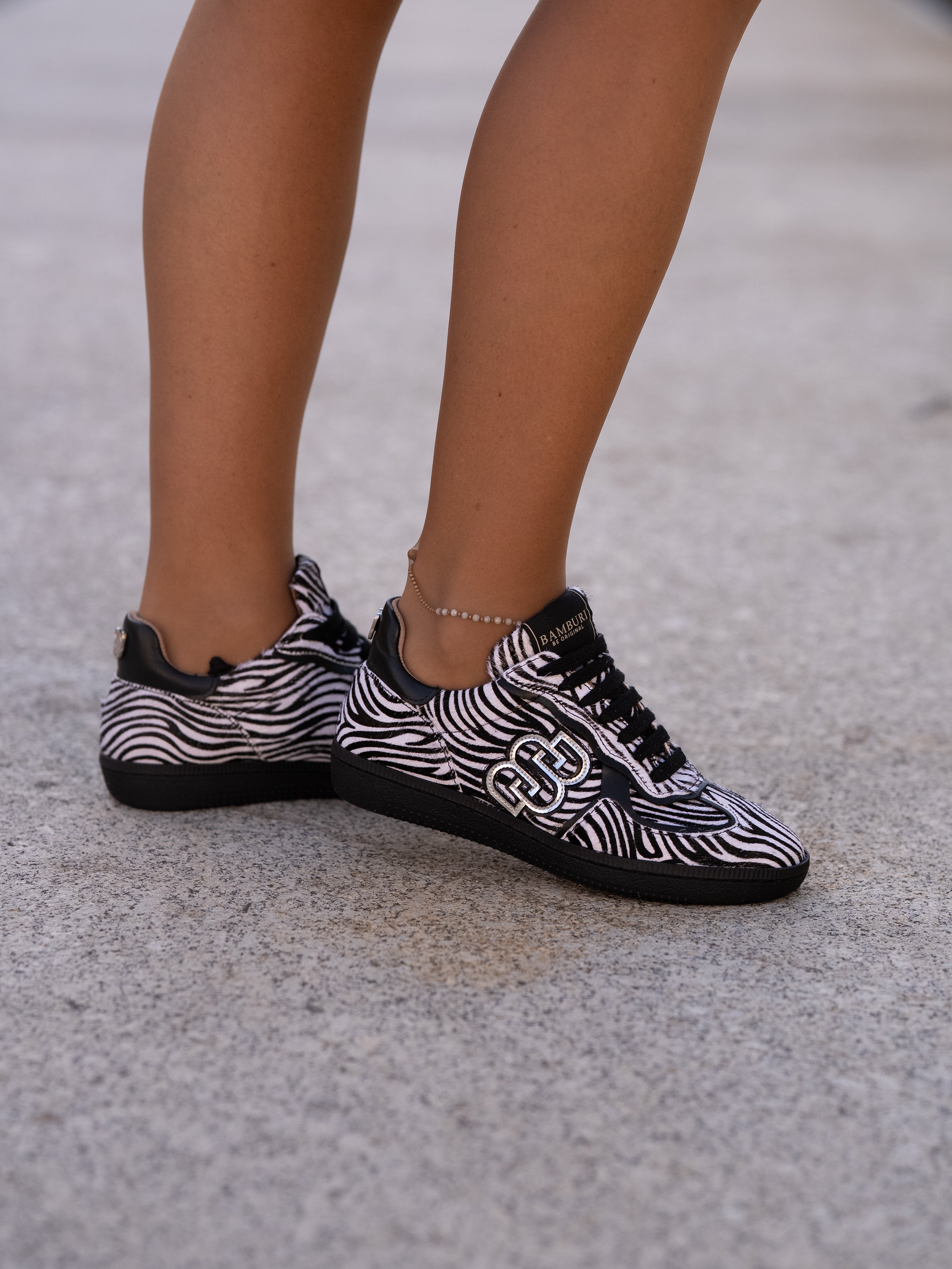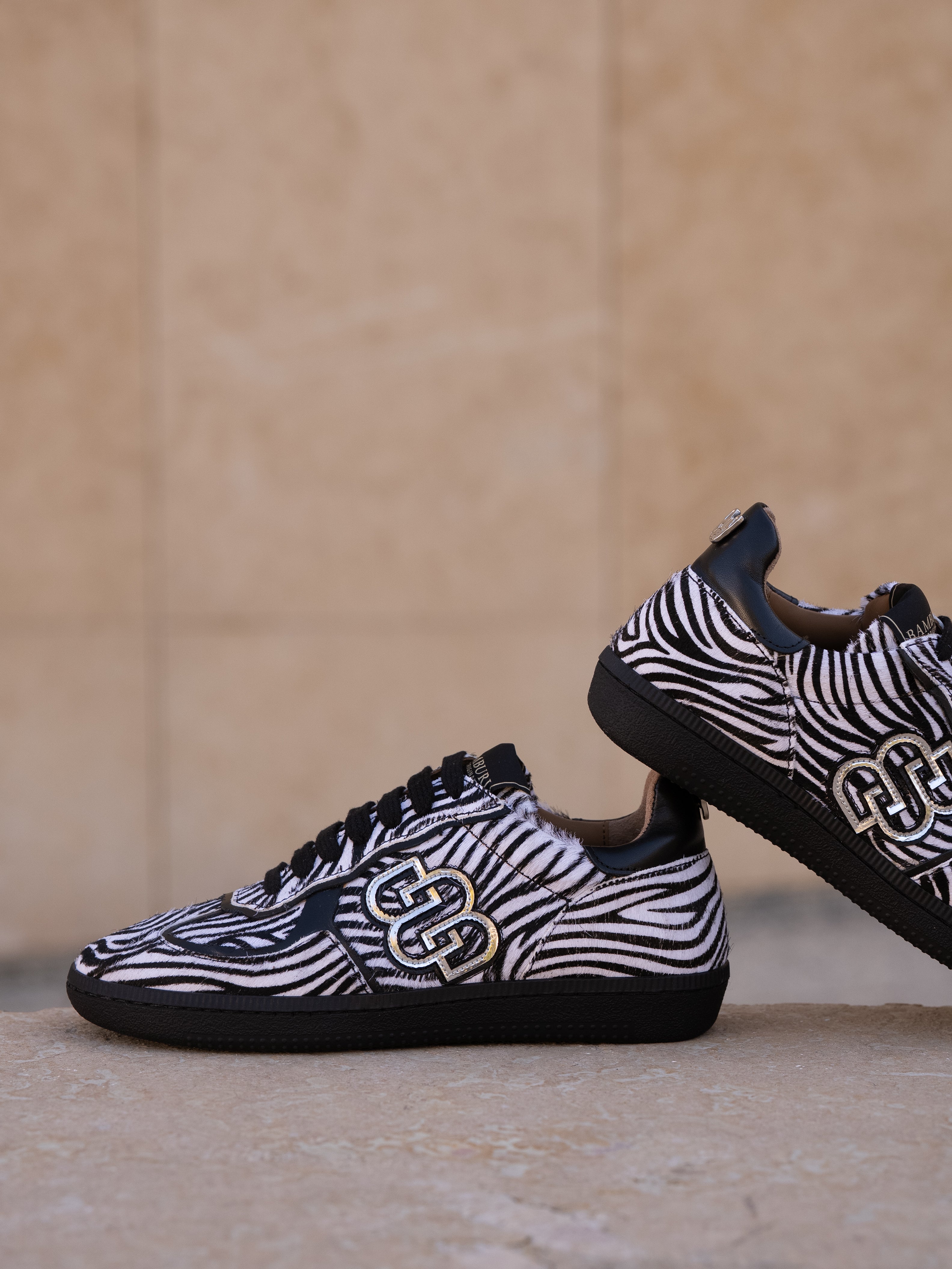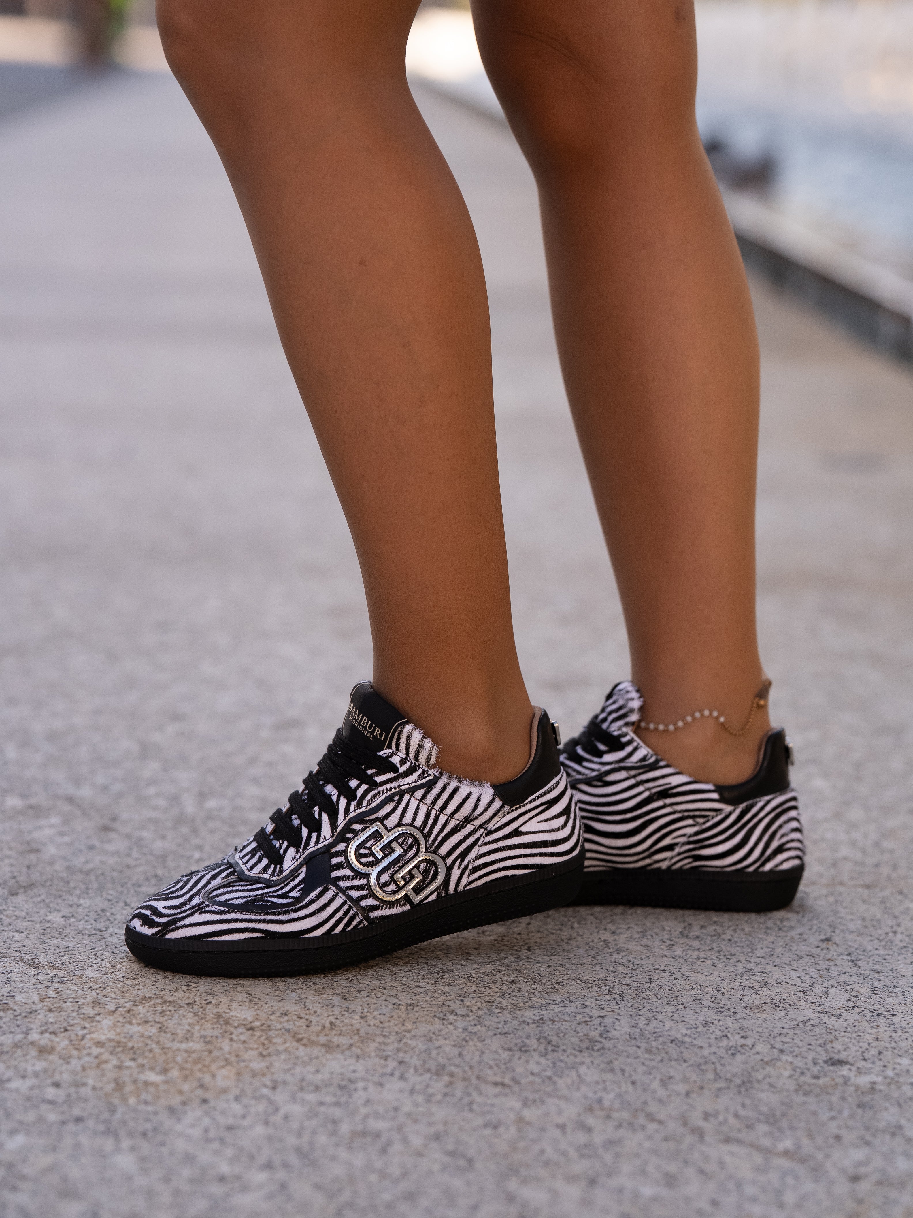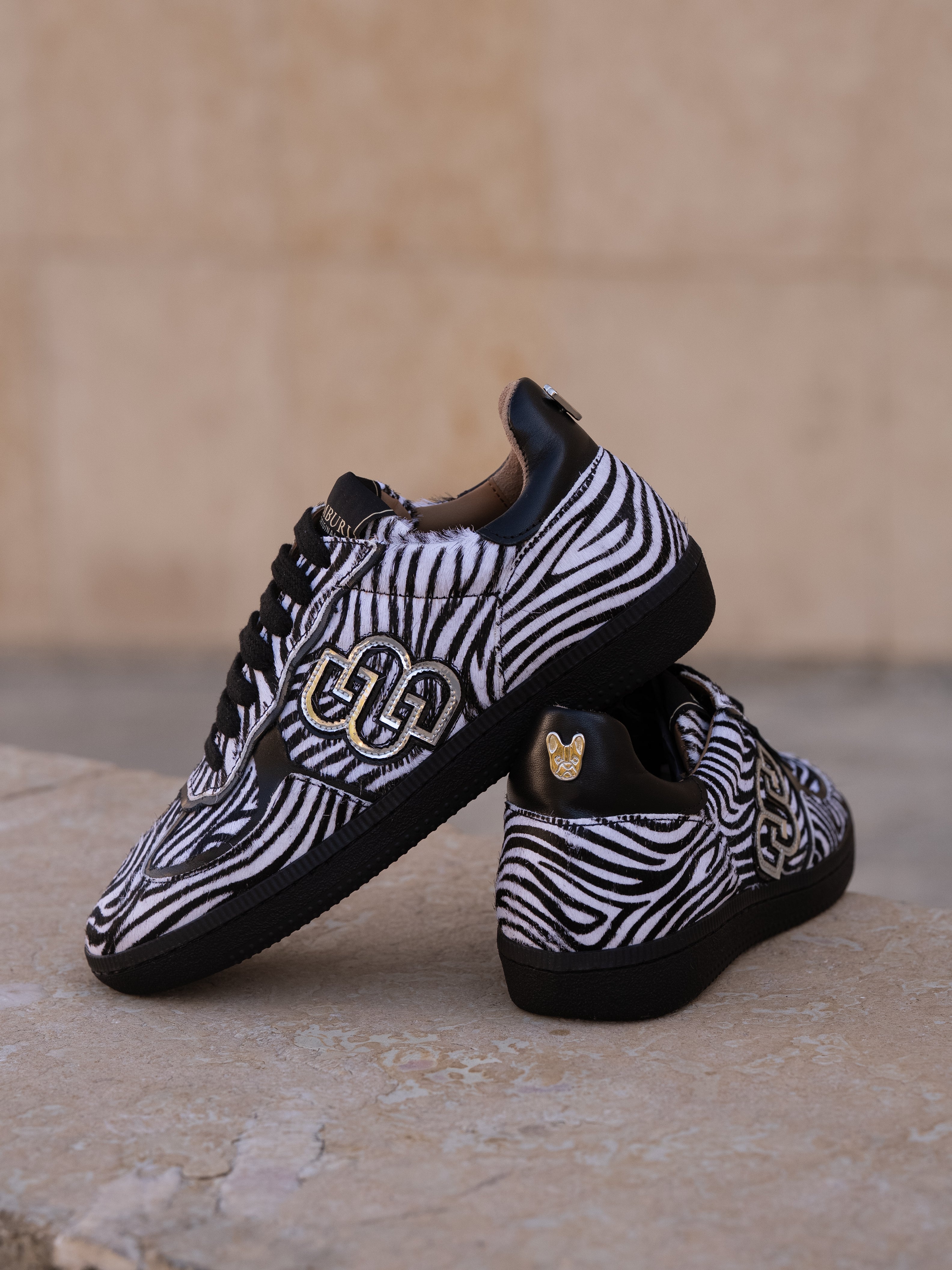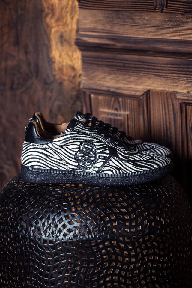 Stand out with these handcrafted low-top sneakers made from genuine zebra-print pony hair. Featuring a black rubber sole, smooth leather accents, and our iconic BB monogram embroidered on the sides. The back is finished with our signature metal dog emblem. Fully leather-lined for comfort and durability.