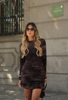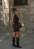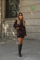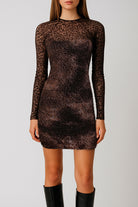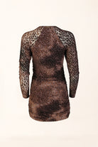 Vestido curto em malha devoré com padrão animal em relevo. A textura semitransparente e o corte próximo do corpo criam uma silhueta precisa e leve. Mangas compridas e acabamento limpo mantêm o foco no material.