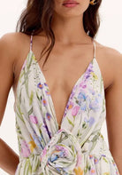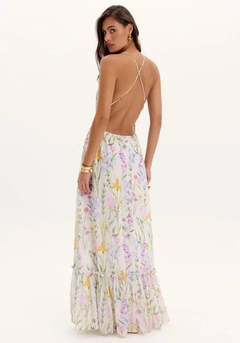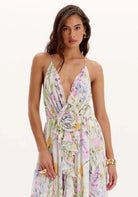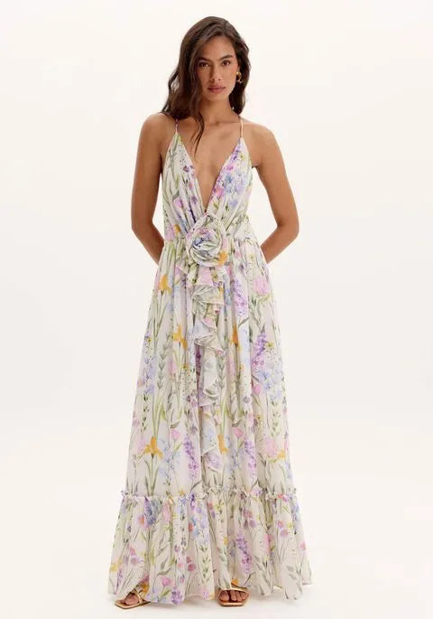 o vestido super midi com alças finas e caimento solto oferece conforto e estilo. Destaque para o detalhe de flor e os babados que inspiram sofisticação!
