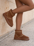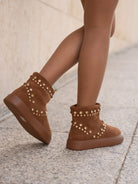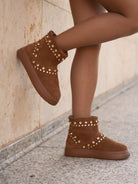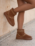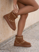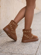 Suede ankle boot lined in faux fur, rhinestone and stud details, 30mm rubber sole