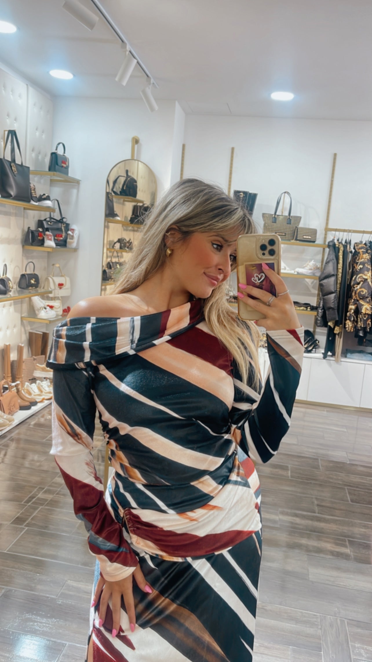 Camisola confecionado em tecido aveludado estampado. Decote assimétrico. Manga comprida. Efeito drapeado.