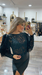 Blusa confecionada em tecido rendado. Decote redondo e manga comprida. Efeito de dupla manga com ombros ligeiramente abalonados.