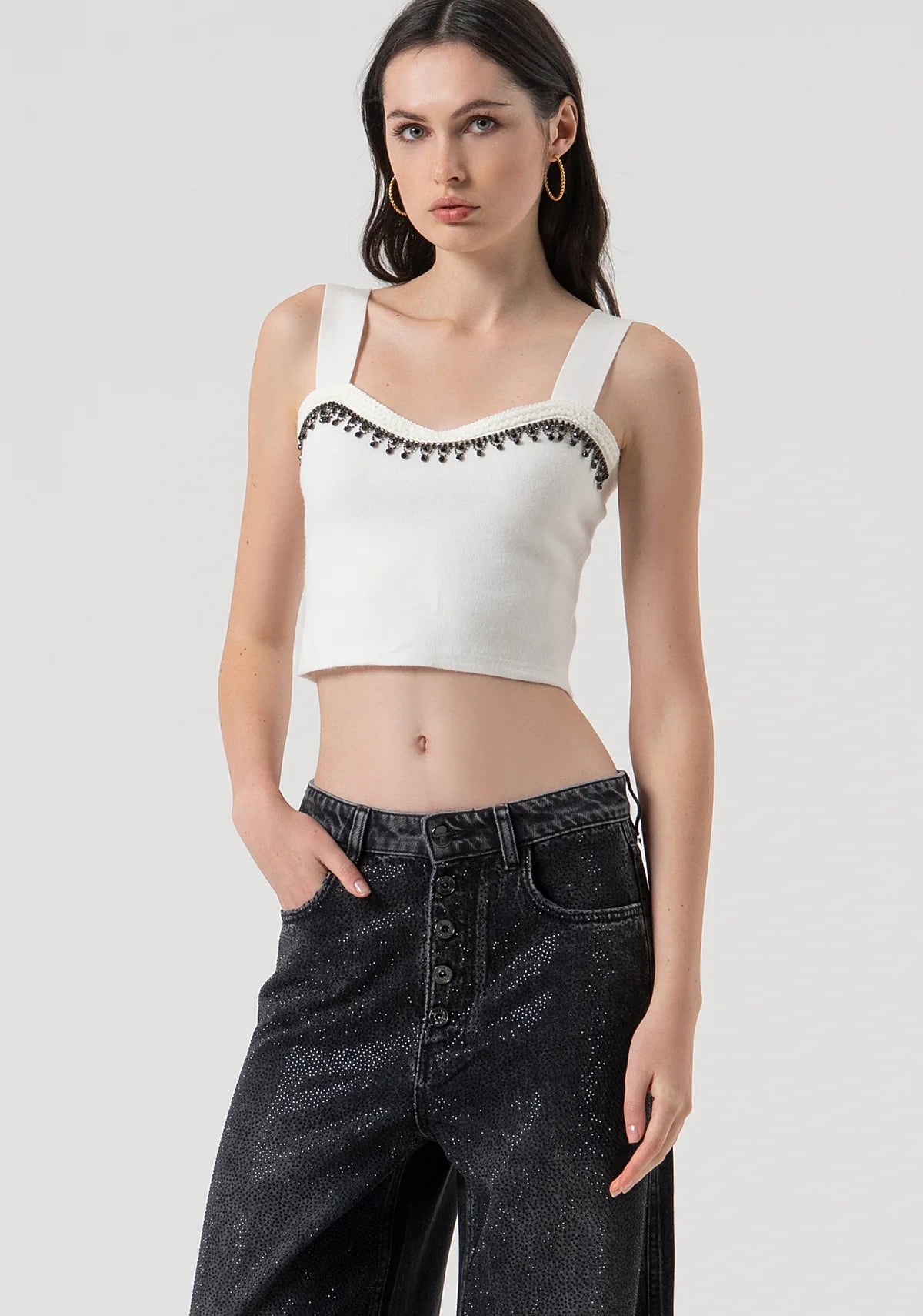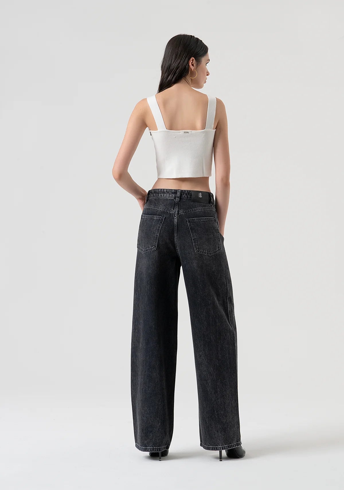 Palazzo pant wide fit made in black denim with dark wash and strasses. High waist, 5 pockets and wide bottom leg