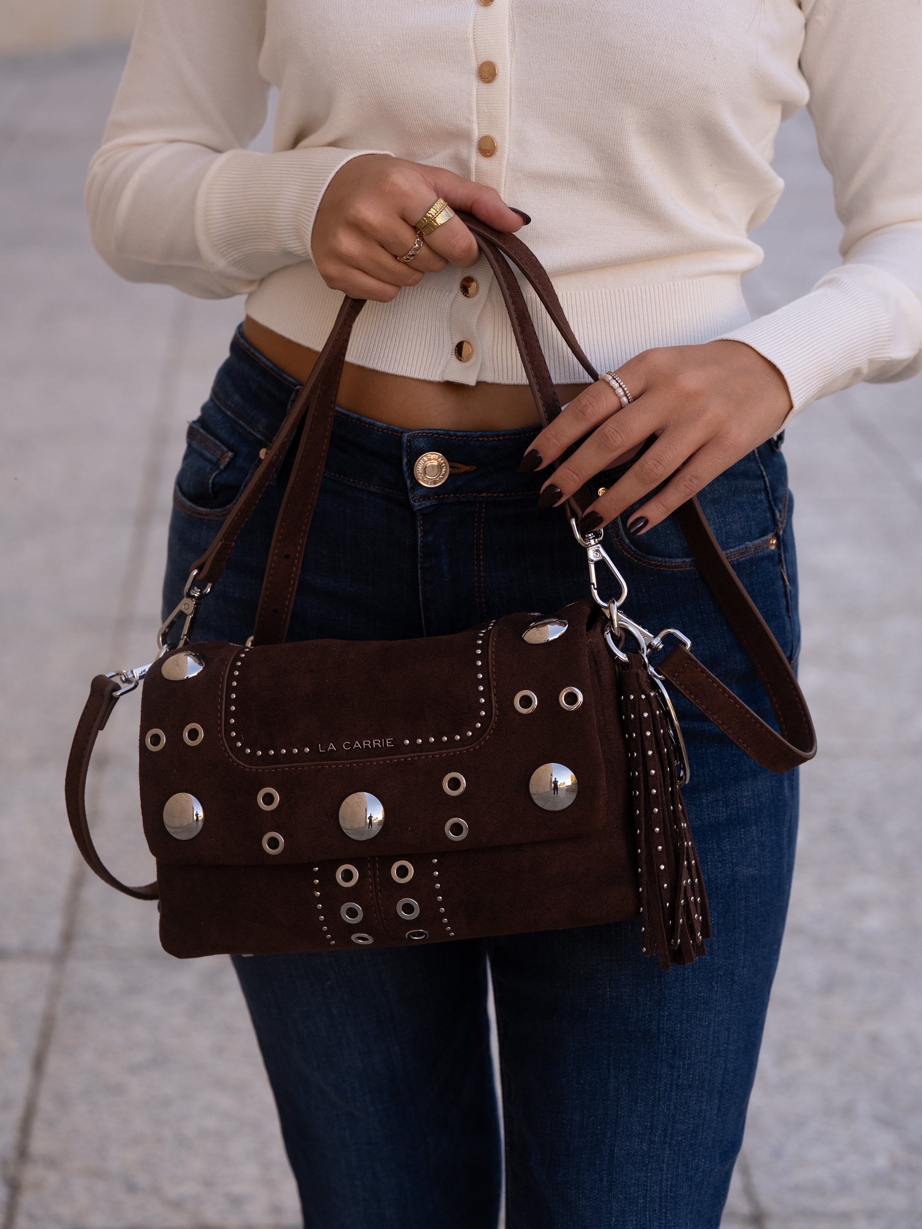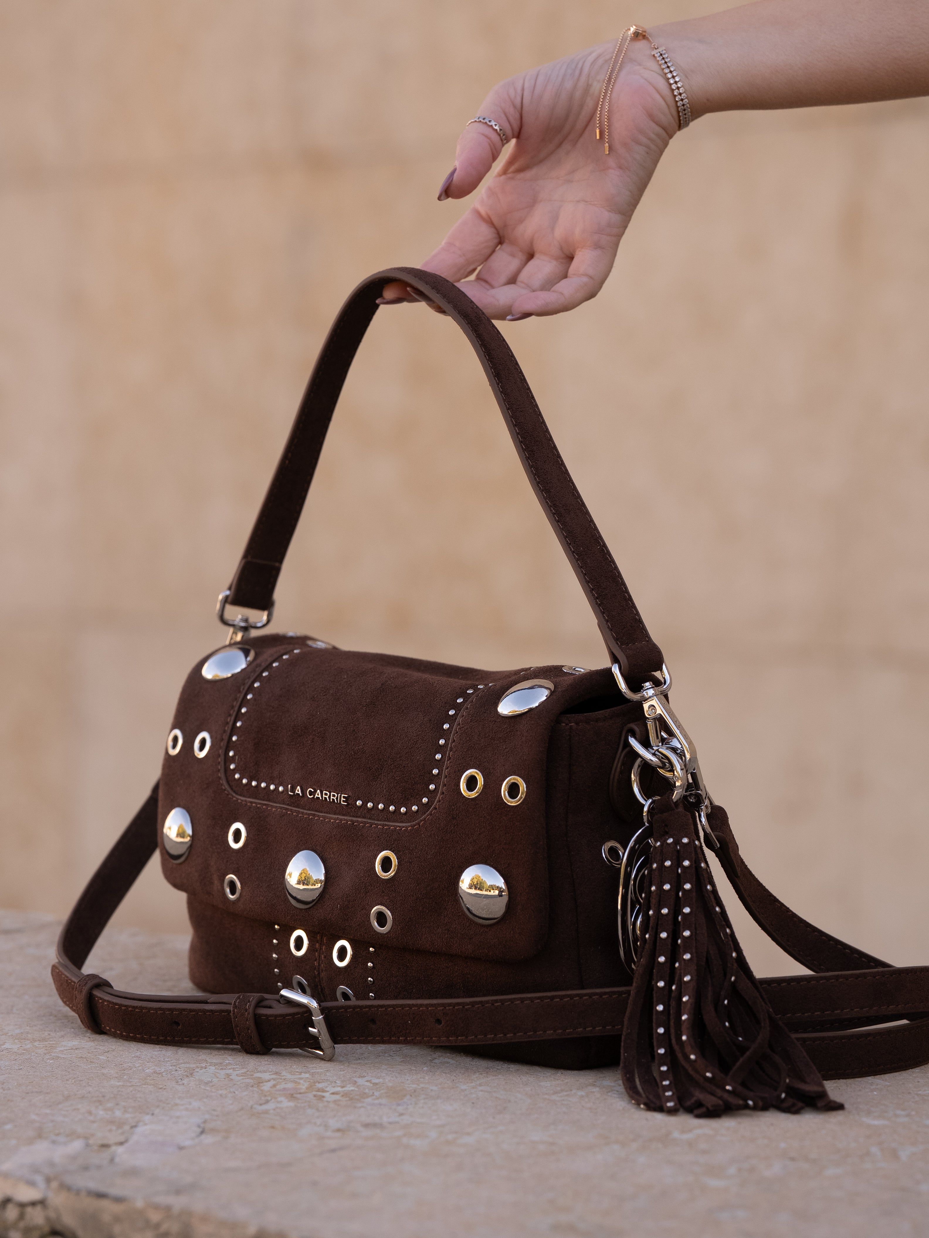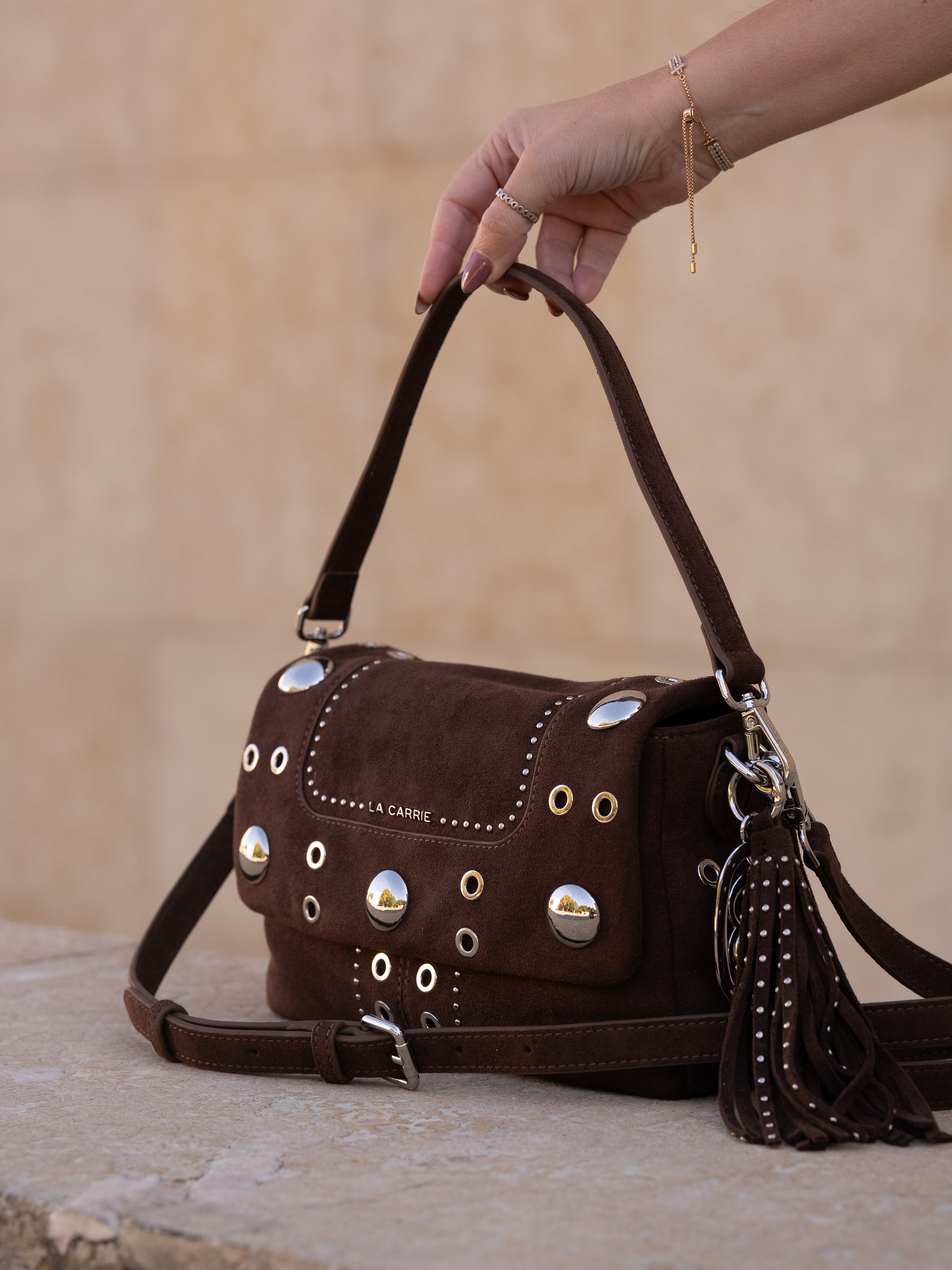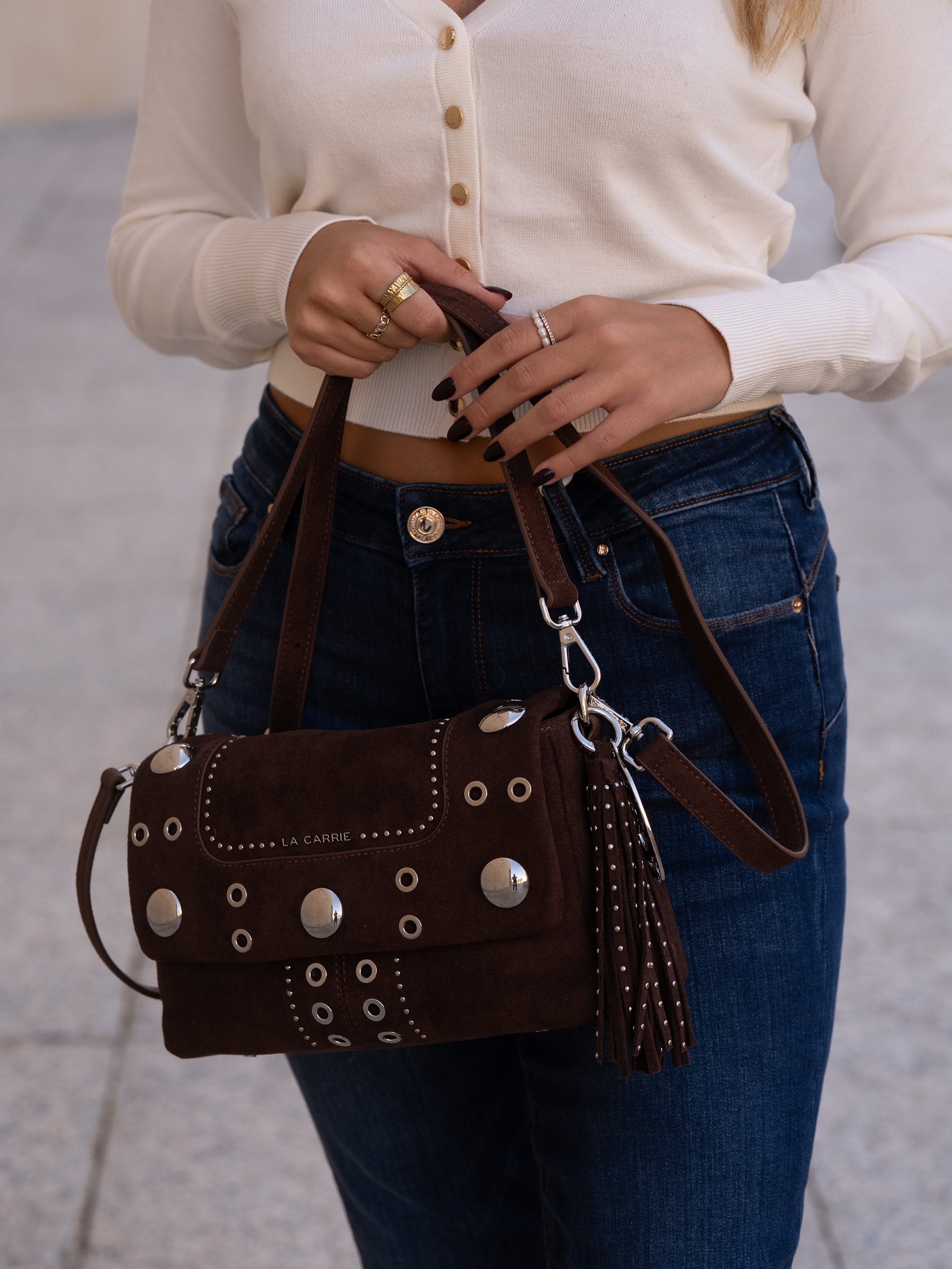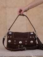 Suede shoulder bag with eyelets and silver studs, removable handle and shoulder strap