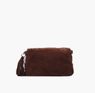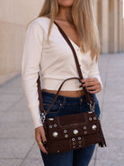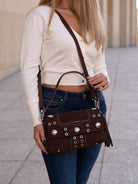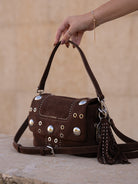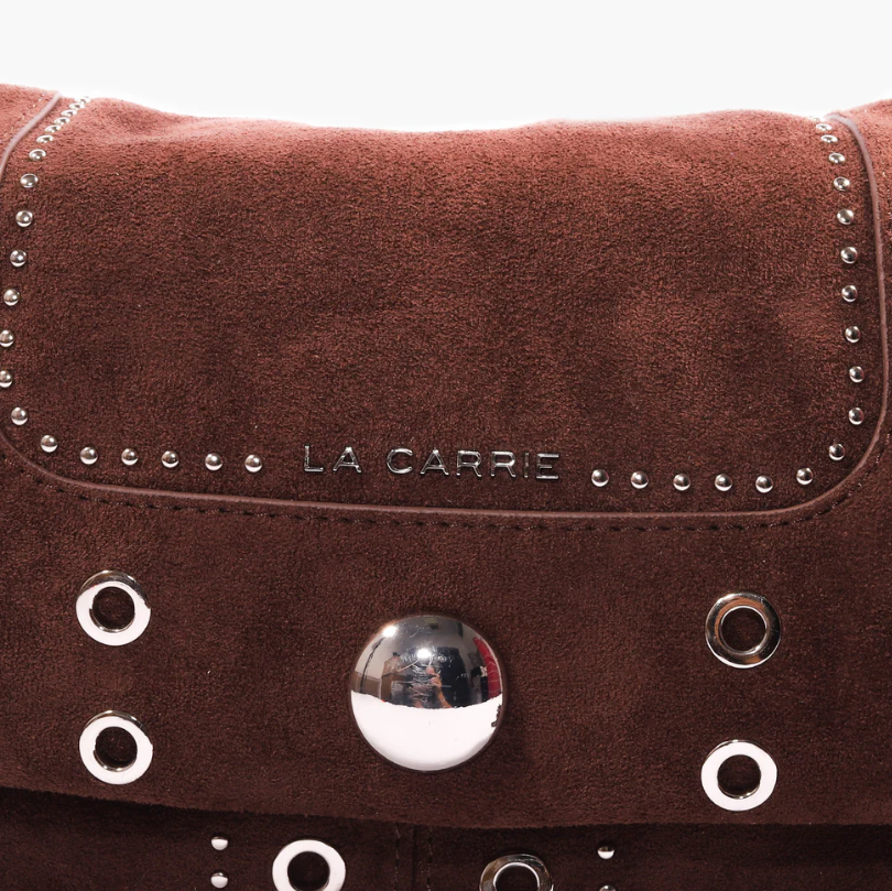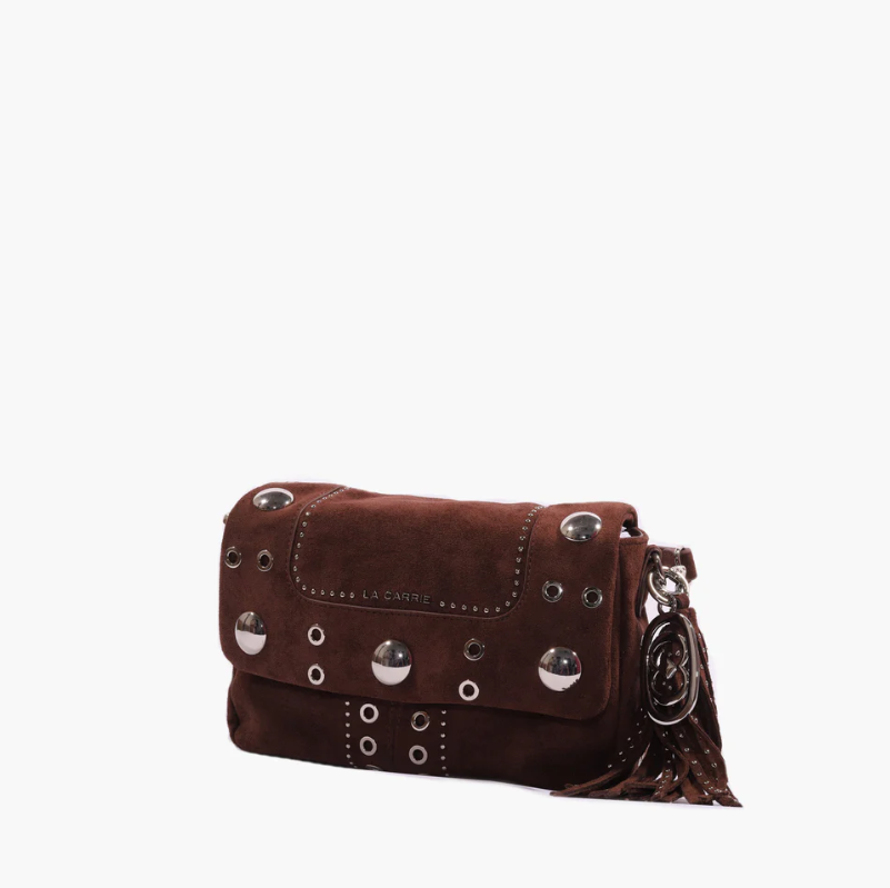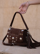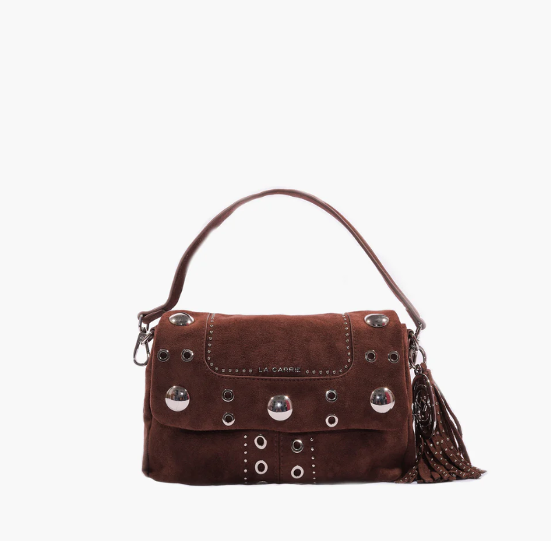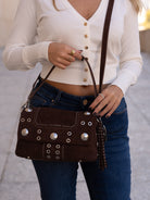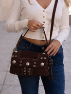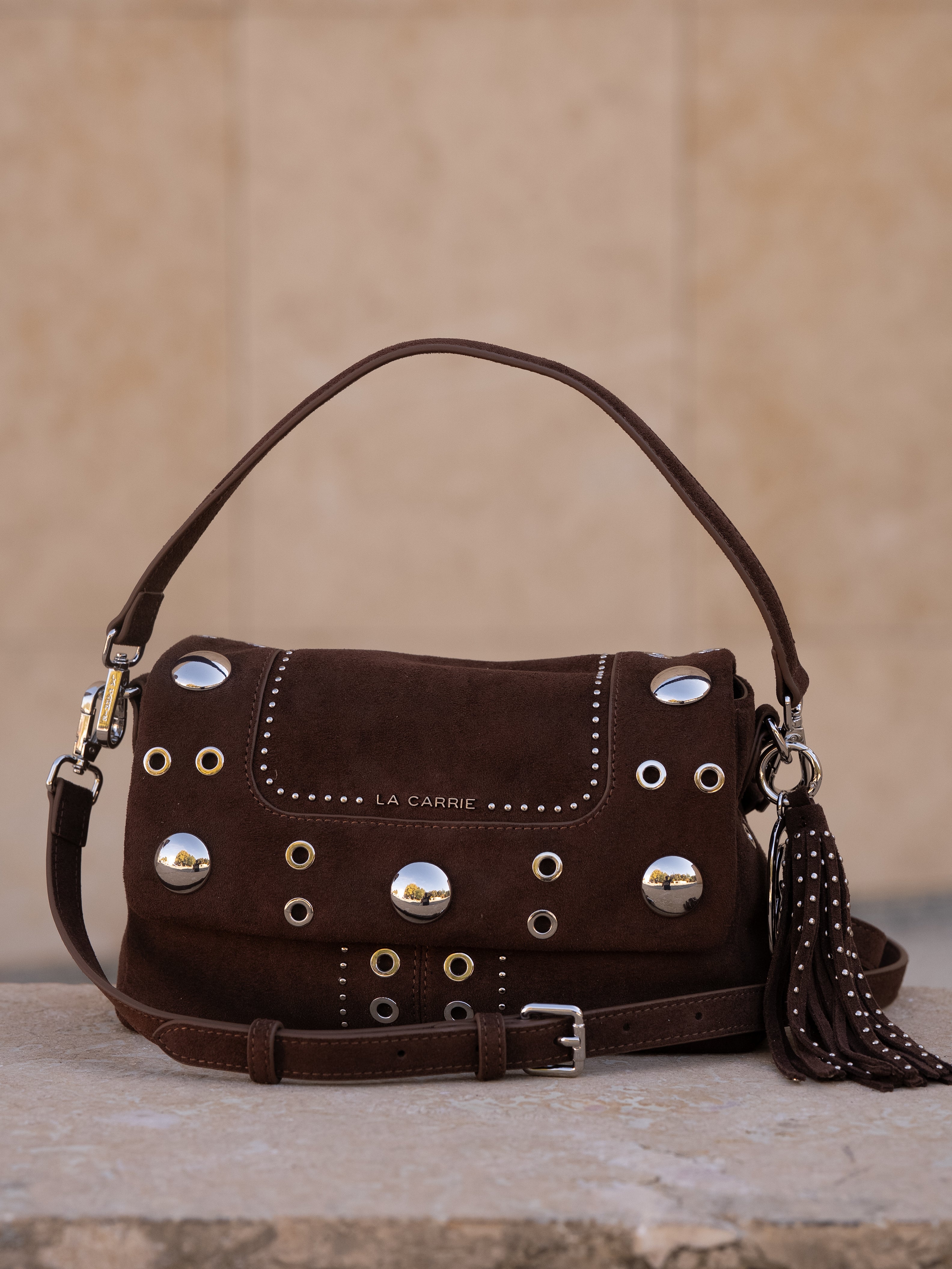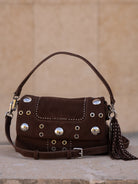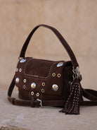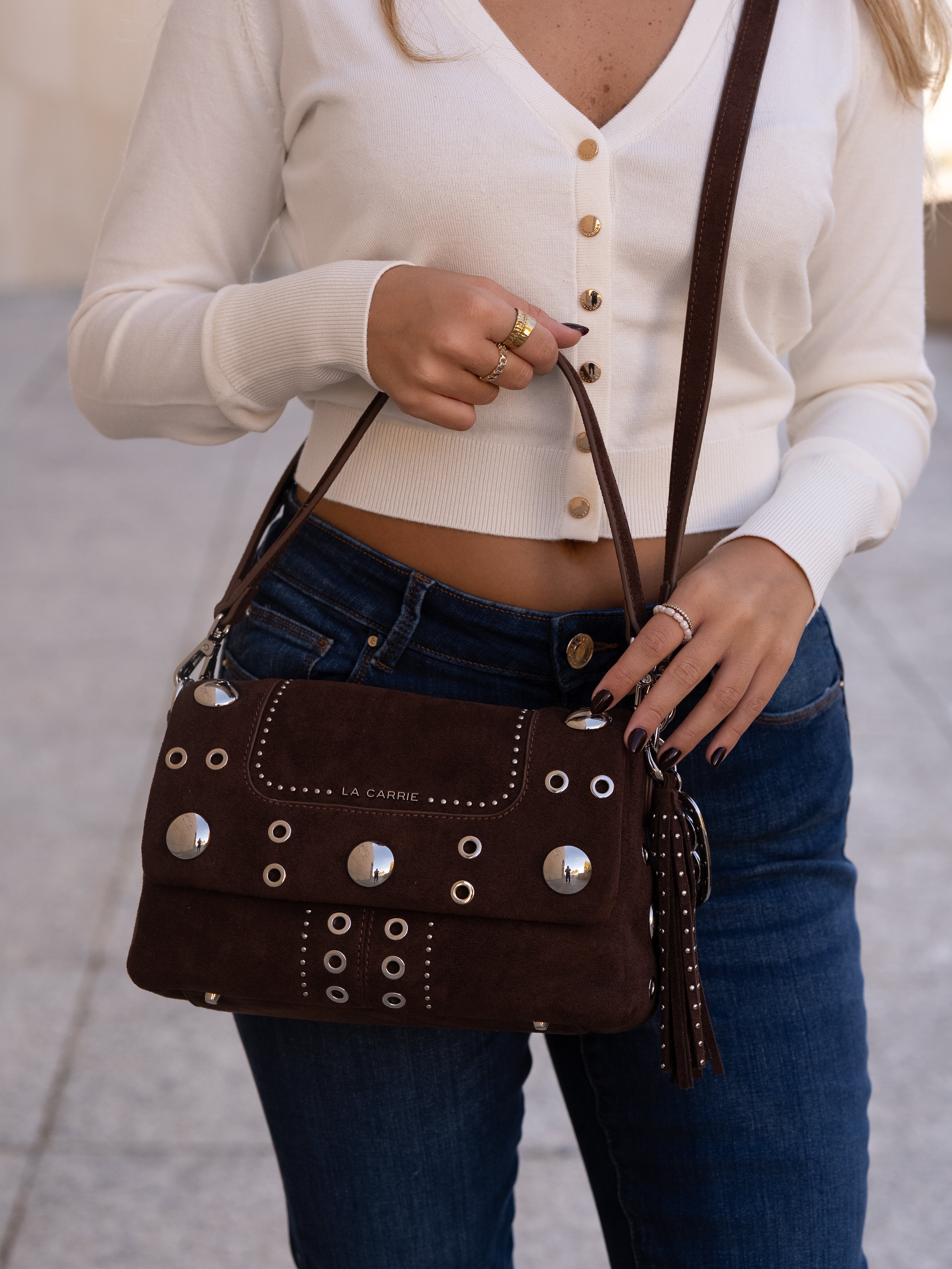 Suede shoulder bag with eyelets and silver studs, removable handle and shoulder strap