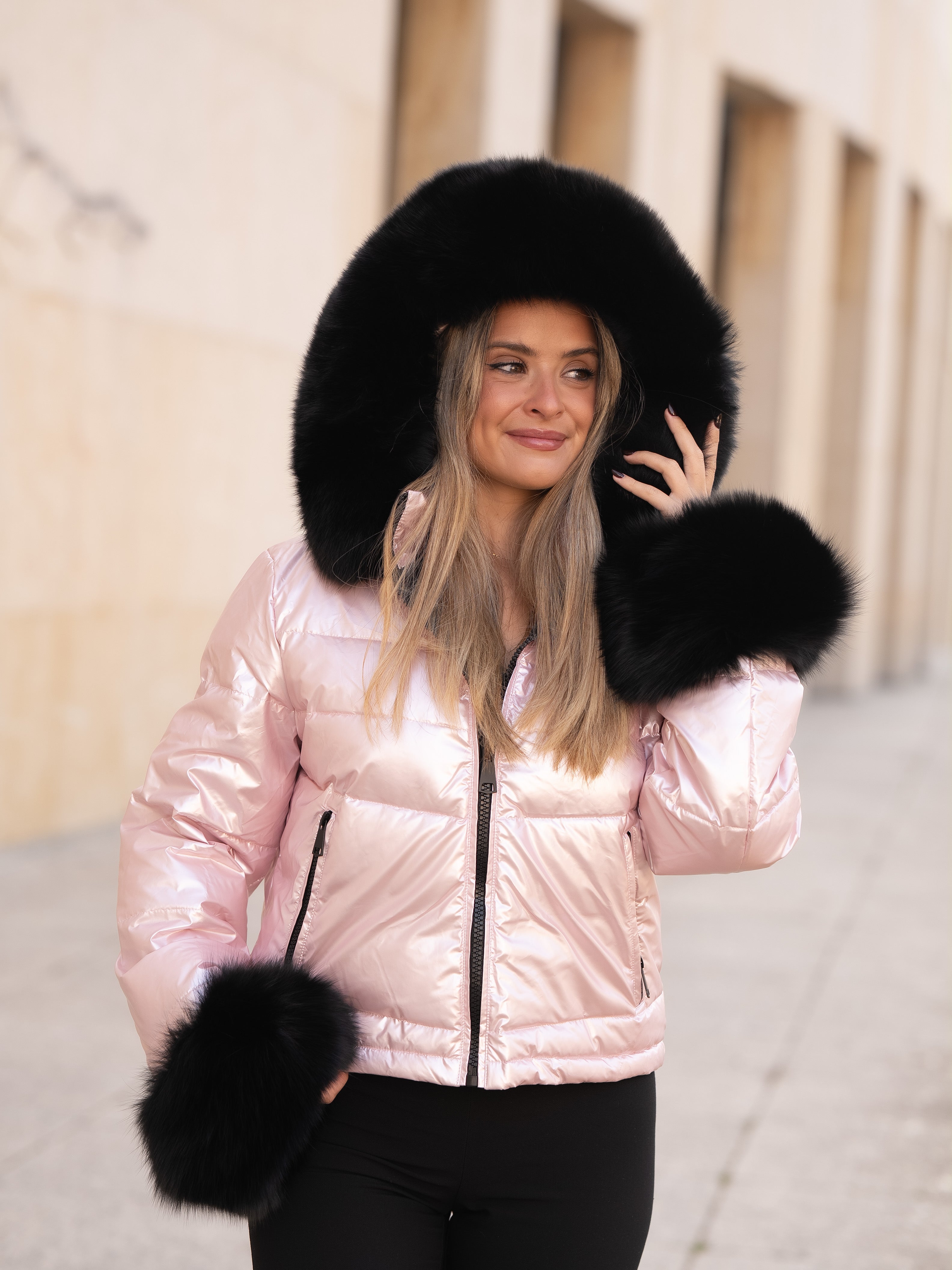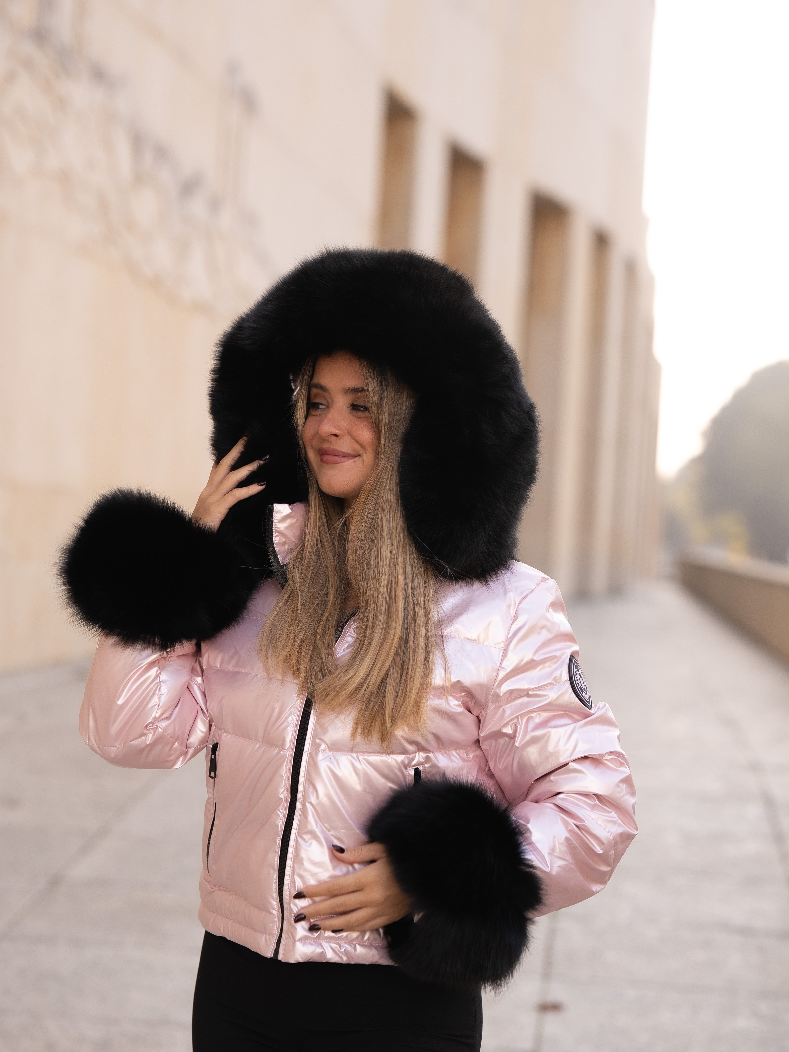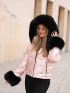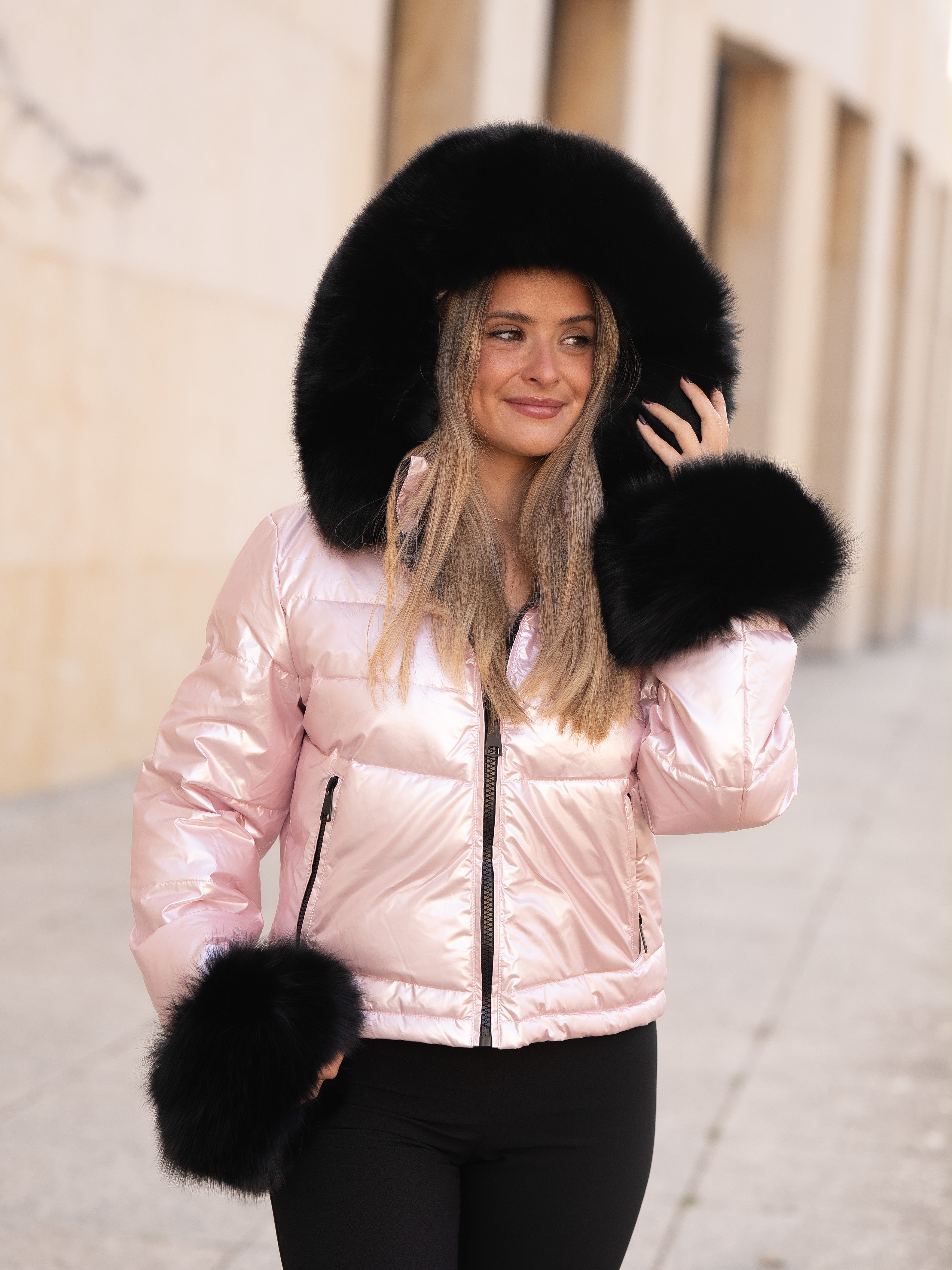 Pink coat with black fur