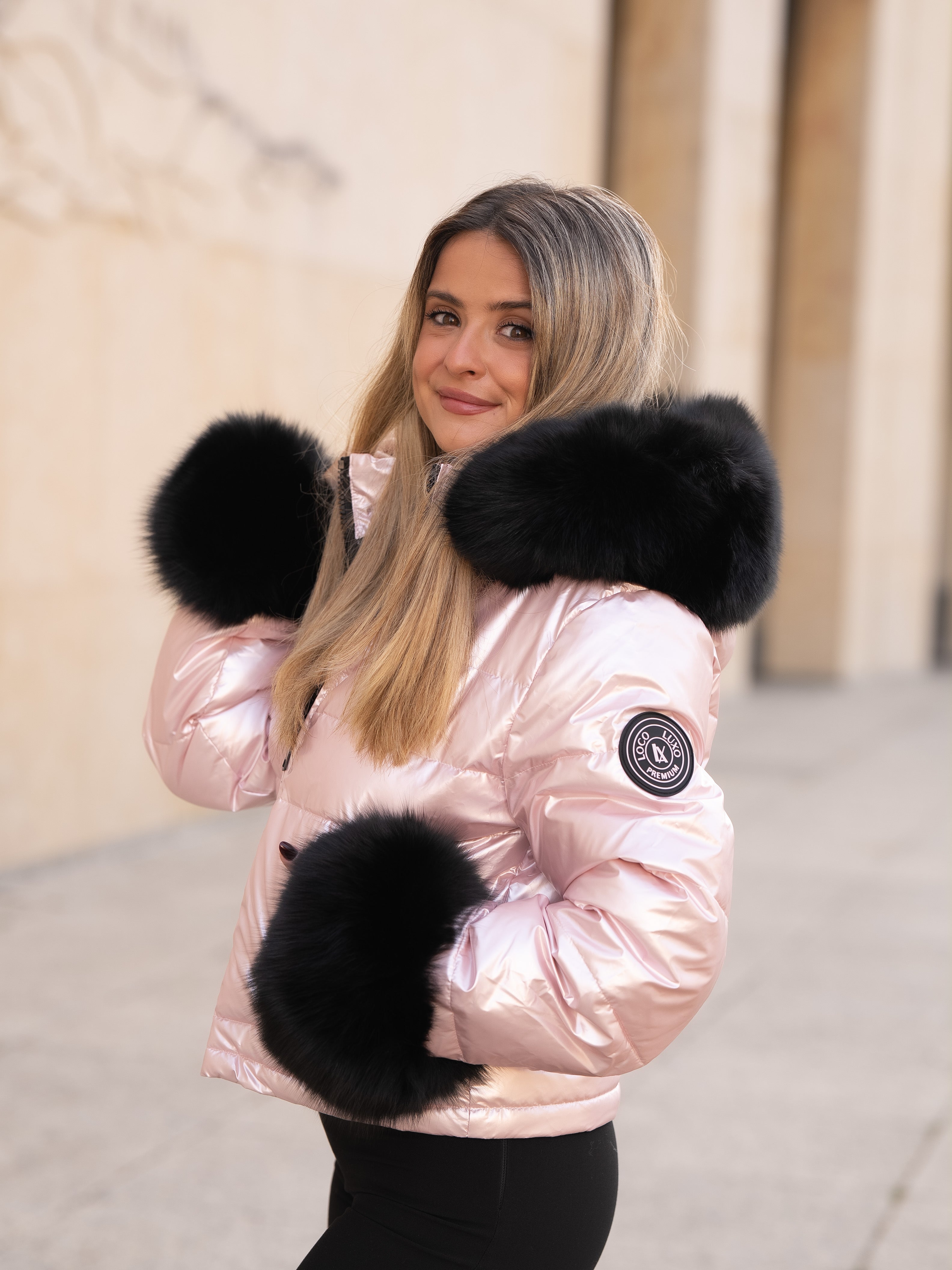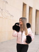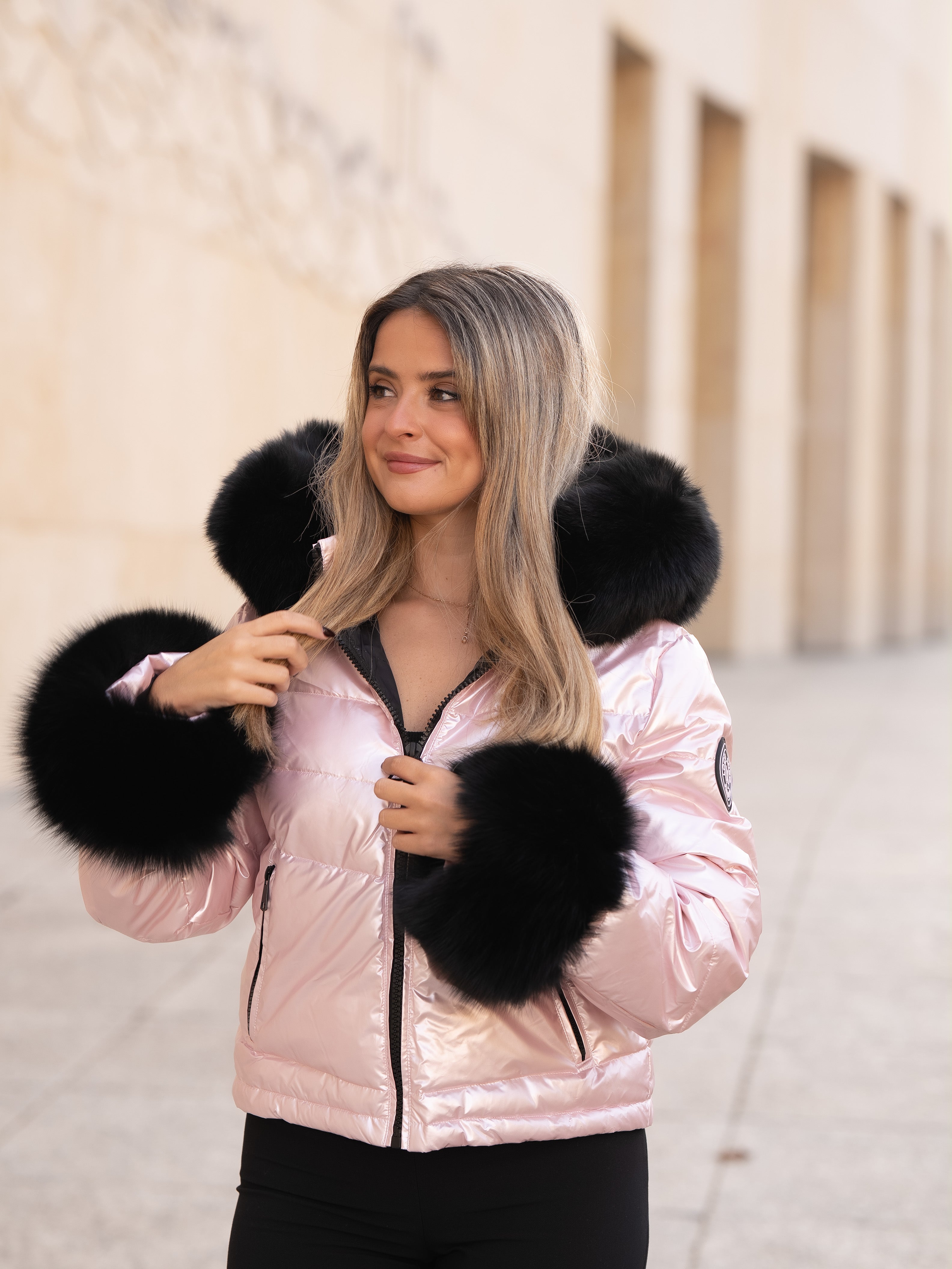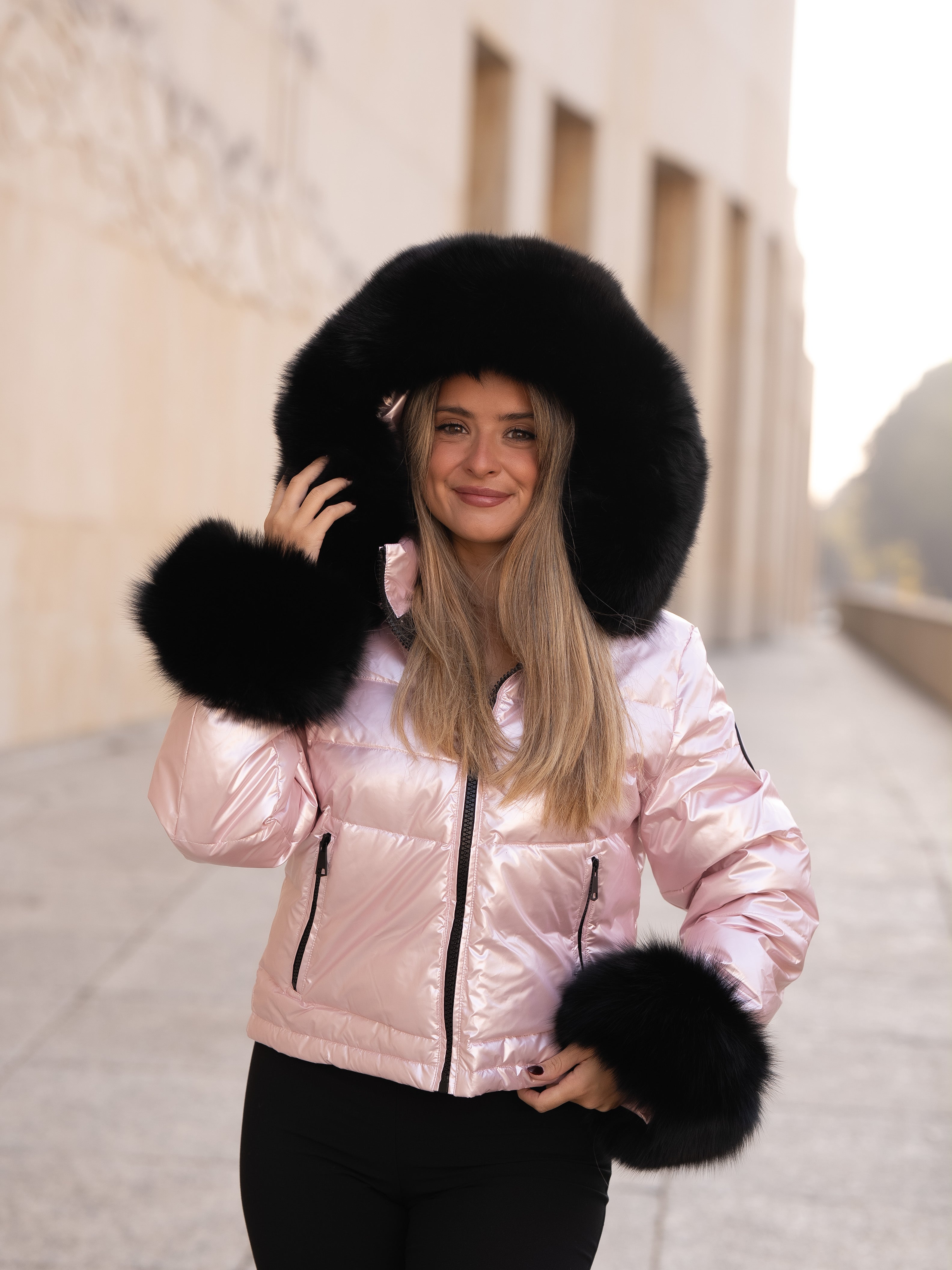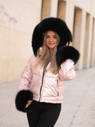 Pink coat with black fur