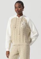 Sweater over fit with knitted details with plaits. Hood with coulisse, logo with shiny stones and long sleeves