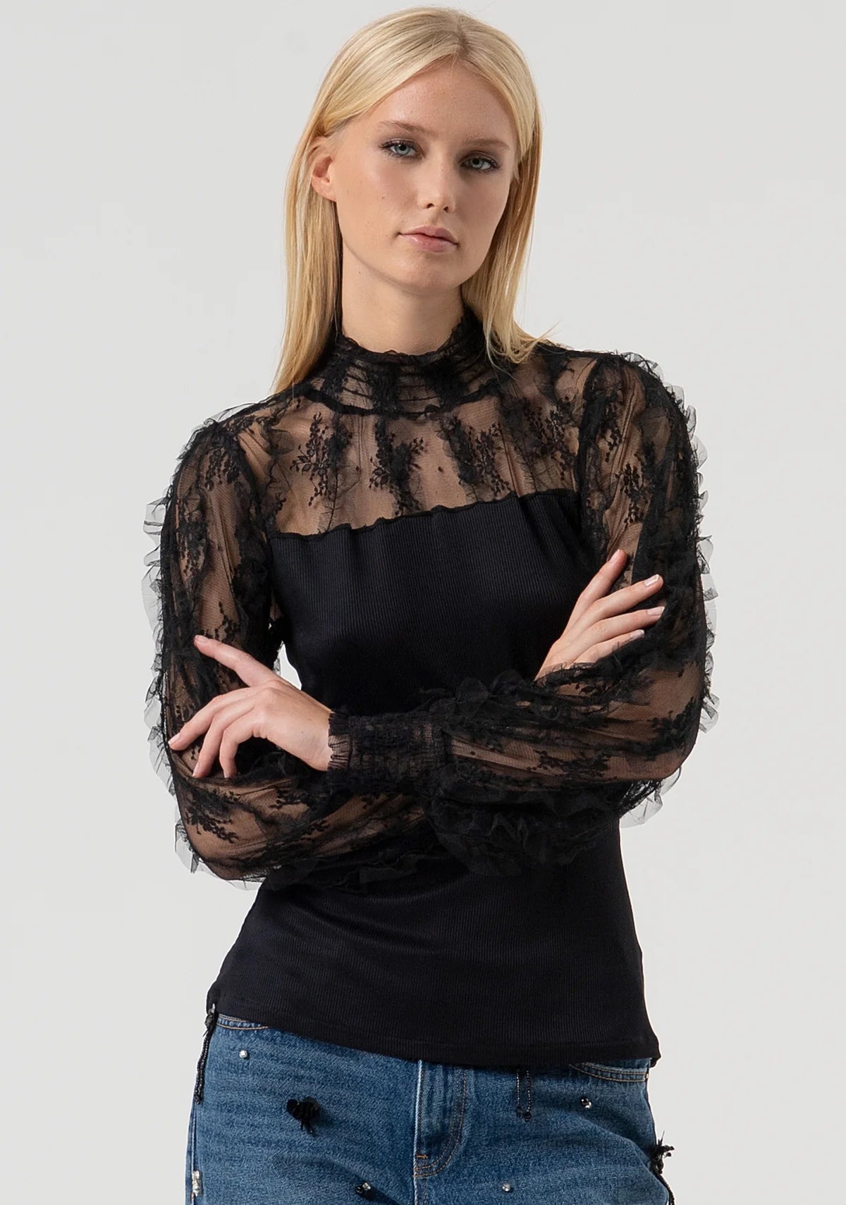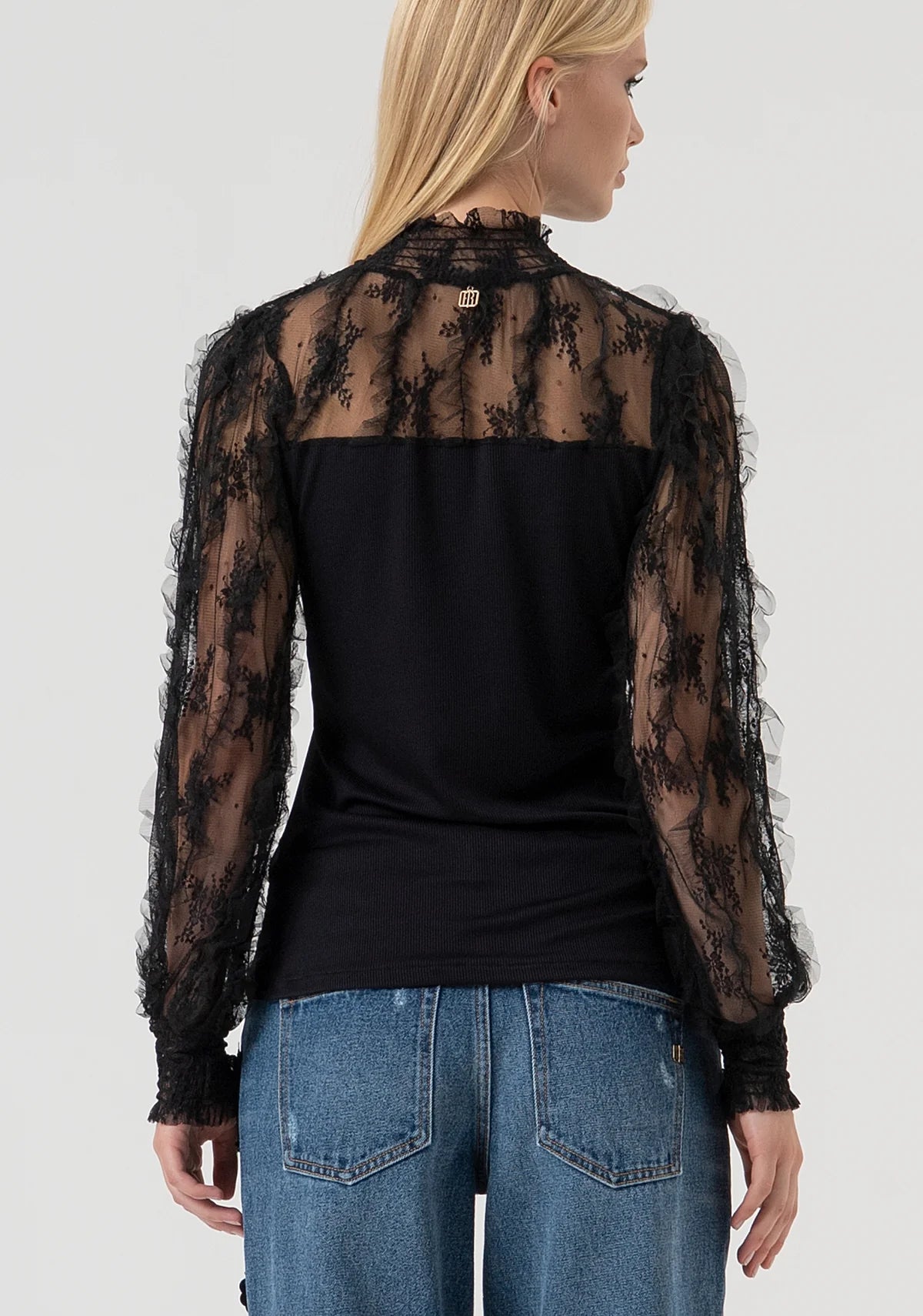 Blouse slim fit with lace details. High neck and long puffball sleeves