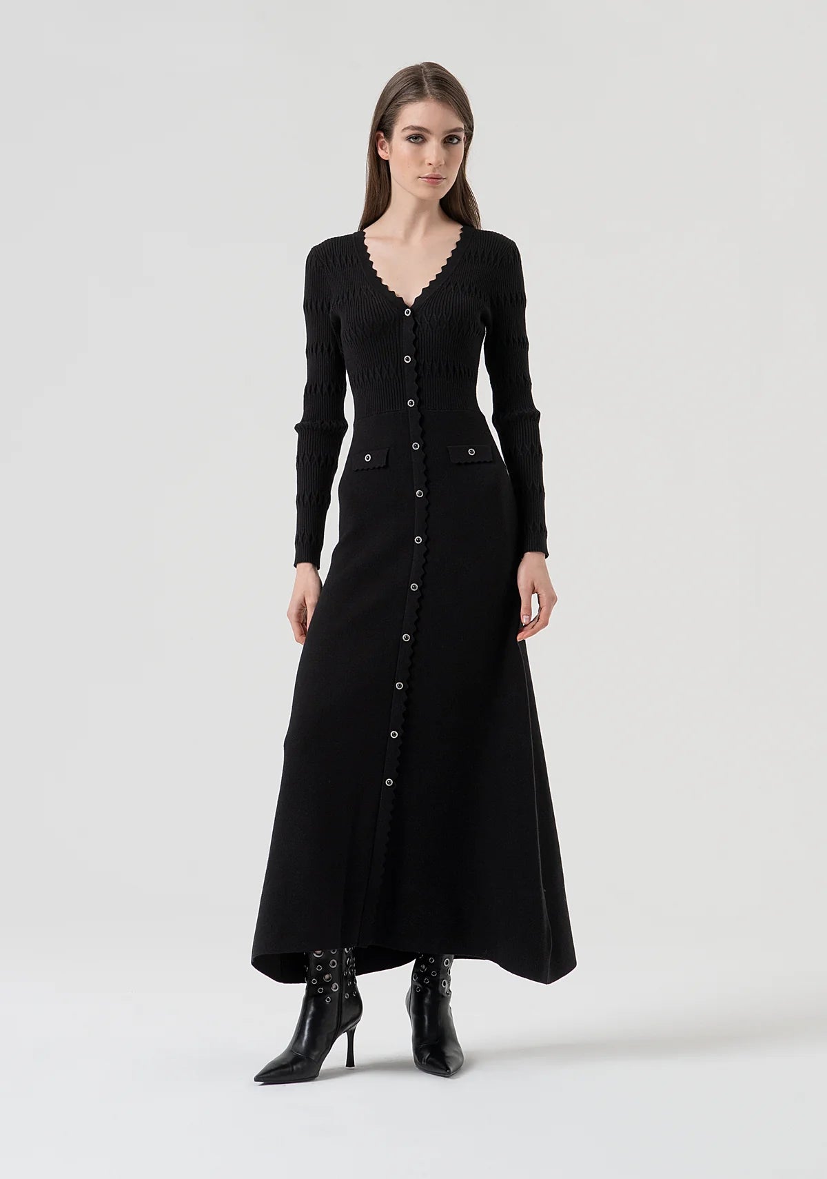 Long knitted dress slim fit. V-neck drop, small buttons on the front, flared skirt and long sleeves
