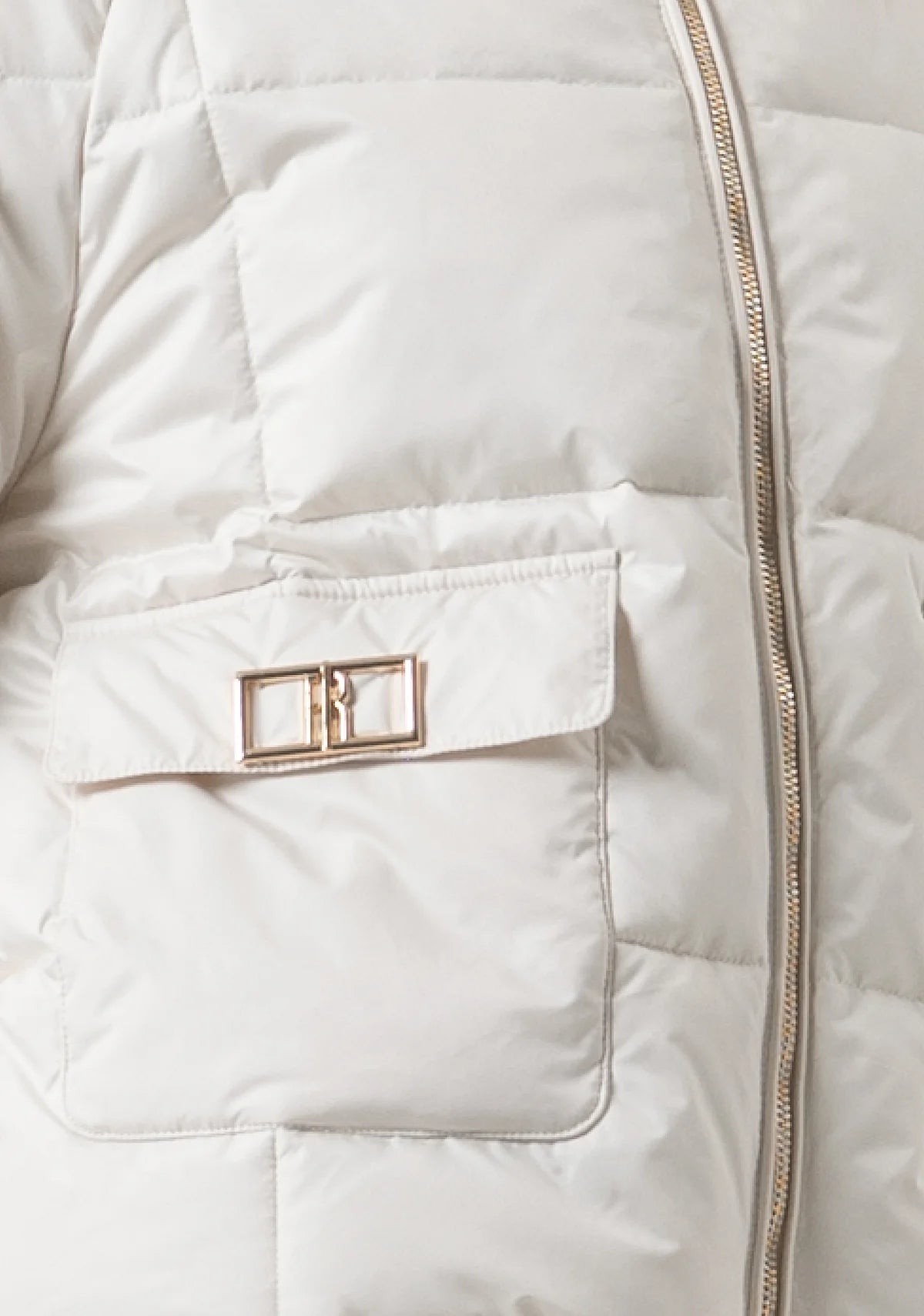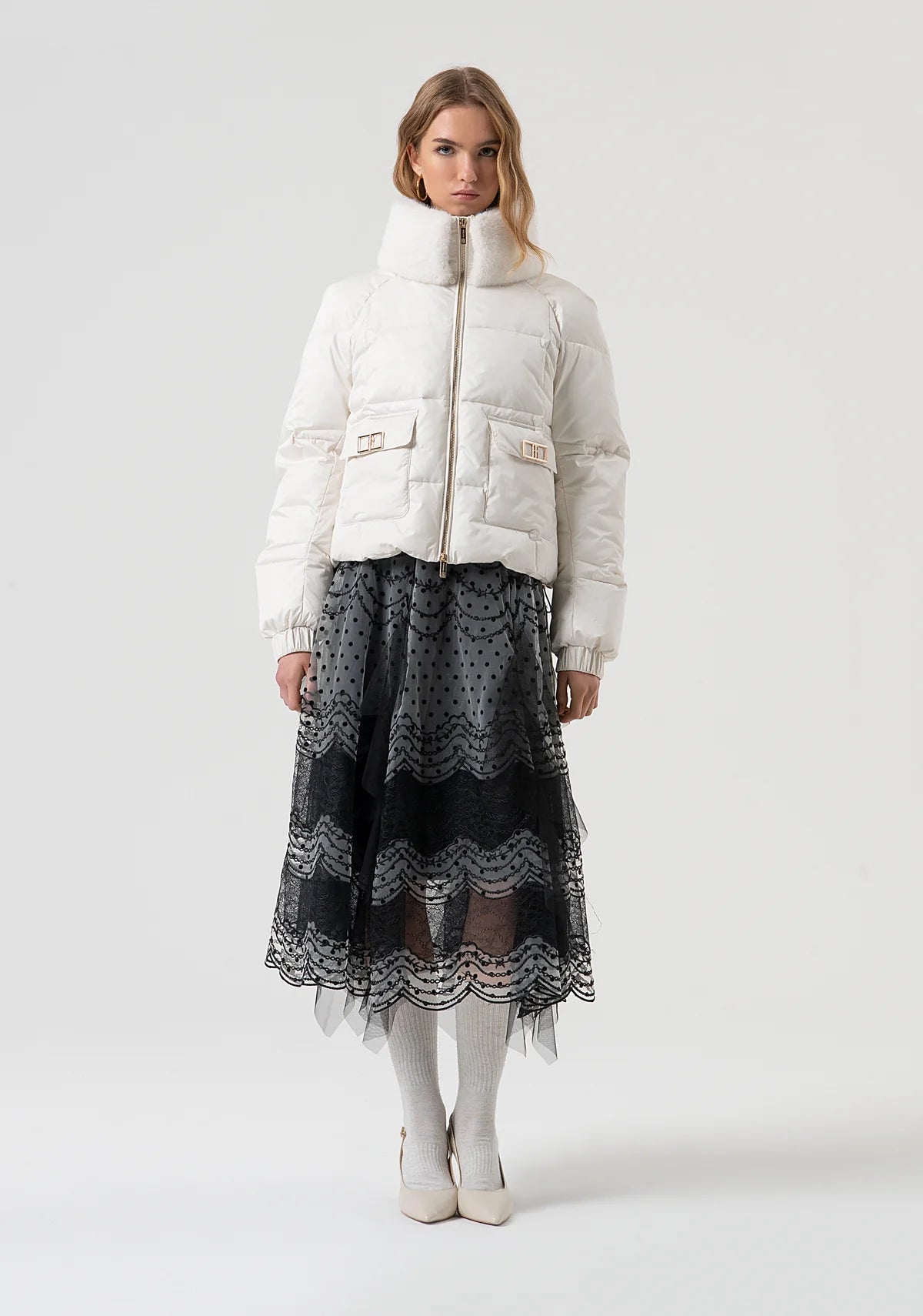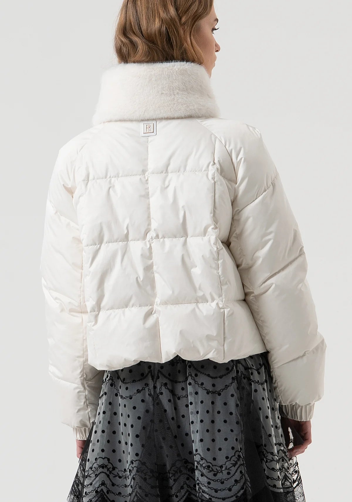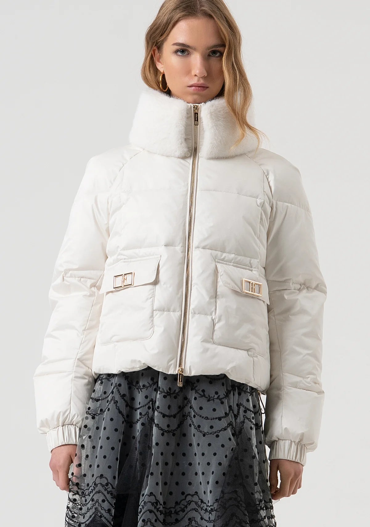 Padded jacket over fit with central zip for opening. High neck with fake fur neck, patch pockets with metallic logo and long sleeves