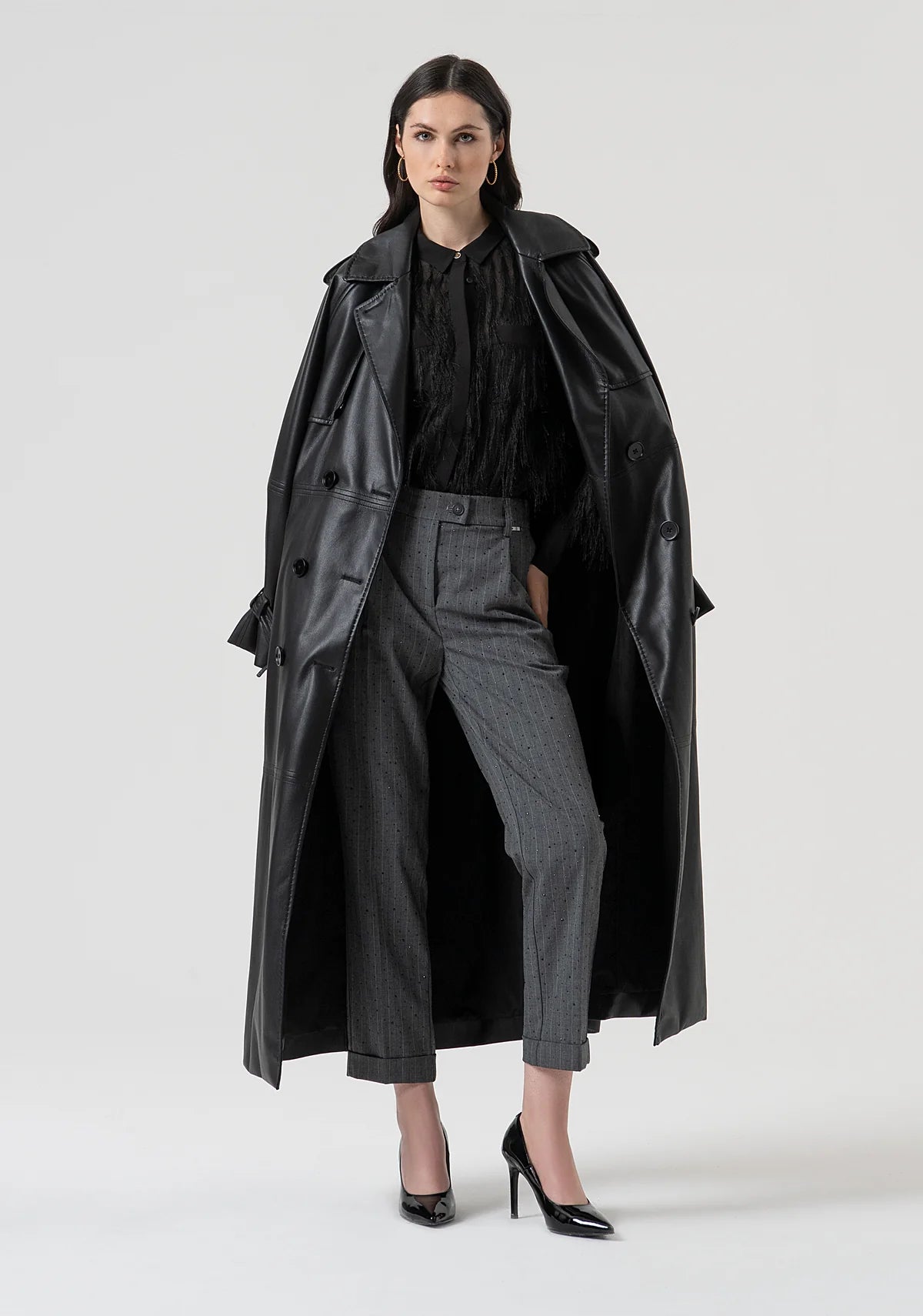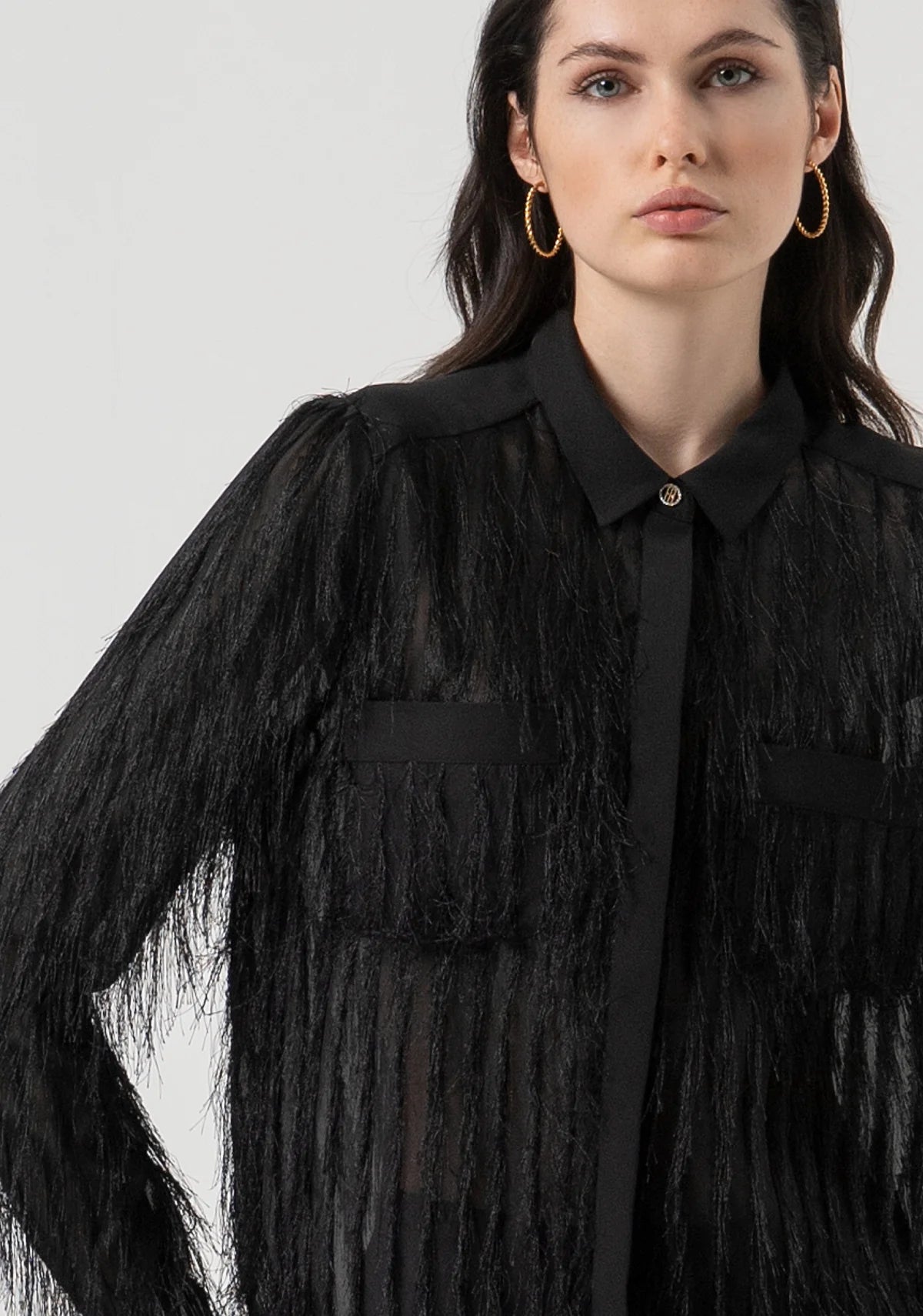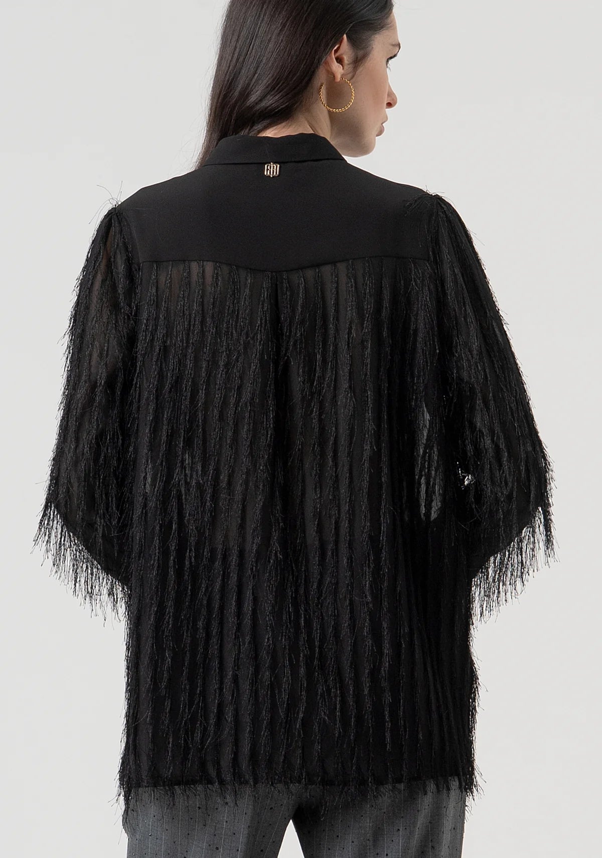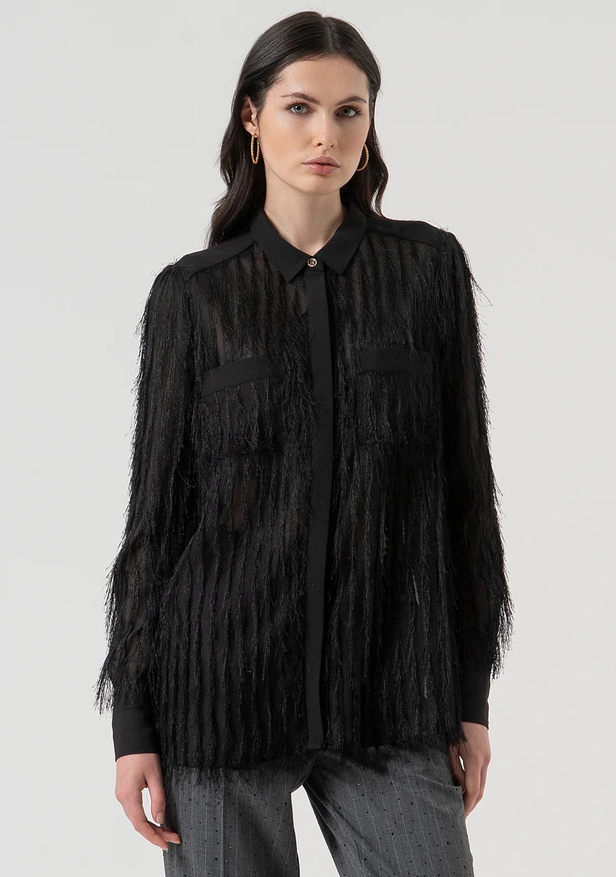 Shirt regular fit with fringes. Classic cut neck, hidden central buttons, pockets at the chest and long sleeves