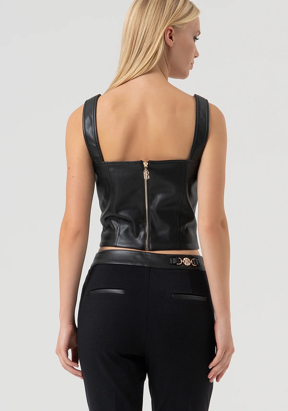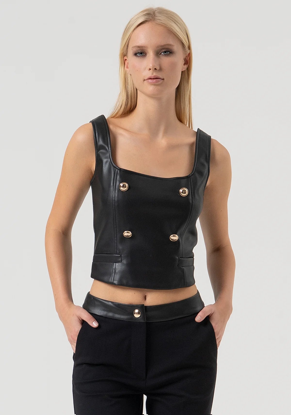 Tank top slim fit made in fake leather. Square shaped neck drop, braces, decorative buttons and zip on the back for opening