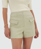 Must-have! The JOSH V Denise women’s shorts in Dusty Green are part of a stunning co-ord set. These shorts can be paired with the matching Lola blazer for a complete look. In addition to the Lola blazer, the green shorts also combine beautifully with the Lexx blouse or the Rosina T-shirt. The light green shorts are made from a comfortable quality with recycled polyester and Livaeco viscose. The shorts sit high at the waist and have a regular fit