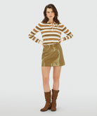 The JOSH V Esra women’s skort in the color Olive Green features a patent-look finish and stretch. The mini skirt has inner shorts that are not visible. The dark green high-waisted skirt is fully lined and closes with a branded gold-colored zipper at the back. Styling tip: pair the skort with a white blouse and the Grace ballerinas for a casual-chic look. On cooler days, the skort can be worn with tights and a sweater.