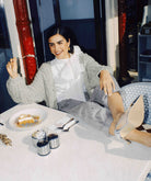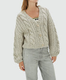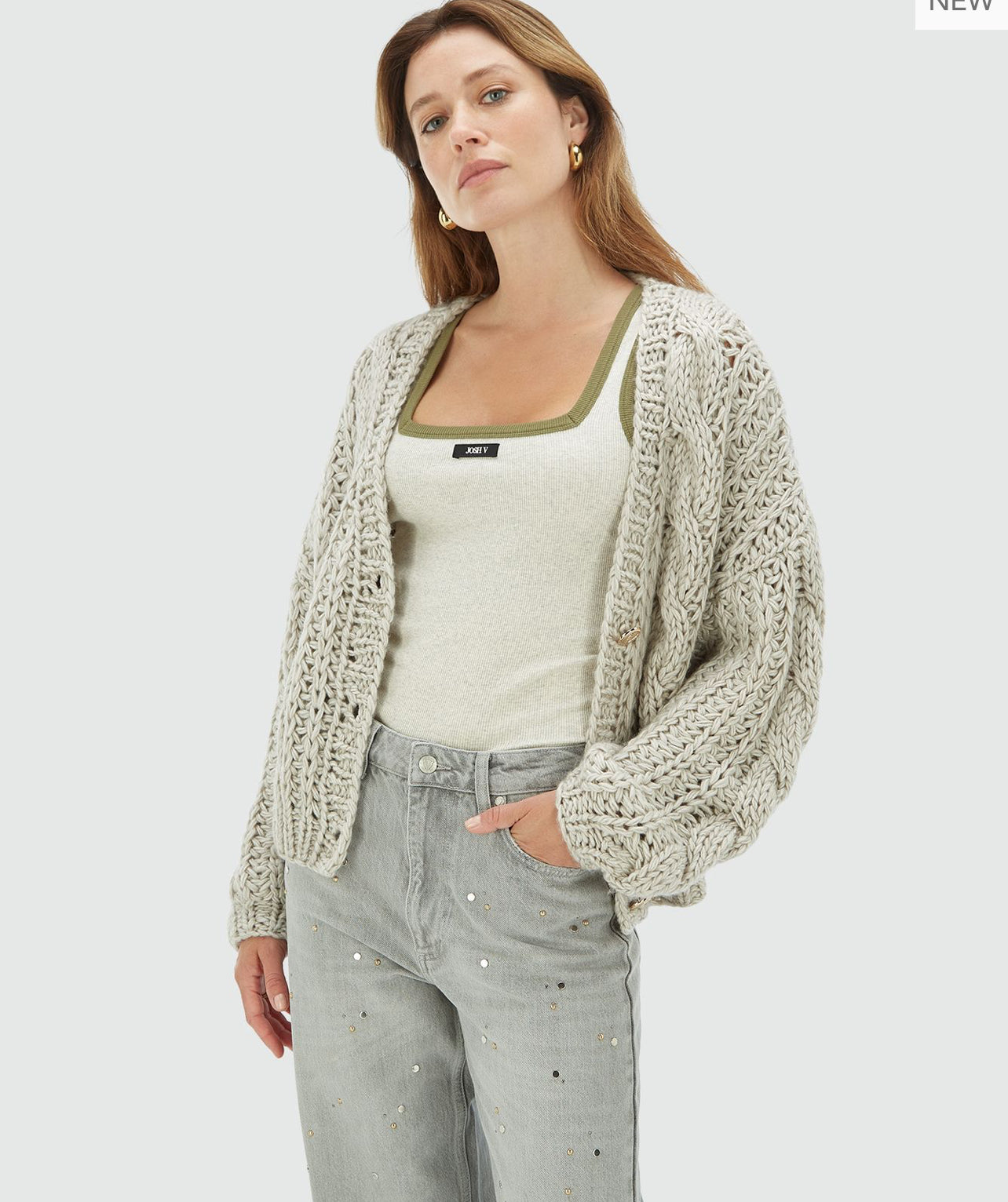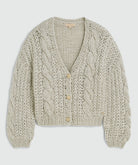 The JOSH V Fayenne cardigan in Warm Grey Melange is an oversized chunky knit for the fall/winter season. The cardigan is detailed with gold-colored JOSH V branded buttons and balloon sleeves. Styling tip: wear the grey knitted cardigan with a skirt and boots for a bold yet feminine look that transitions perfectly from day to night.