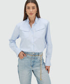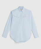 The JOSH V Lois blouse in the color Fresh Blue features removable shoulder pads (via snap buttons) and an oversized fit. The oversized blouse is made of oxford fabric with recycled polyester and cotton sourced via Better Cotton. A unique detail is the “Thanks, it’s JOSH V” label on the bottom hem and inside the button placket. Pair this light blue blouse with jeans or a skirt for both casual and chic occasions.