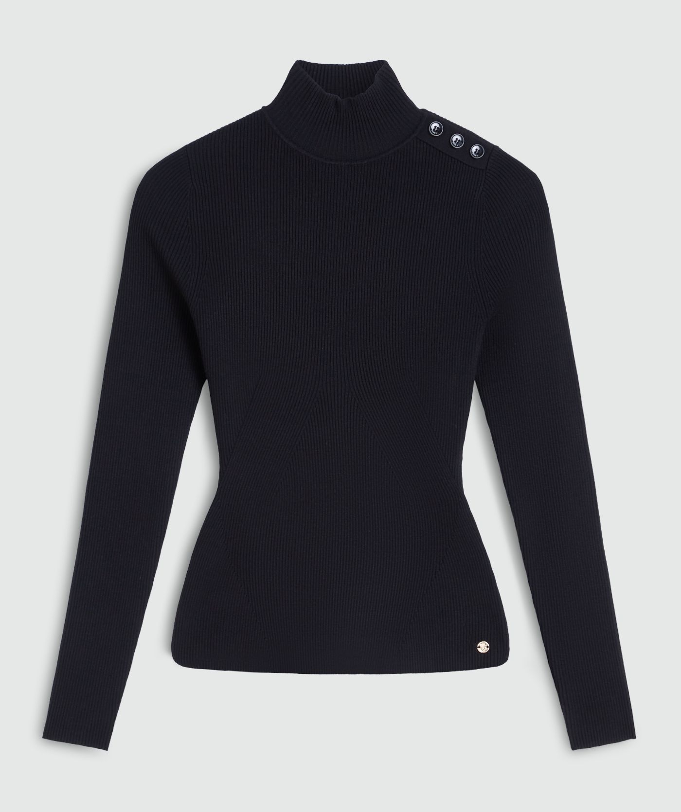 The JOSH V Loua women’s top in the color Black is a black turtleneck featuring non-functional JOSH V branded buttons on the shoulder. It is made from stretchy ribbed fabric with LENZING™ ECOVERO™ viscose. This top is a wardrobe essential for the autumn and winter seasons. Style tip: Pair the Loua top with high-waisted trousers and heels for an elegant, feminine look. For a more casual style, wear it with mom jeans and sneakers.