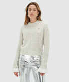 The JOSH V Maya women’s sweater in Grey Melange is a stylish and comfortable addition to your wardrobe. This regular fit sweater is crafted from a high-quality blend of fine merino wool, nylon, kid alpaca, and elastane, providing a soft touch and luxurious look. The sweater features a round neckline and a subtle JOSH V logo on the left chest. A standout detail is the detachable ruffle cuffs in cotton poplin, offering versatile styling options. Pair the sweater with jeans and sneakers for a relaxed look.