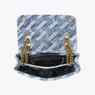The Kensington Soft is crafted from an acid wash denim in weave print. The antiqued brass Eagle head features crystals and black bead eyes on the front flap.