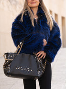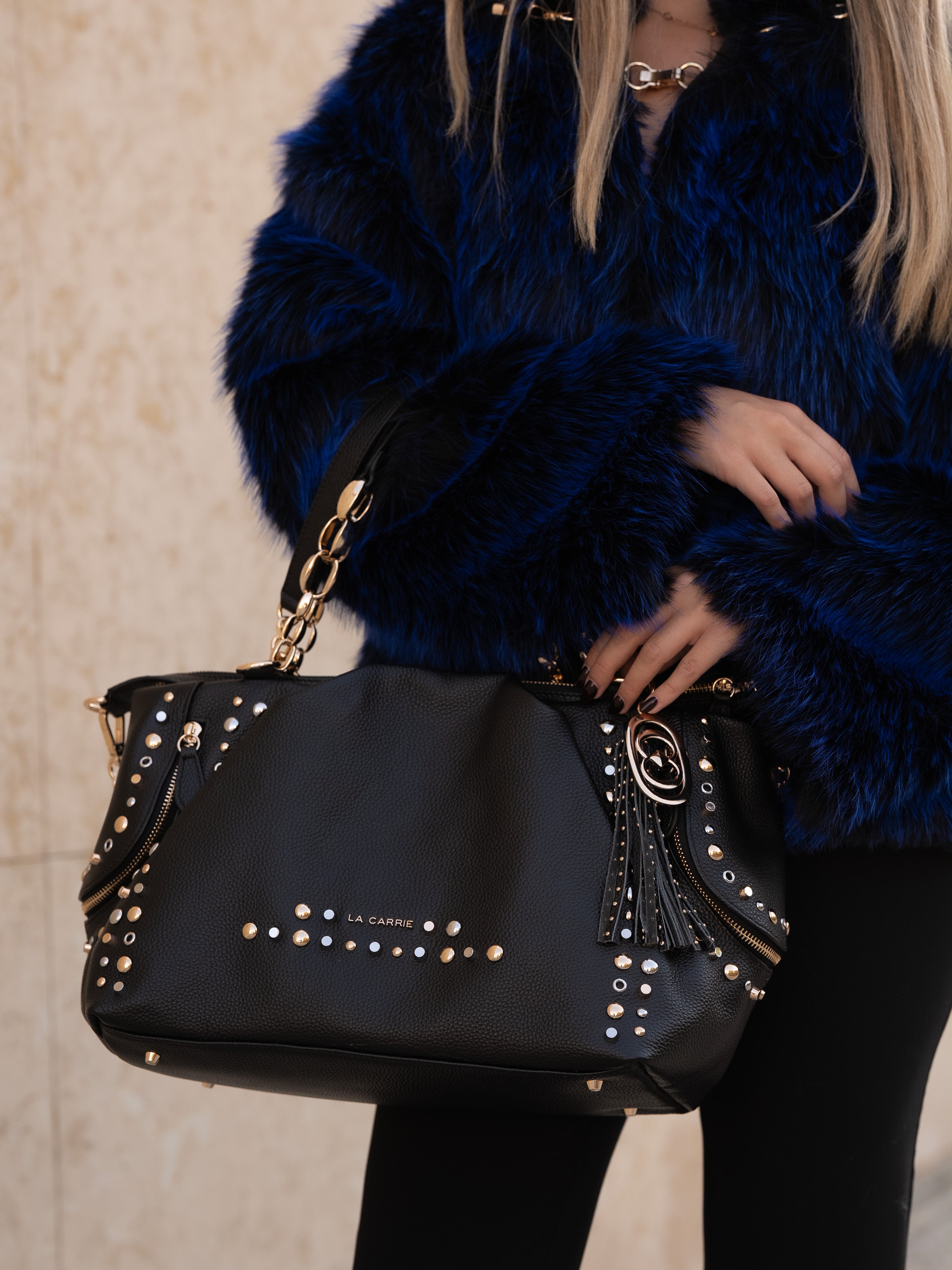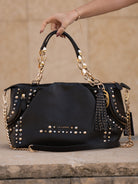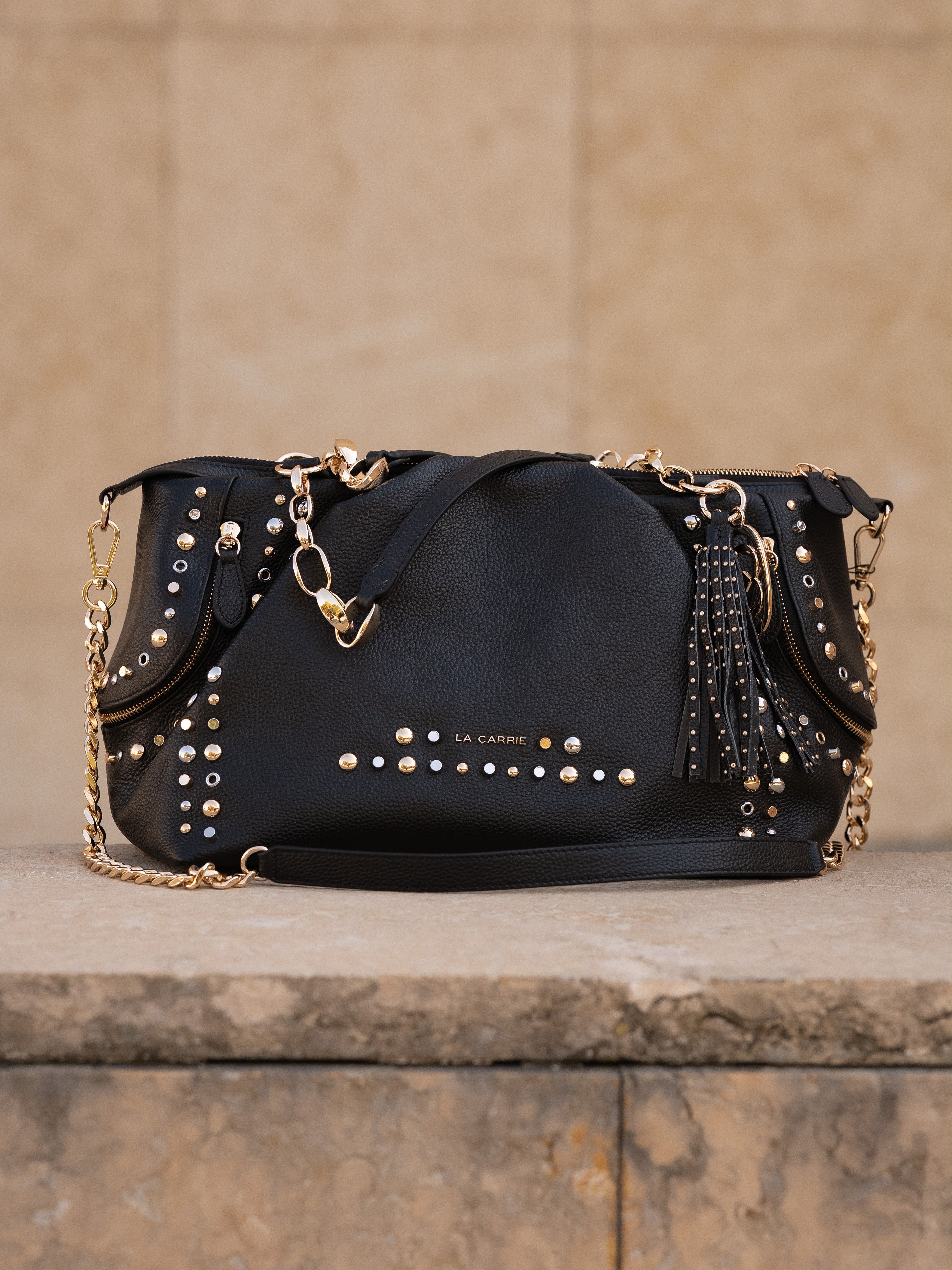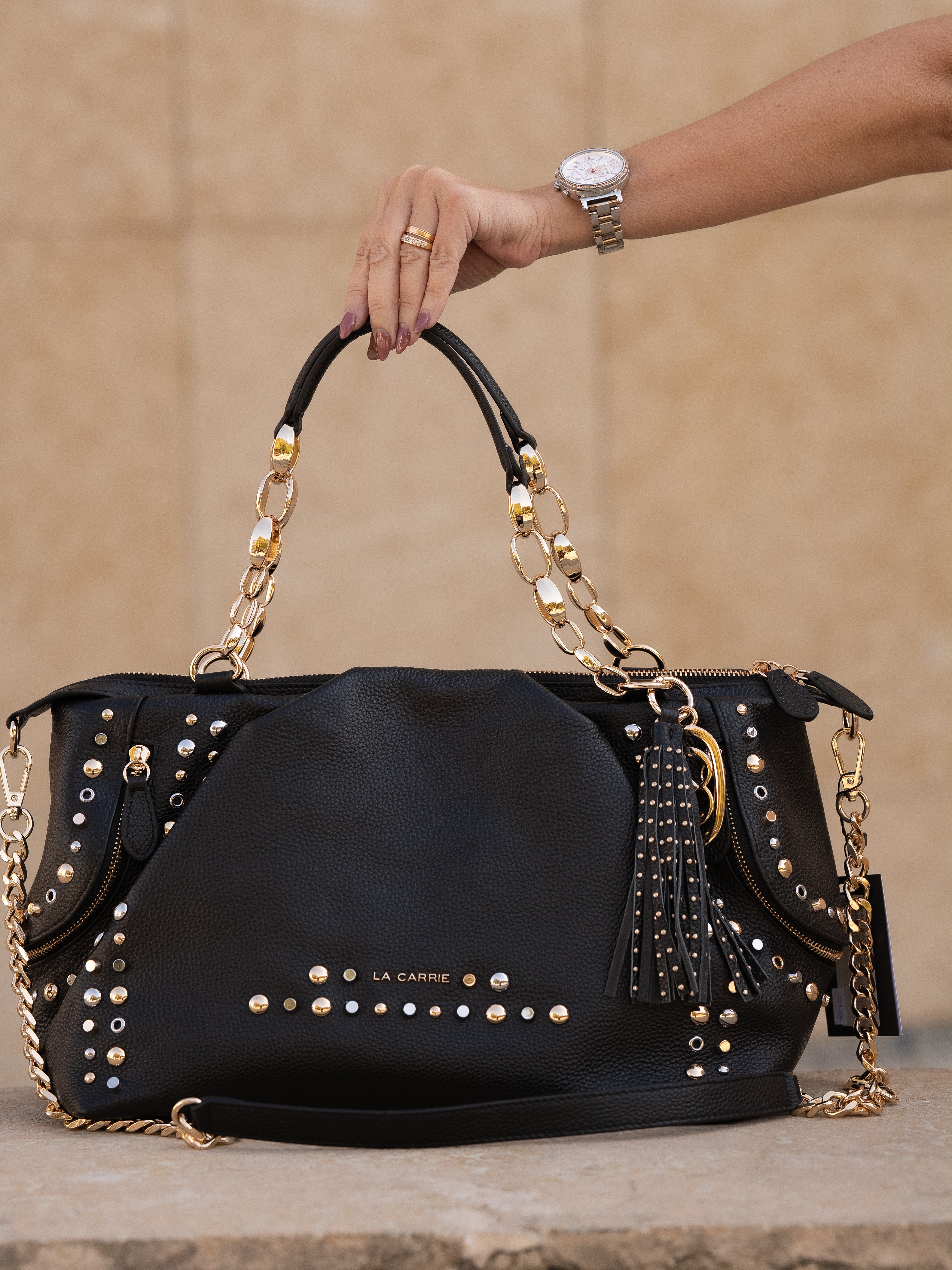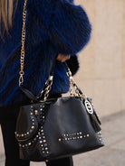 Hammered leather shopping bag with studs applied on the edges and chain handles, removable shoulder strap