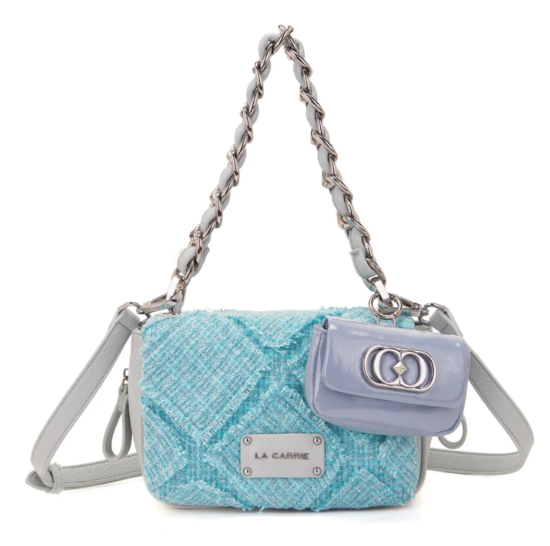 Canvas shoulder bag with diamond pattern and mini bag, chain handle inserted into canvas and removable shoulder strap with canvas mini bag