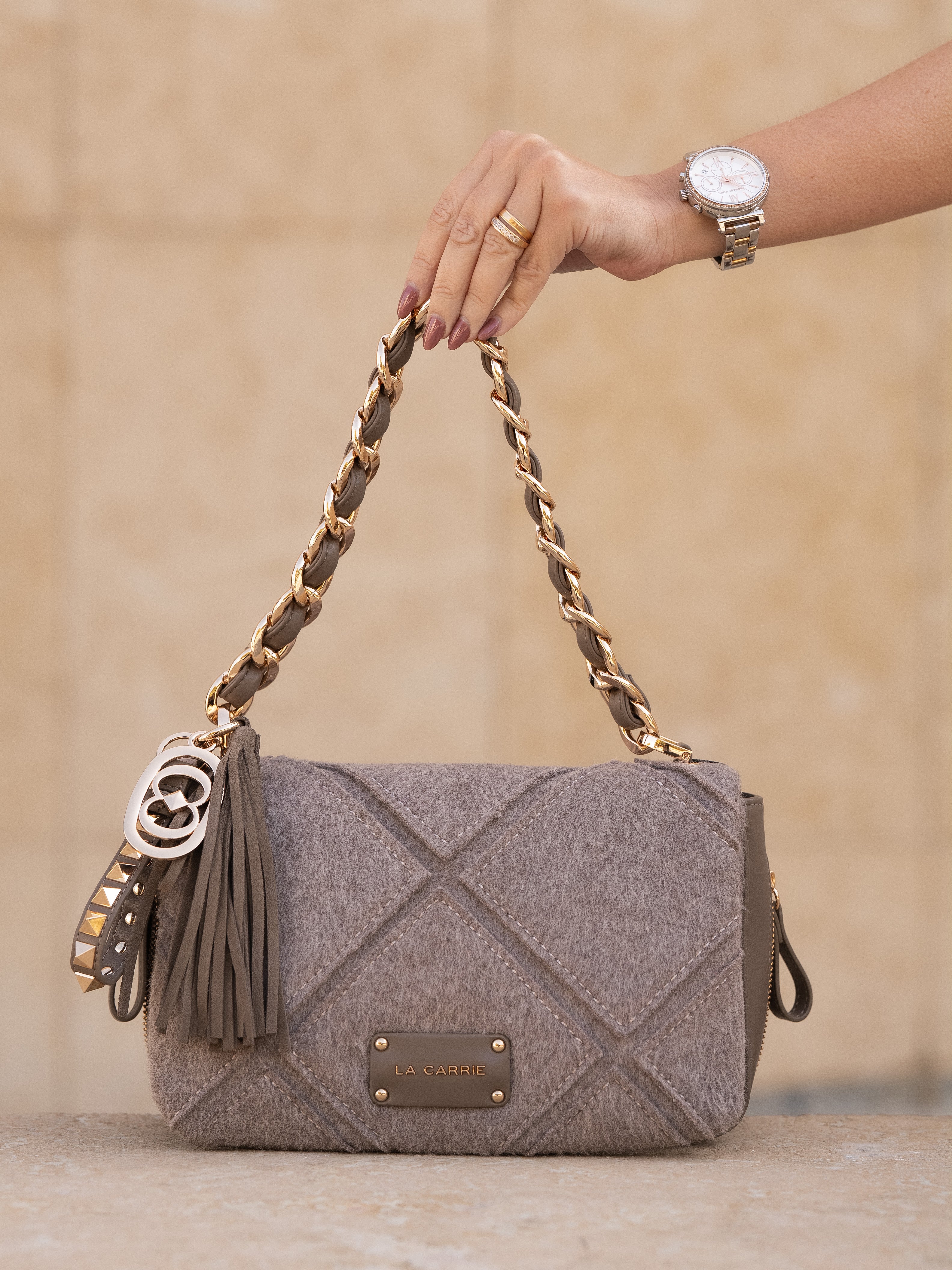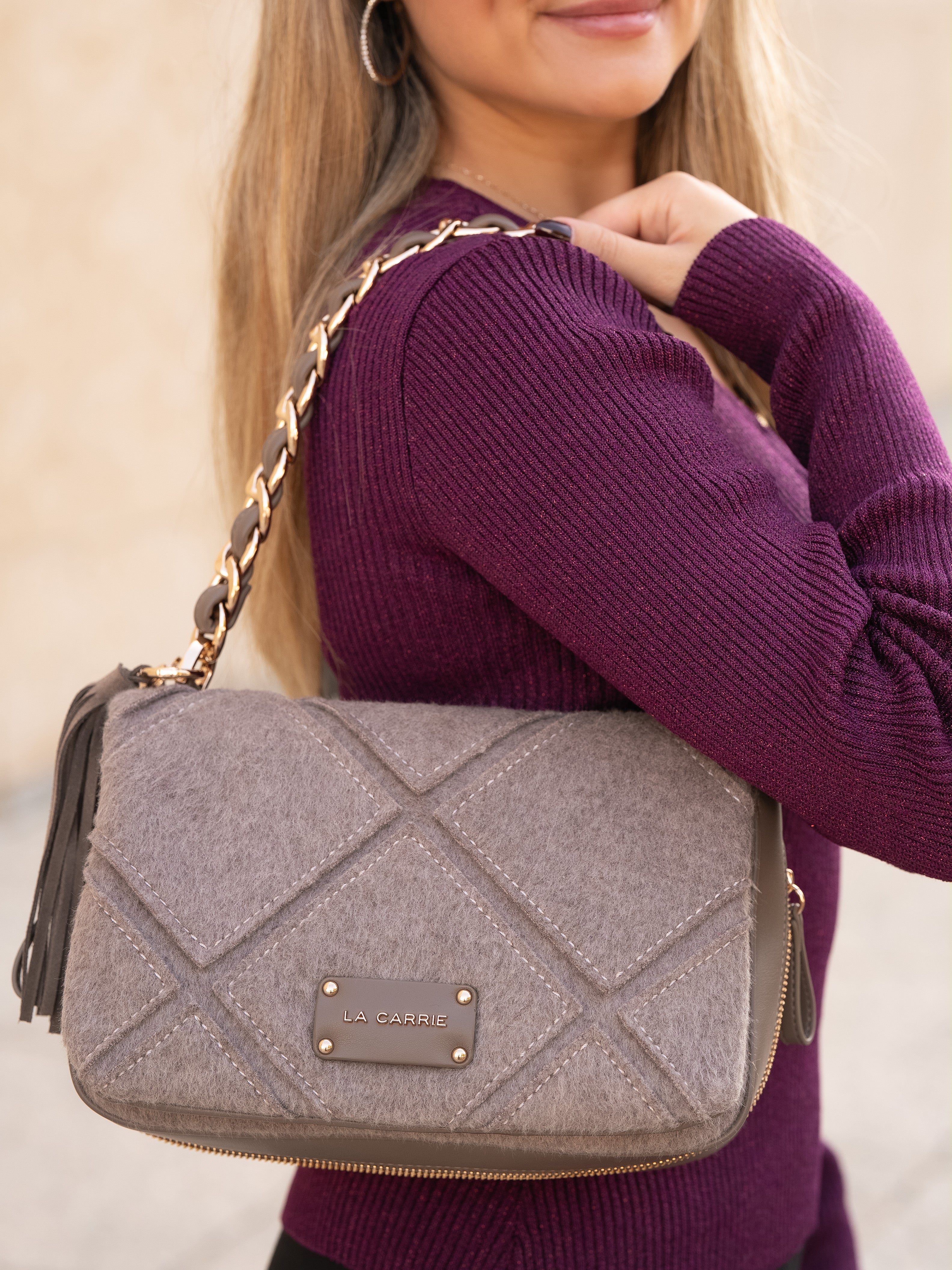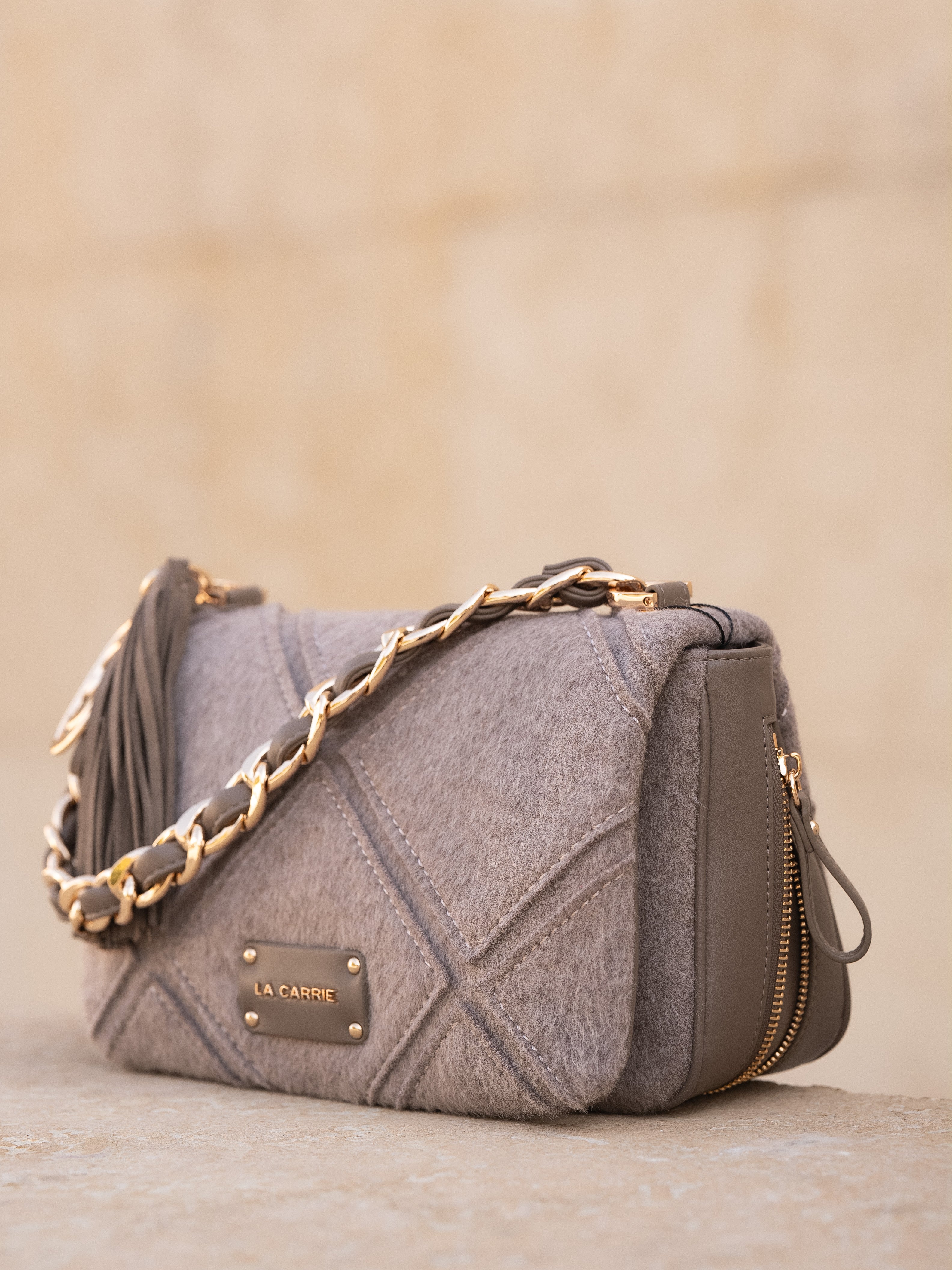 Shoulder bag in boiled wool with stitched diamond pattern, chain handle inserted in eco-leather and removable shoulder strap