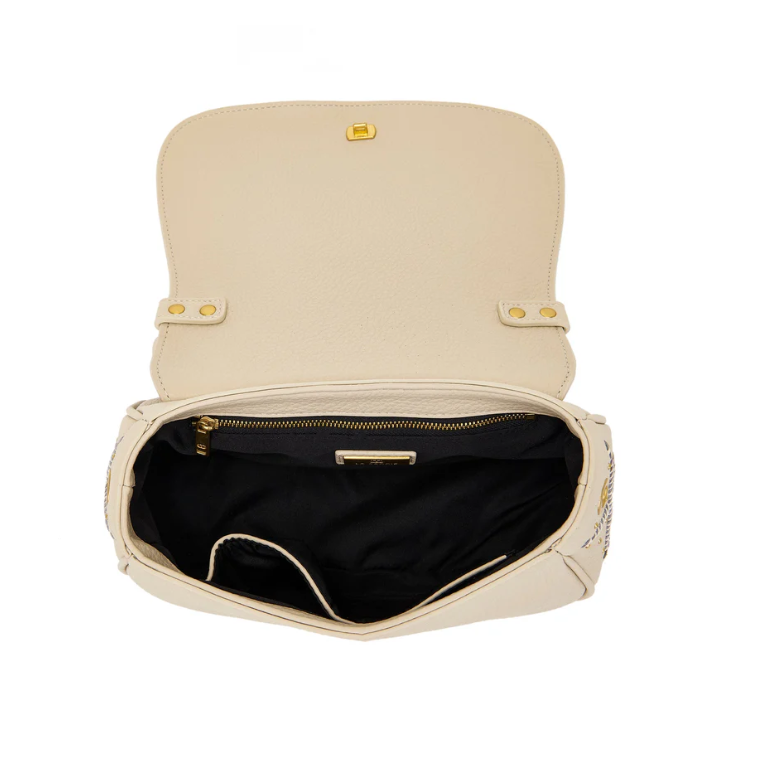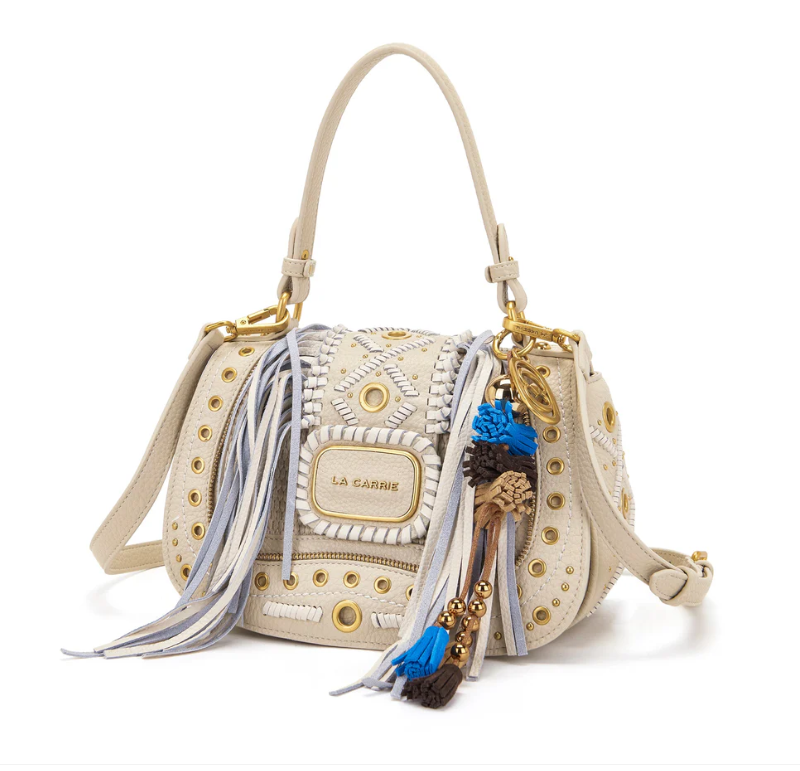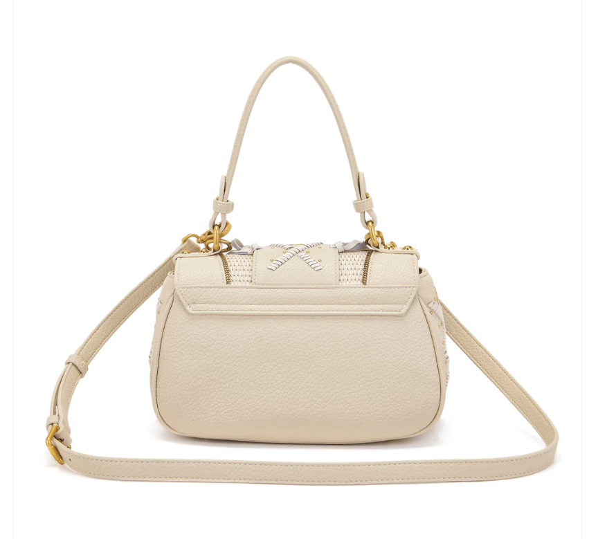 Hammered PU handbag with woven details and applied studs, removable shoulder strap