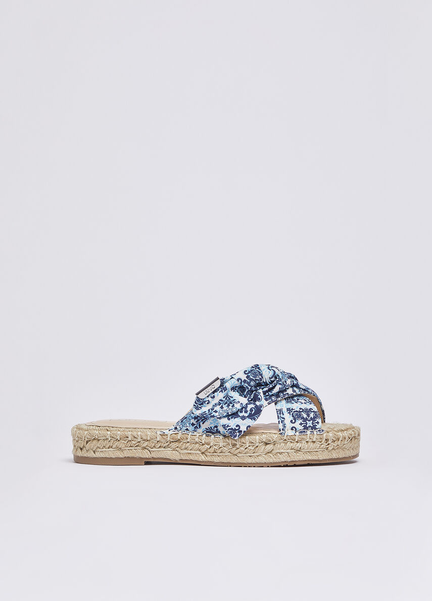 - Espadrille-style sandals with crossover straps in printed fabric