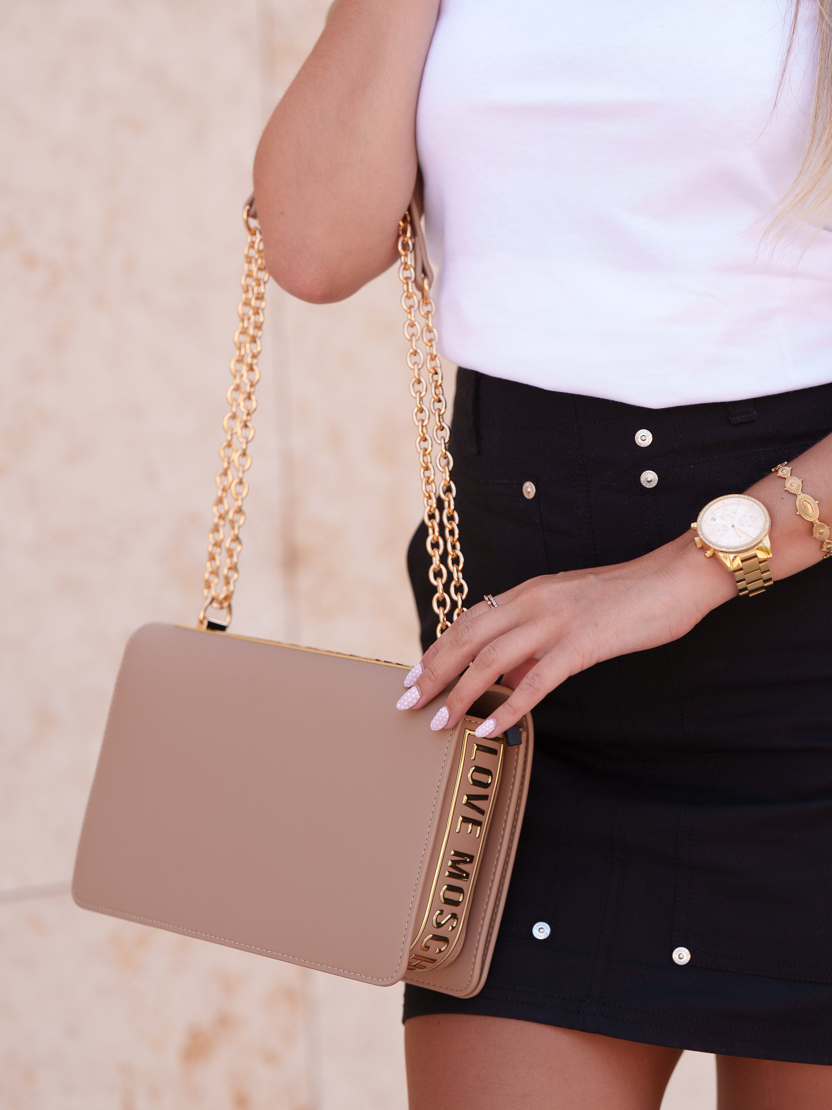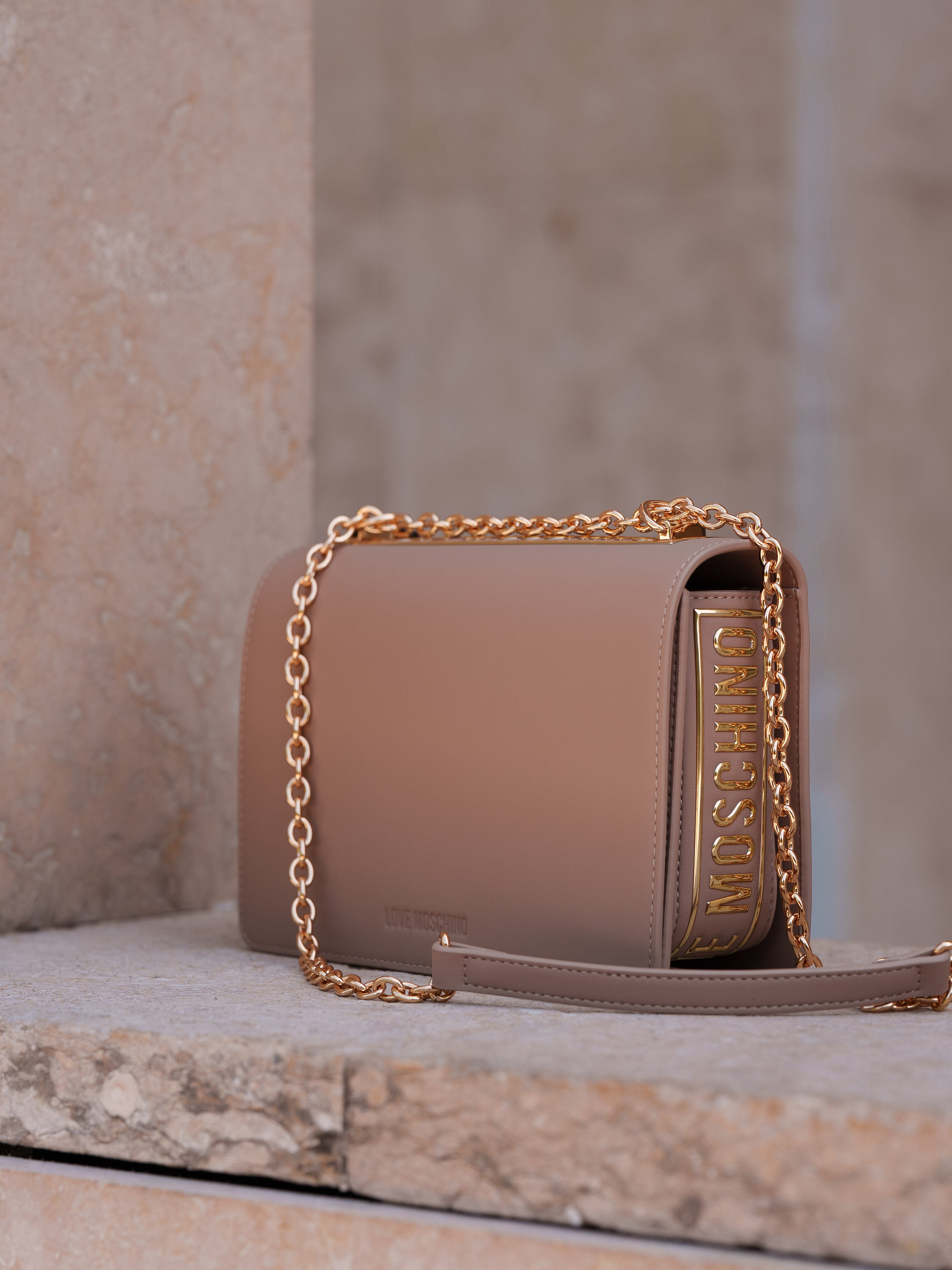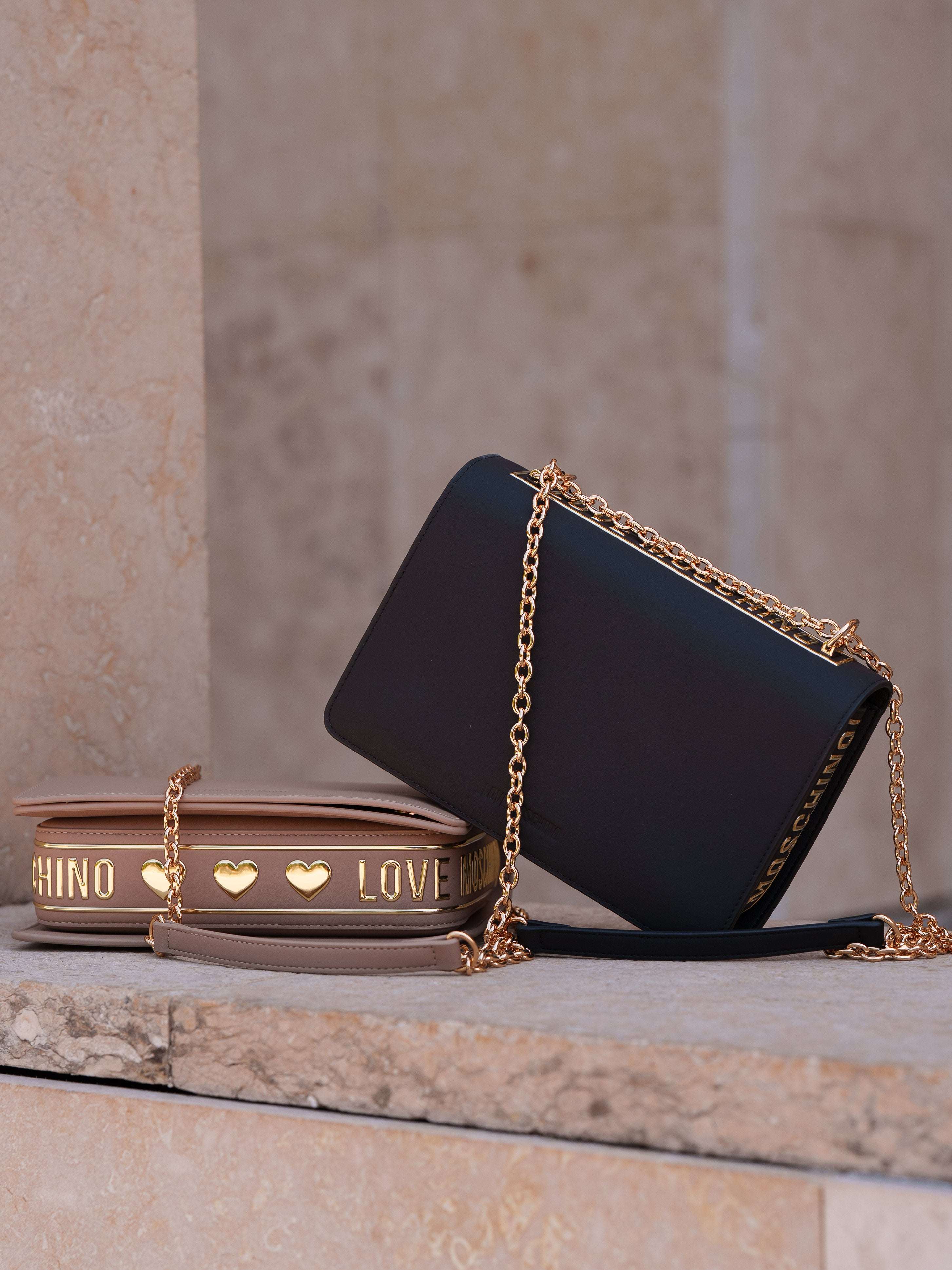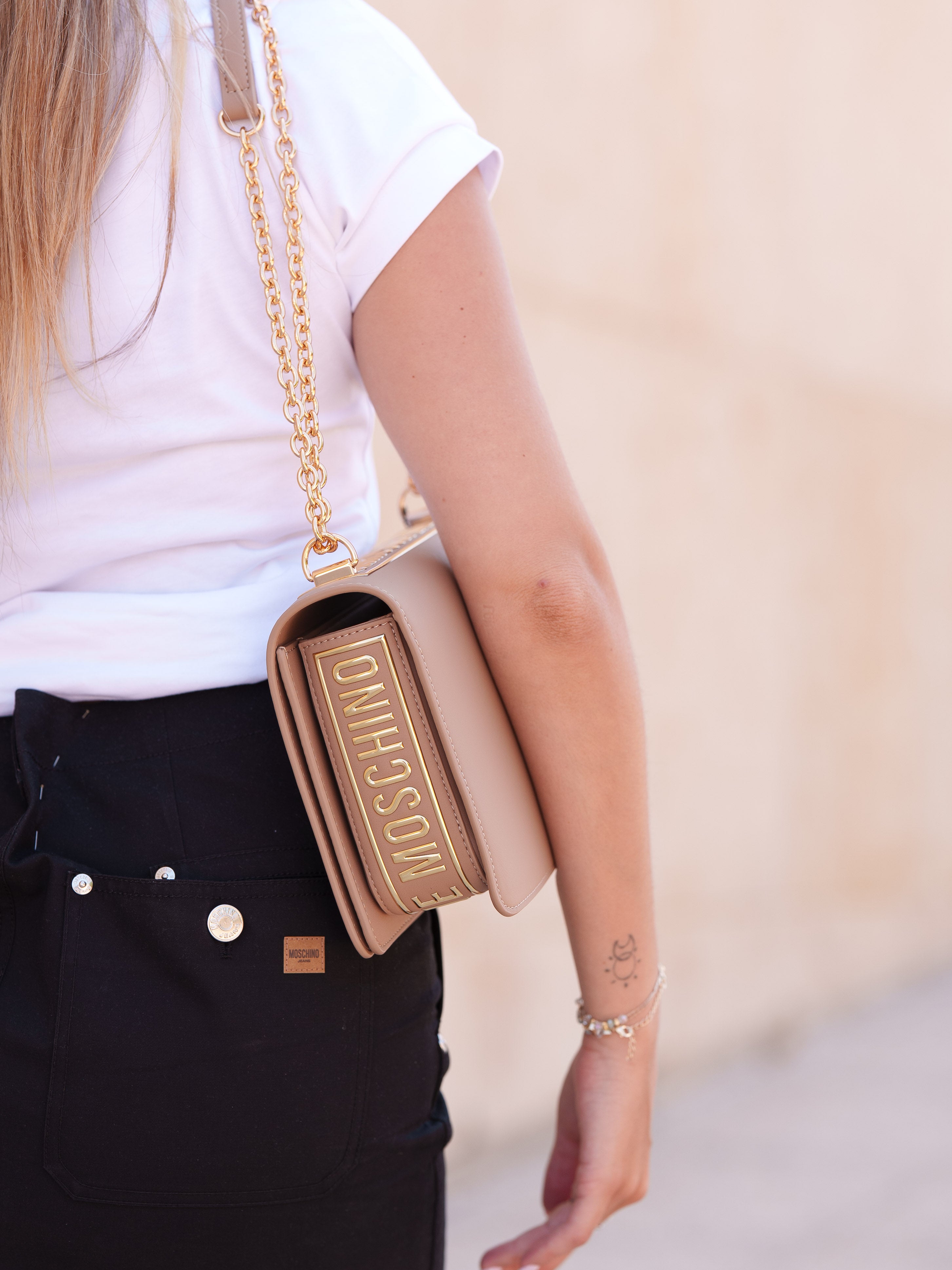 Moschino gold lettering purse with adjustable chain strap. Real leather