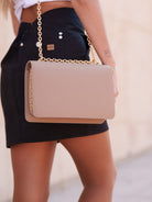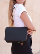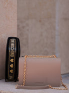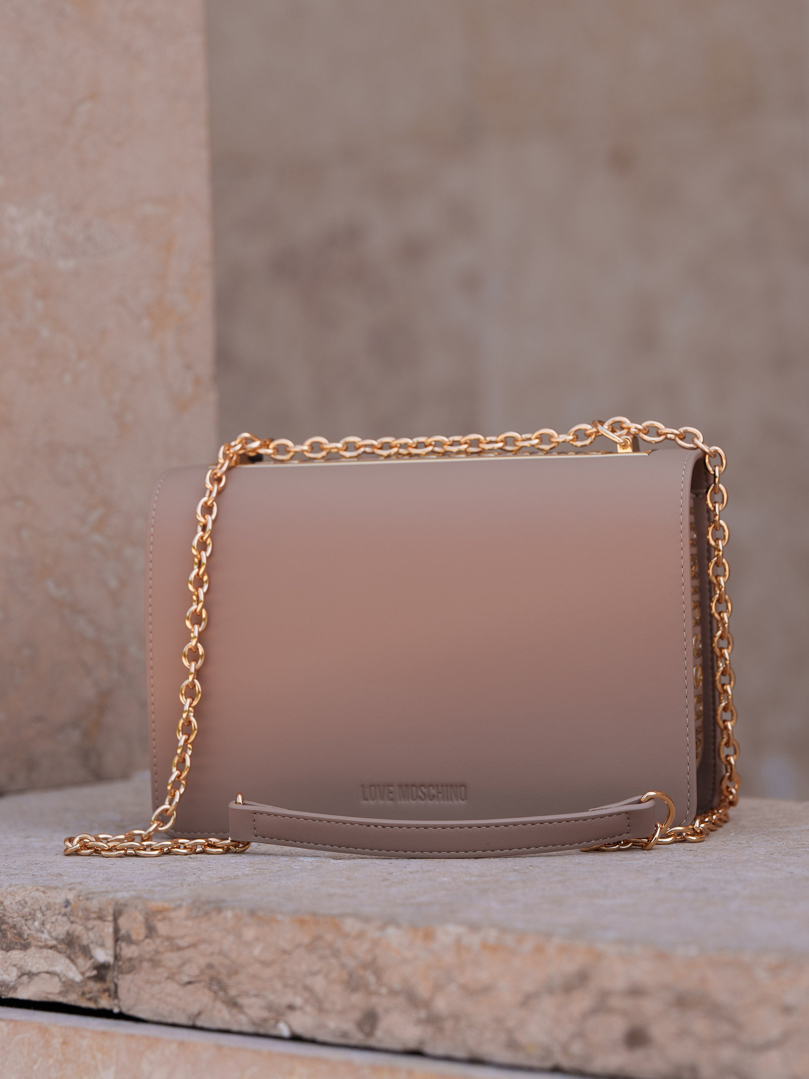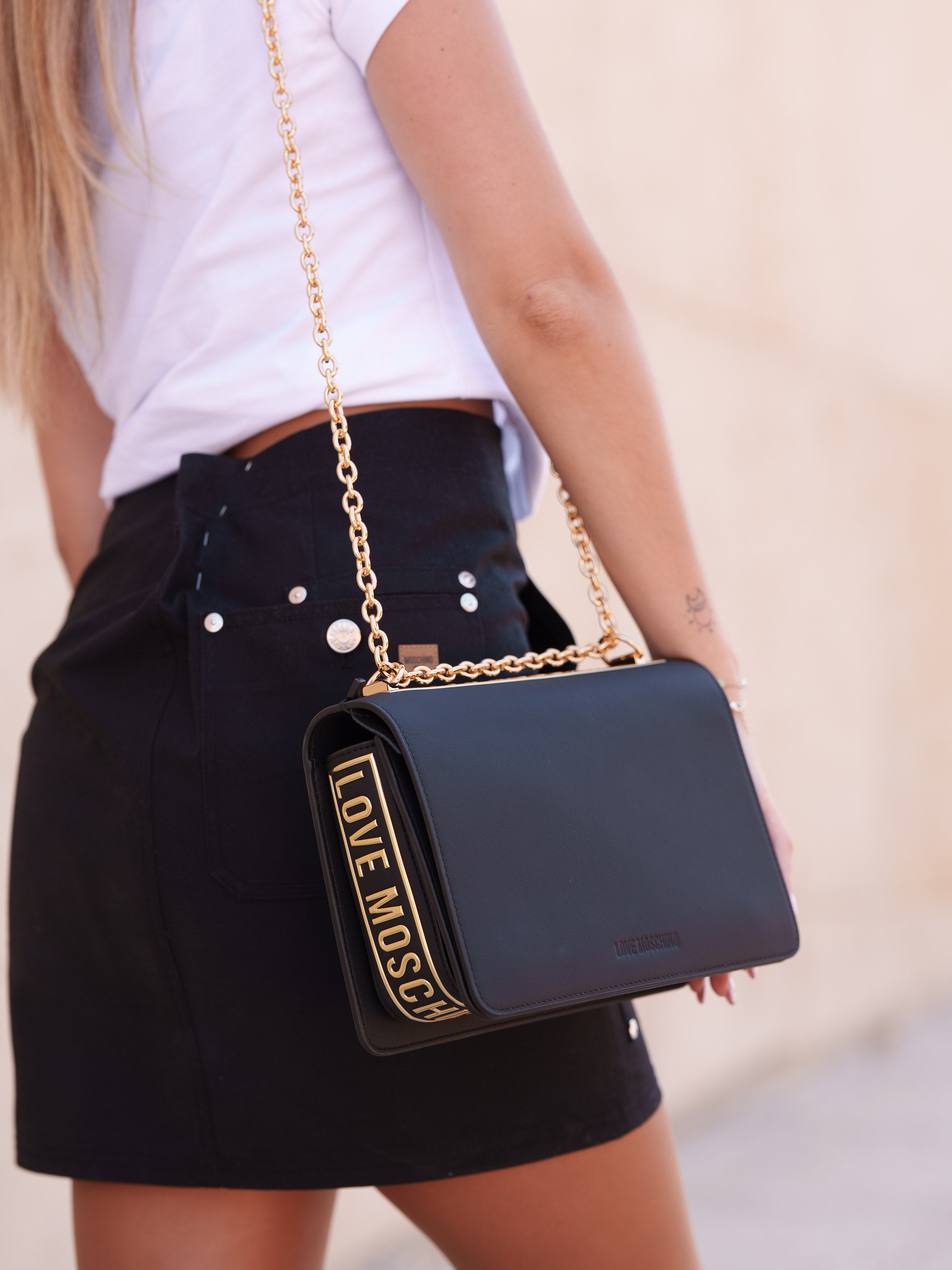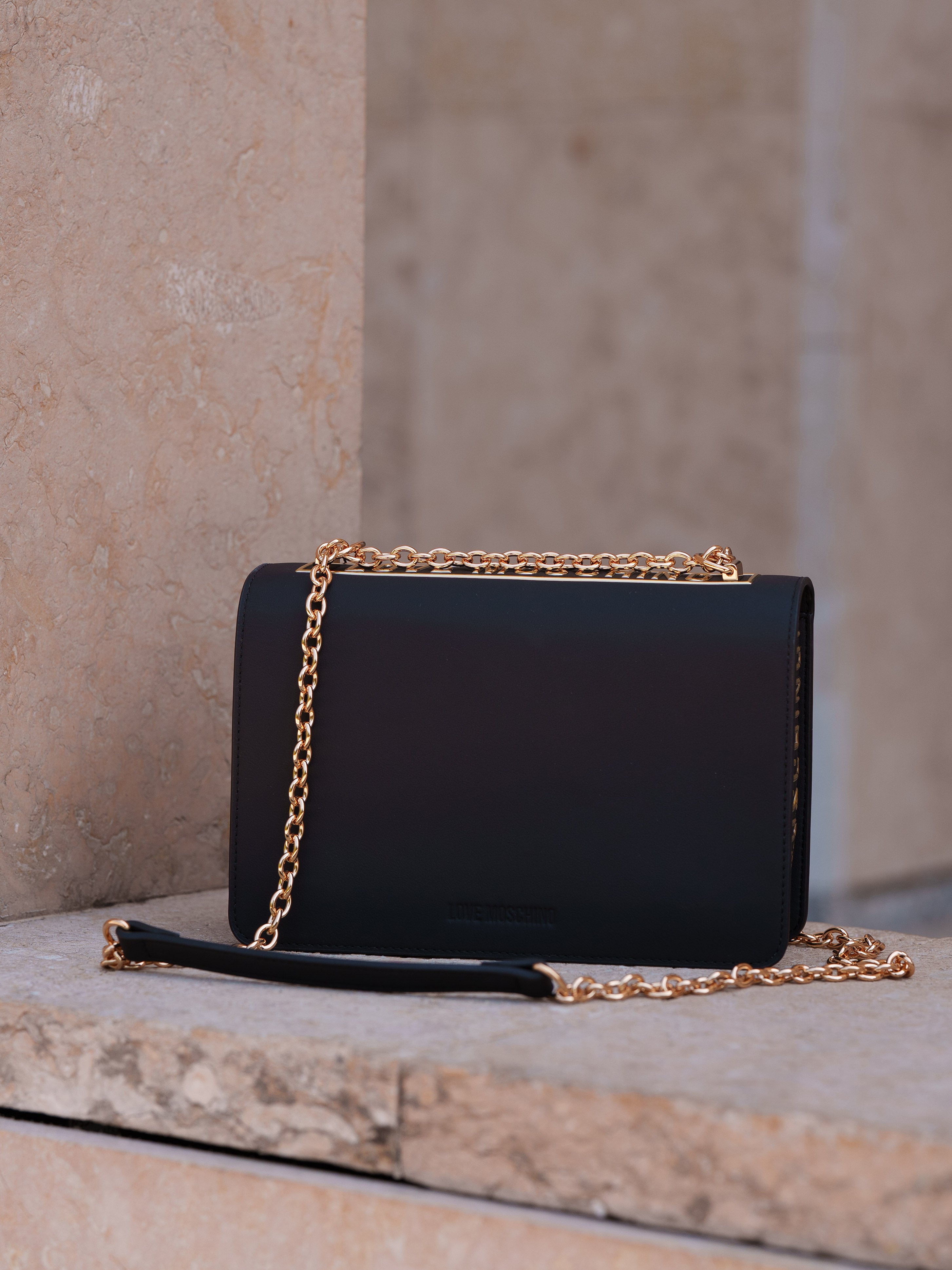 Moschino gold lettering purse with adjustable chain strap. Real leather
