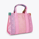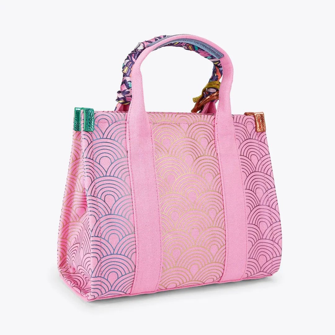 The Small Southbank Tote is crafted in a pink canvas with outline ombre rainbow print. There are metallic multi-colour trims as well as antiqued brass Eagle head with crystals on the tab.