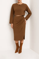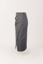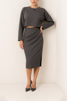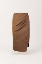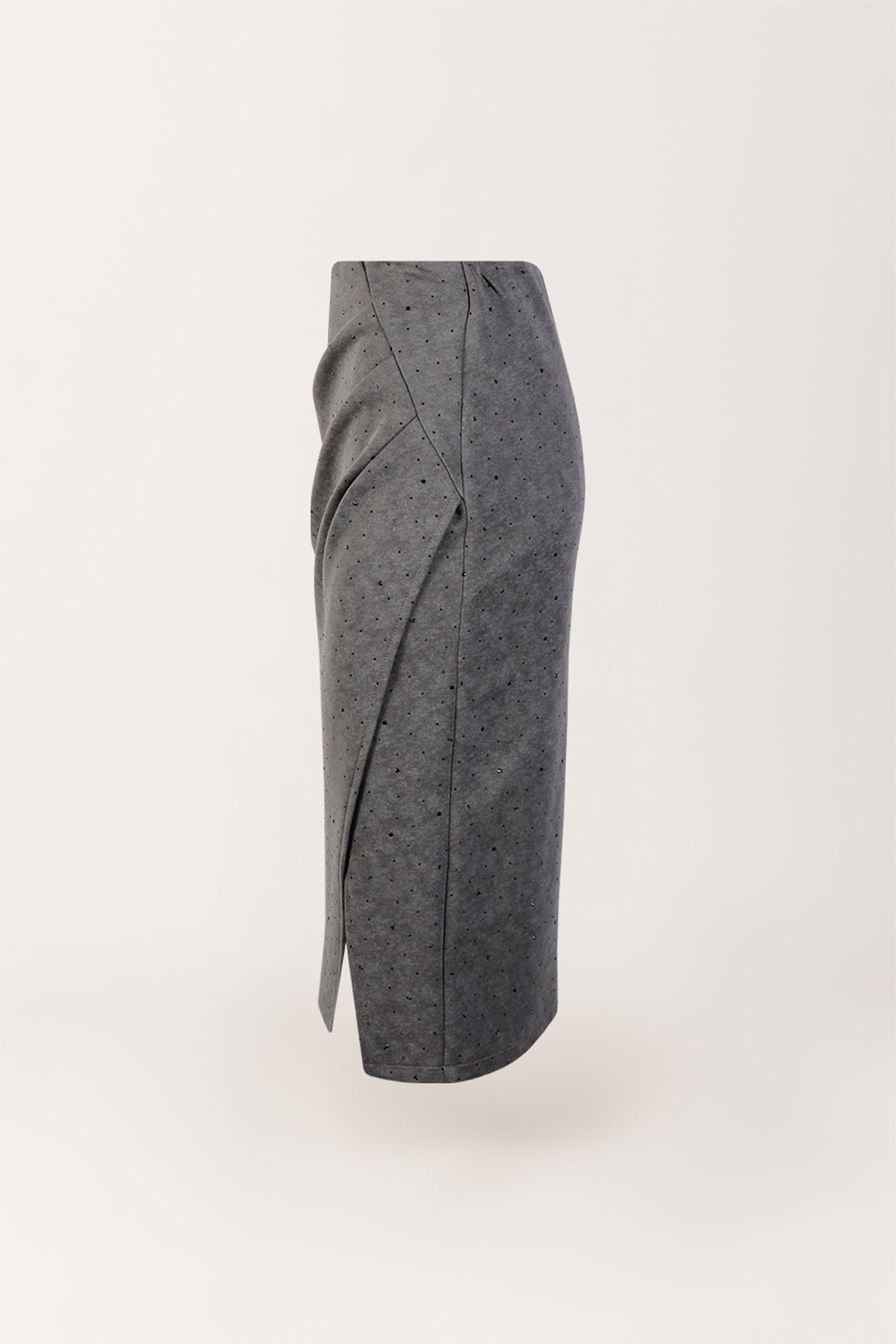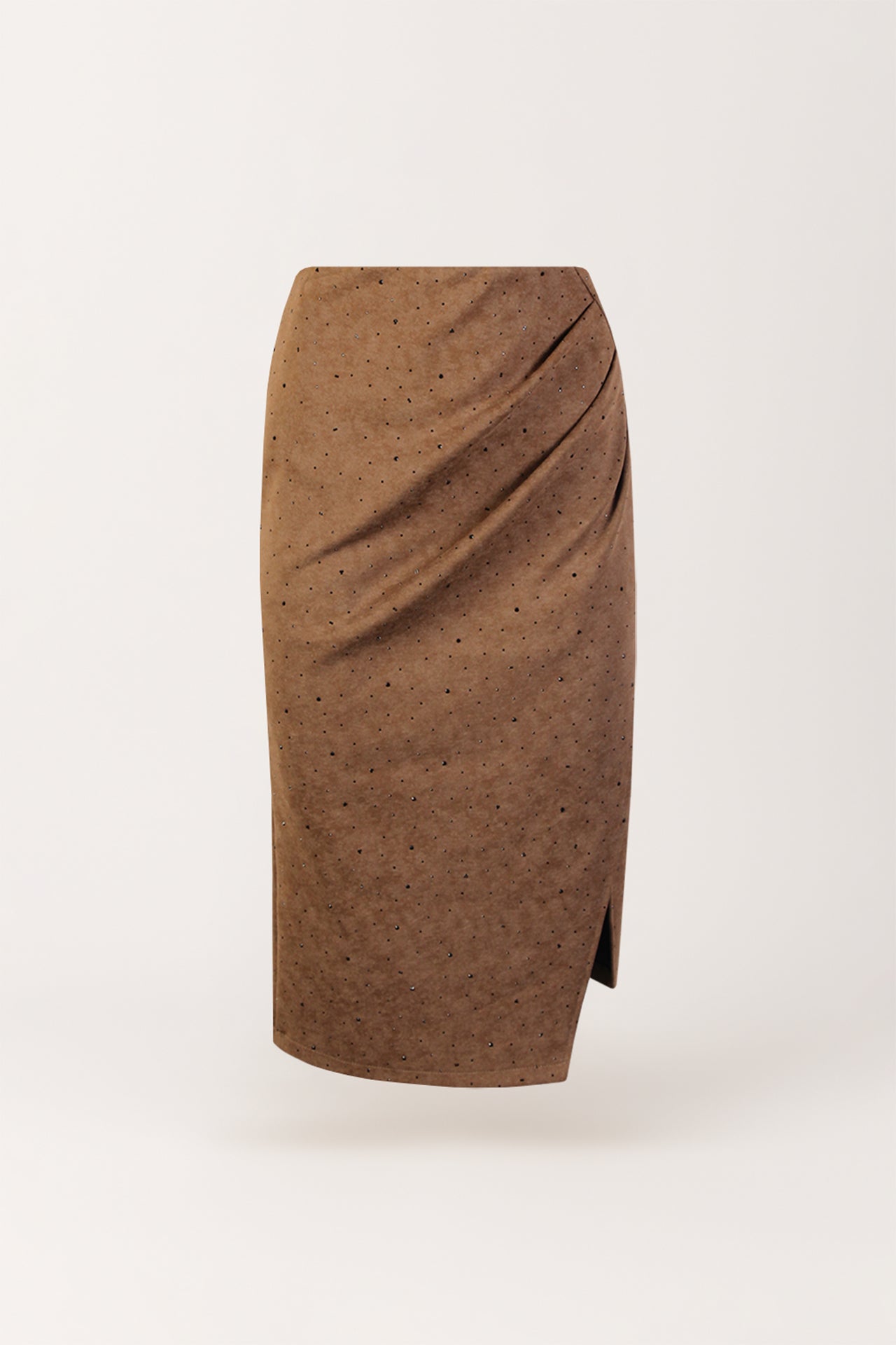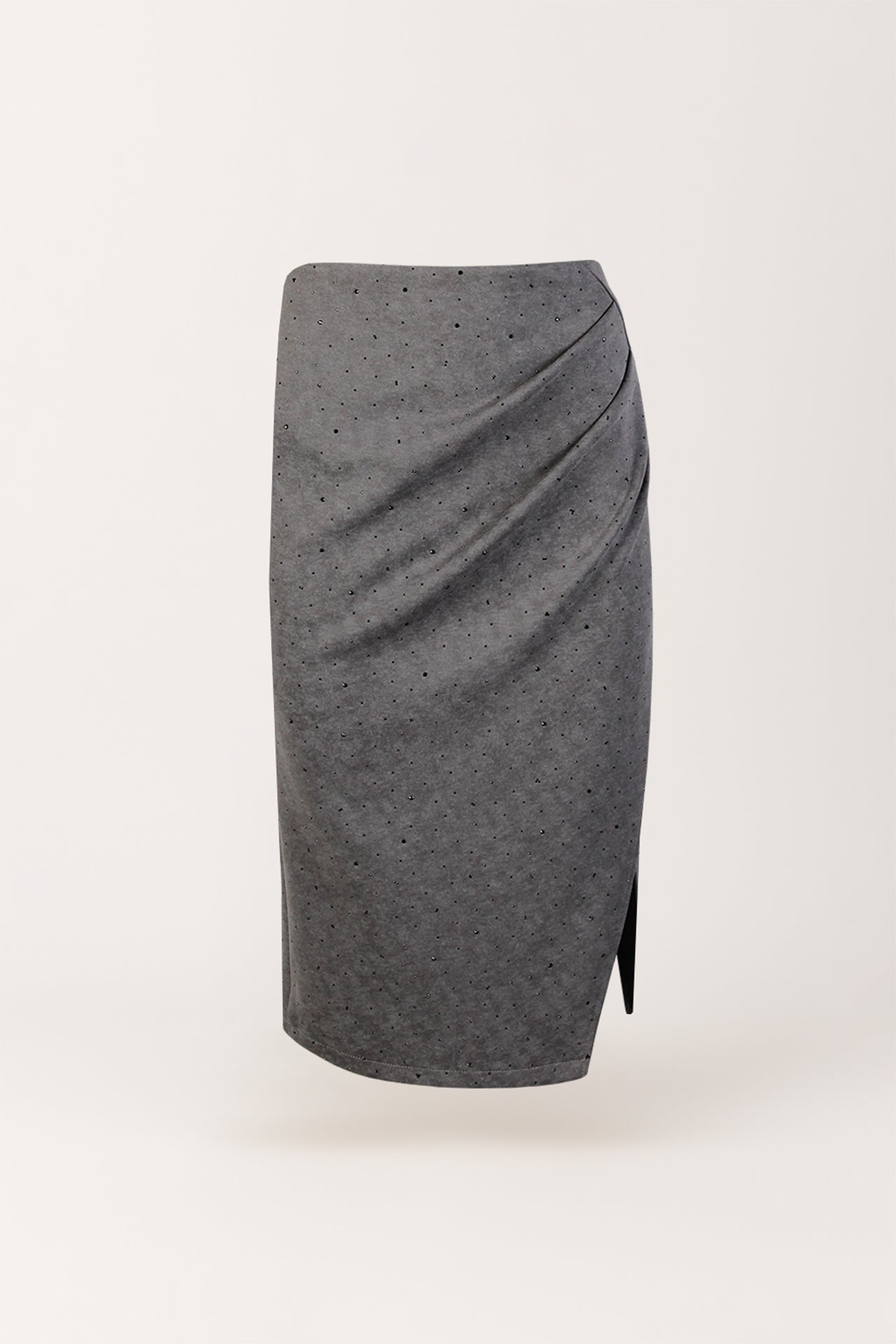 Saia midi em tecido de acabamento pele de pêssego, de toque aveludado e estrutura macia. O corte ajustado é realçado por um drapeado lateral, enquanto as aplicações brilhantes acrescentam um toque luminoso e sofisticado. Cintura elástica.