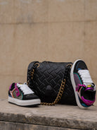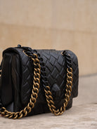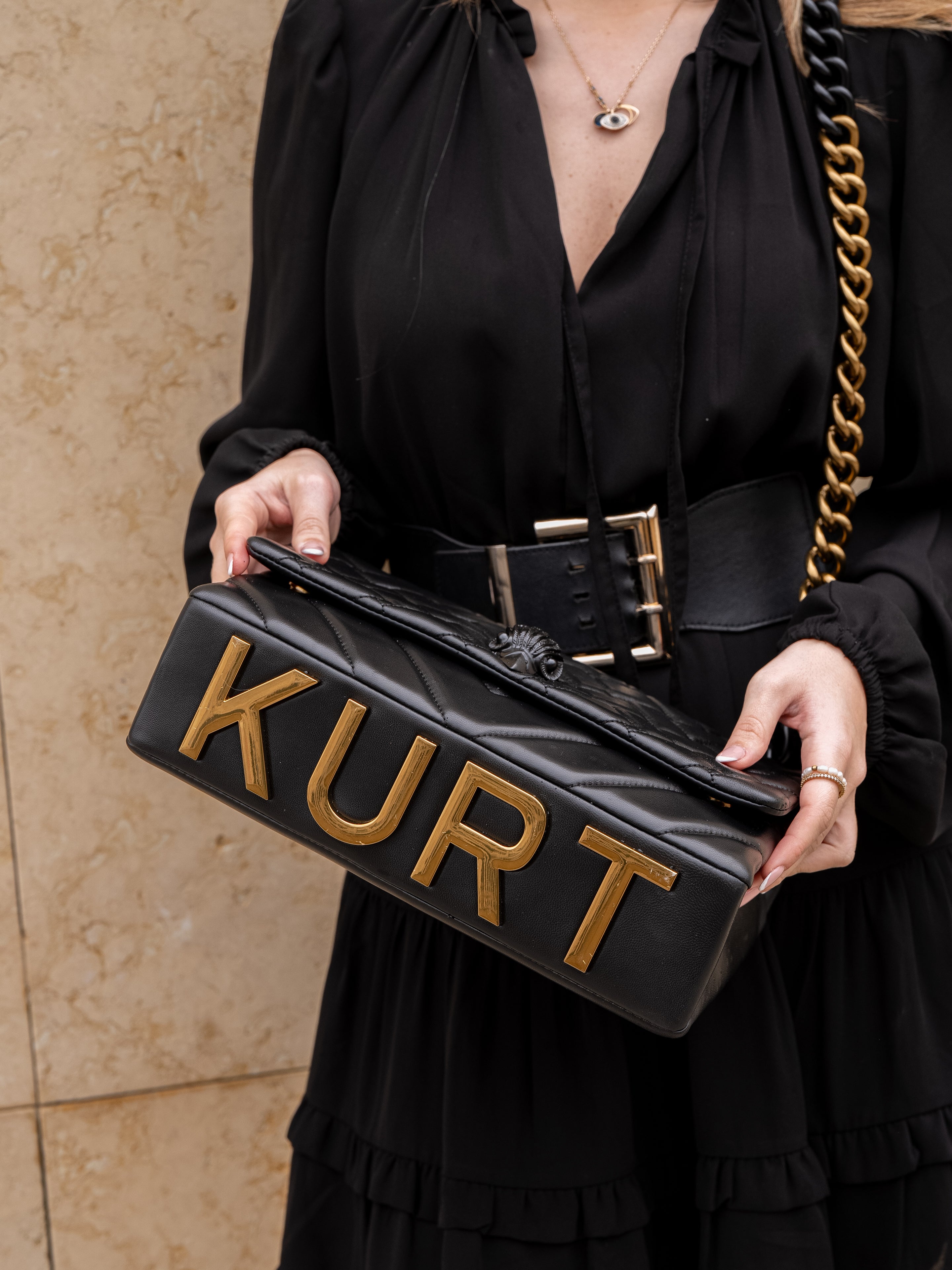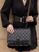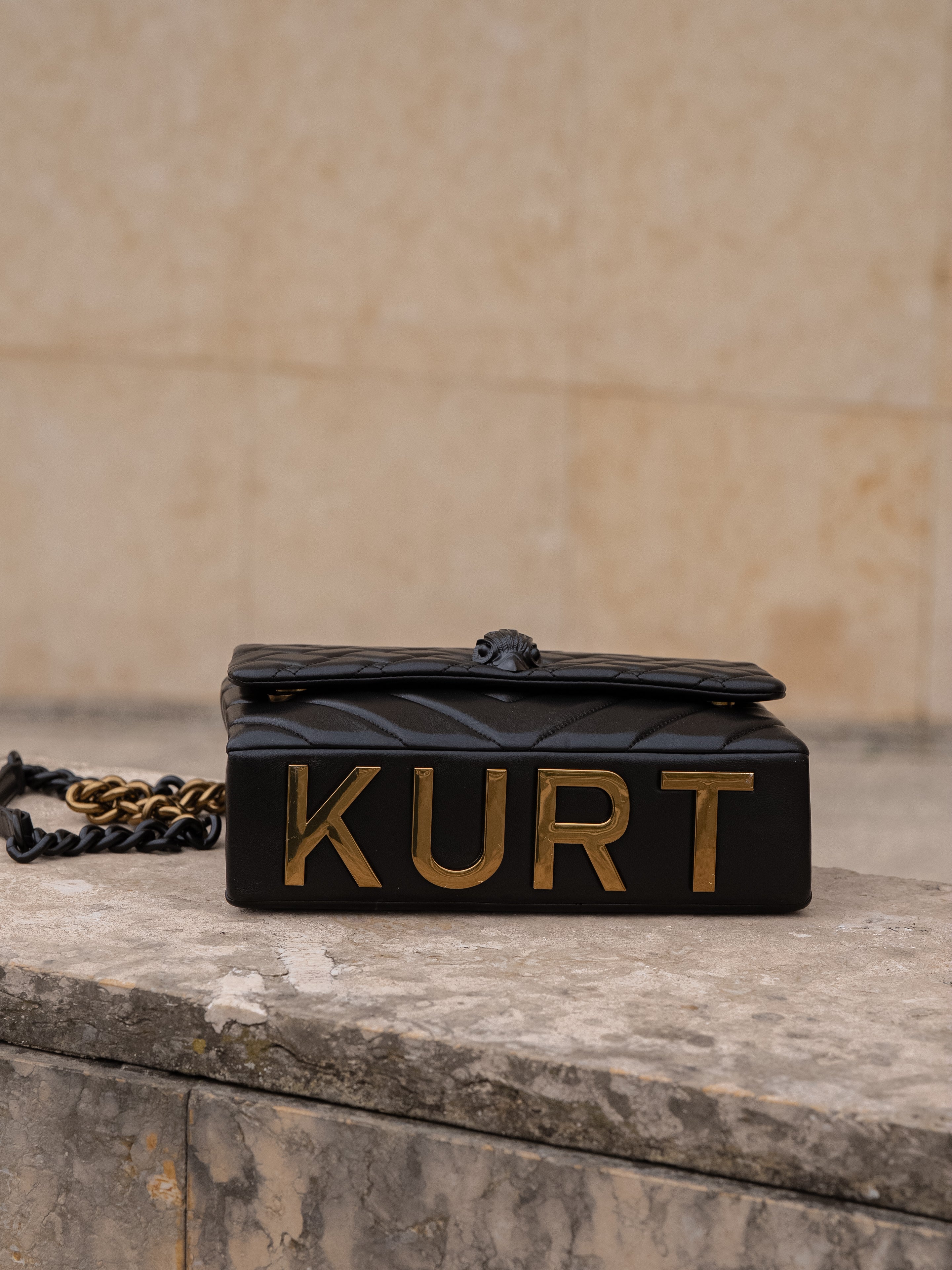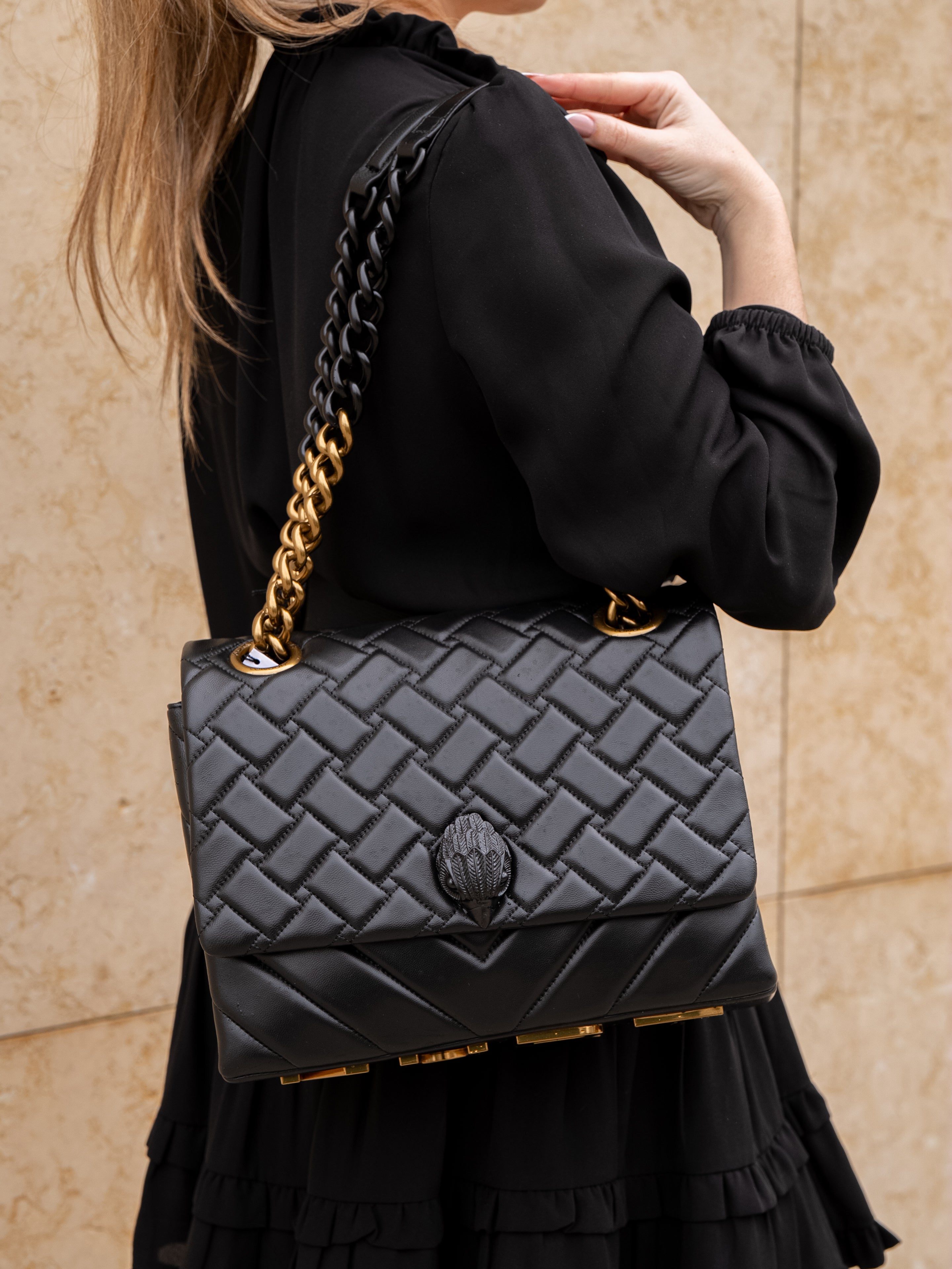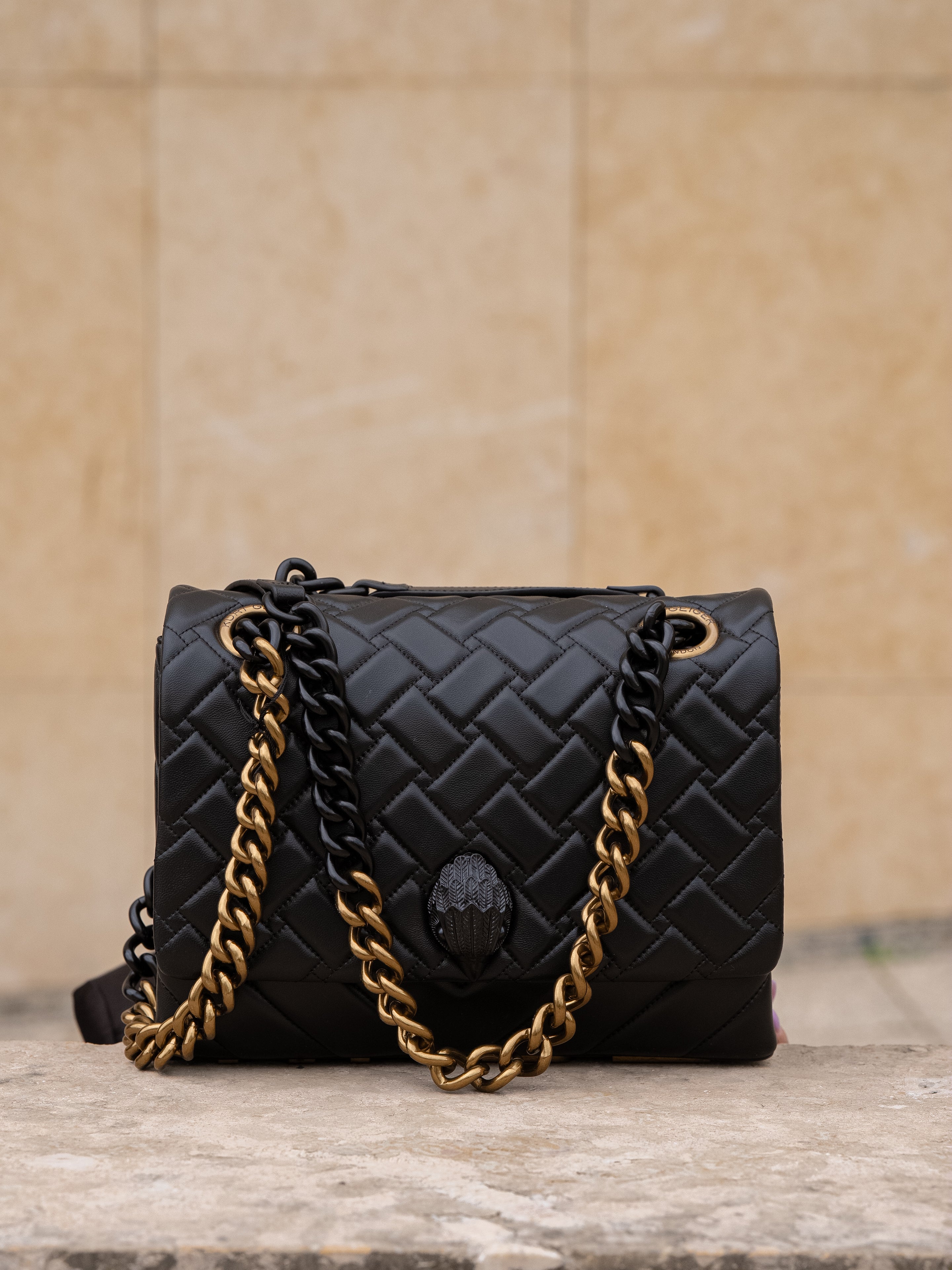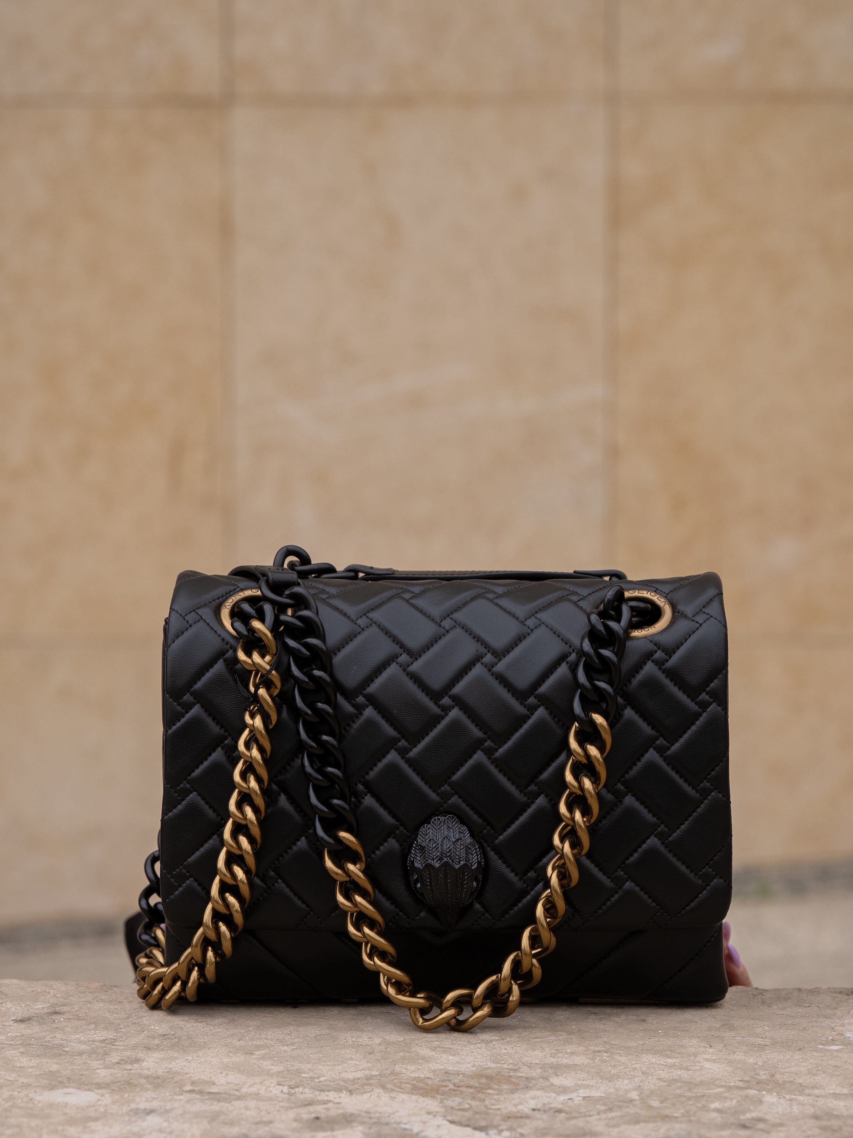 The Large Kensington Kurt is crafted from a black lambskin leather with overstitch quilt pattern. The black eagle head features all over feather detail. The bottom of the bag features an antiqued brass 'KURT'.