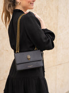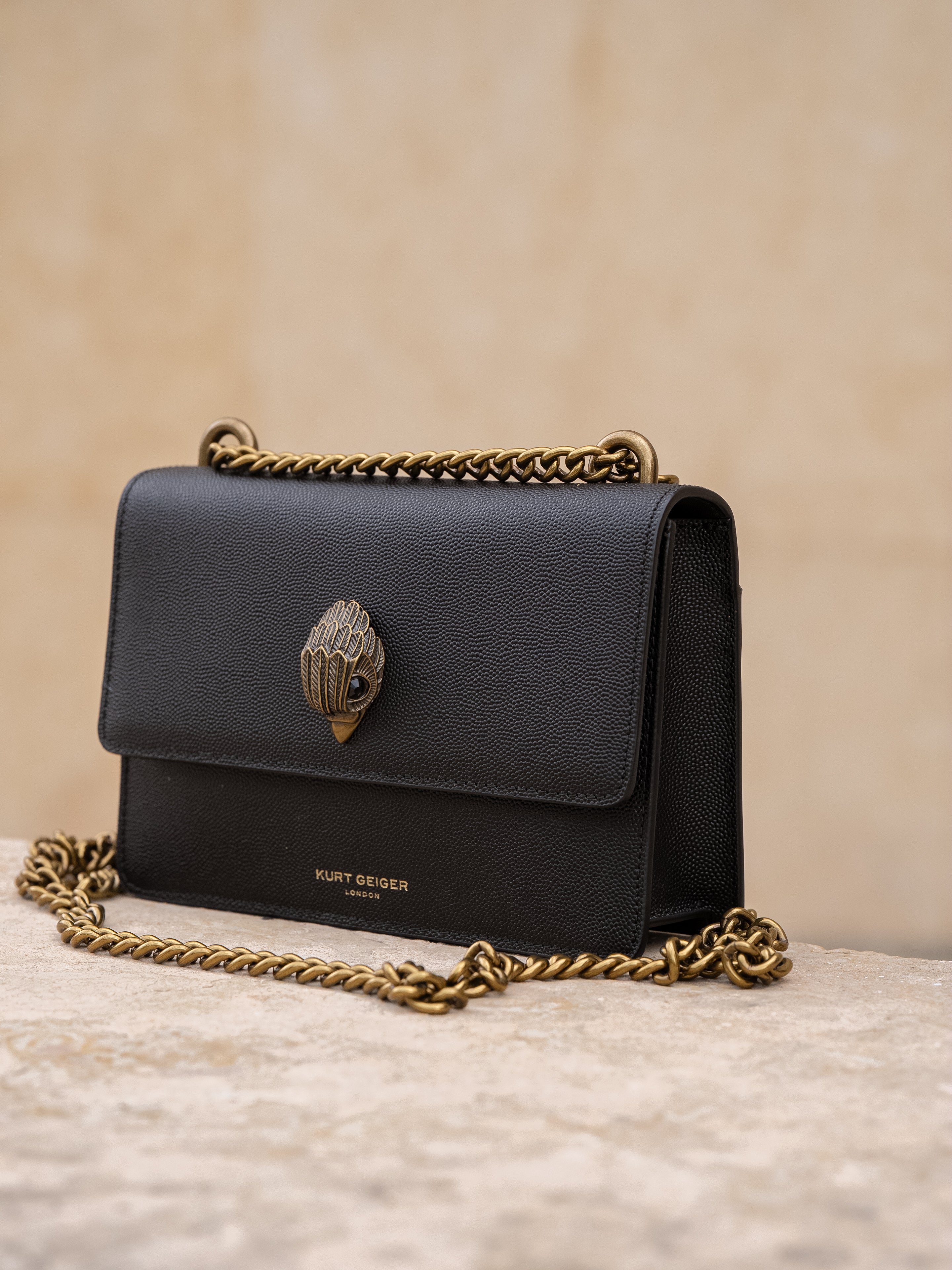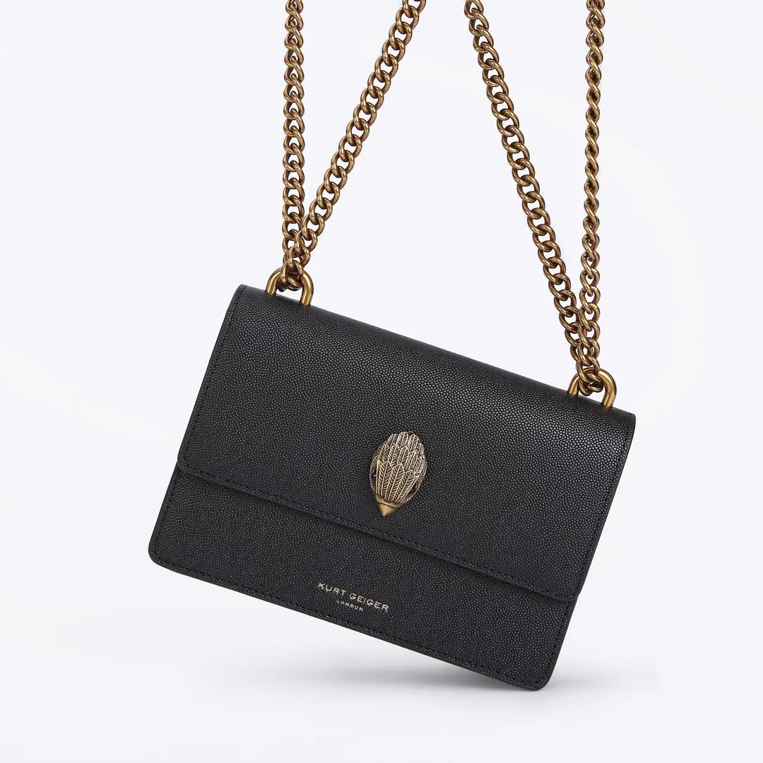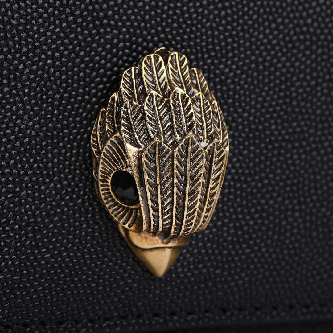 The Small Shoreditch Cross Body is crafted from caviar embossed cow leather for structure and durability. The front flap is topped with antiqued brass Eagle head with all over feather texture and black crystal eyes.