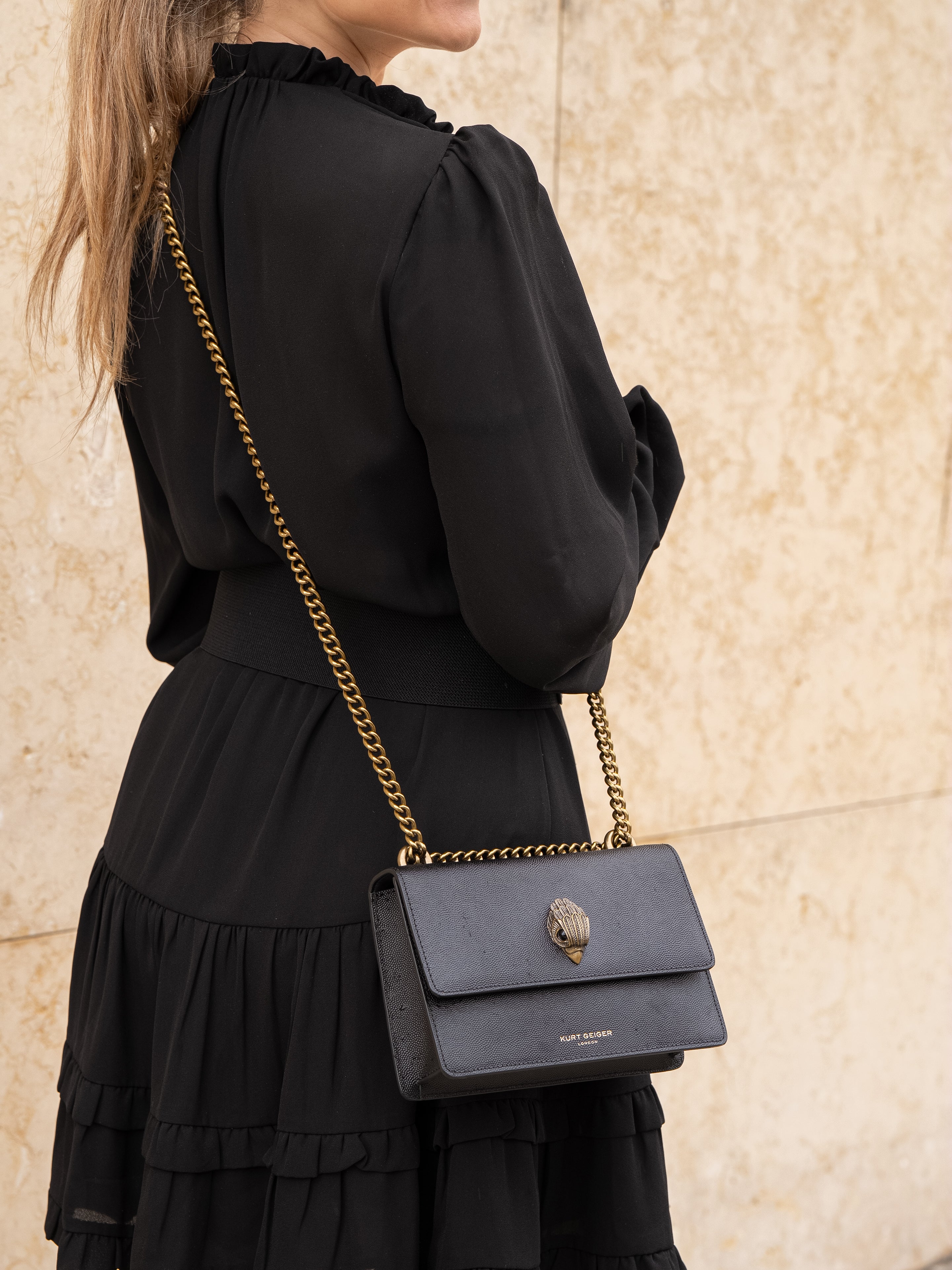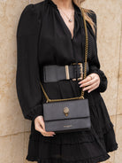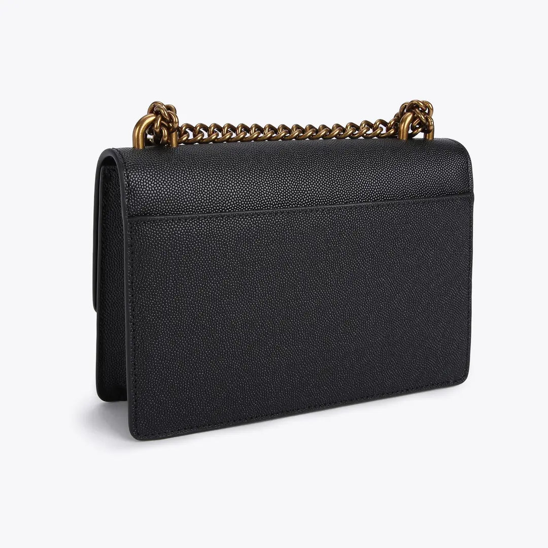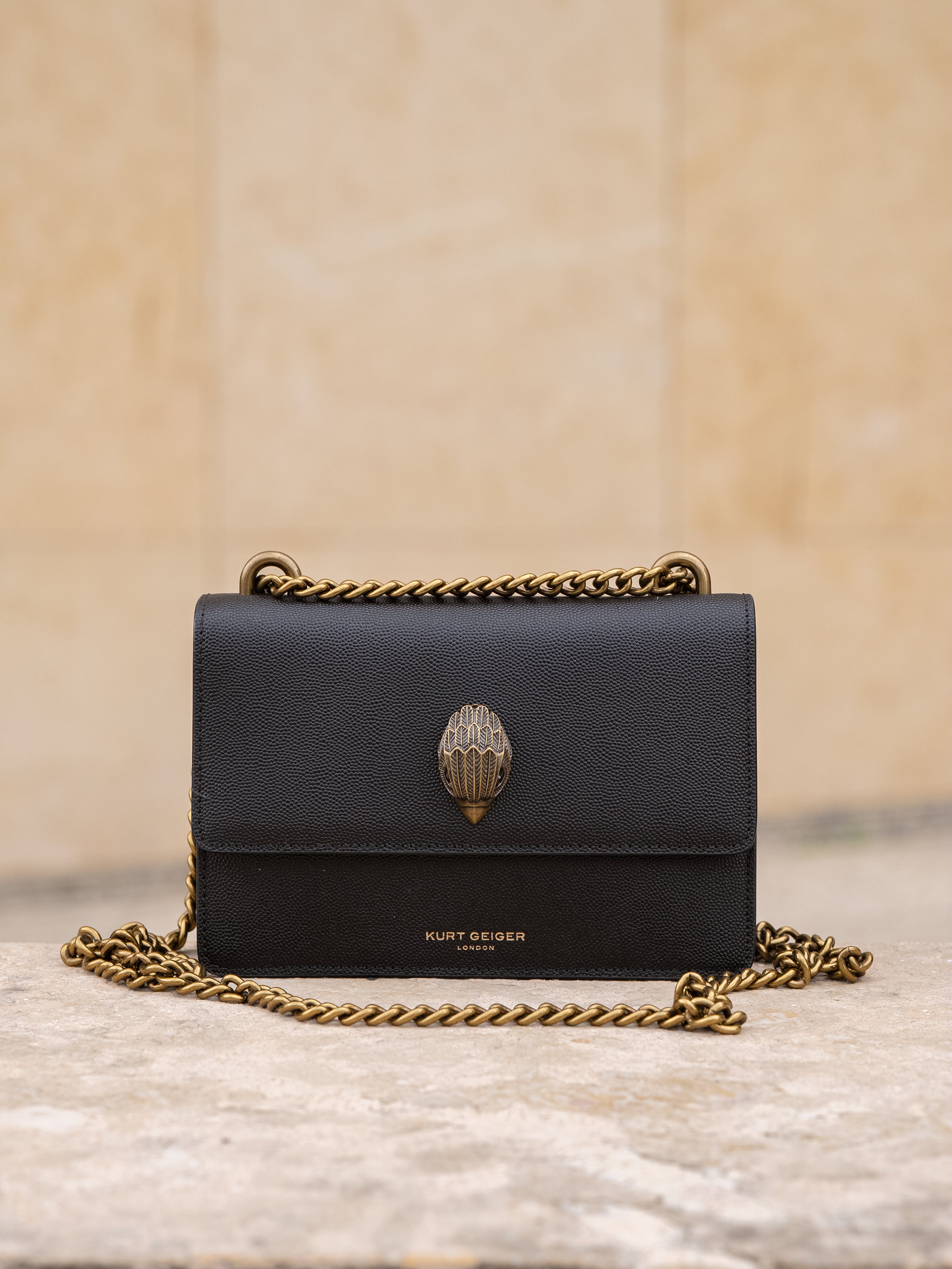 The Small Shoreditch Cross Body is crafted from caviar embossed cow leather for structure and durability. The front flap is topped with antiqued brass Eagle head with all over feather texture and black crystal eyes.