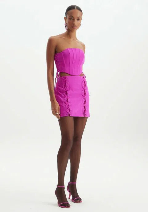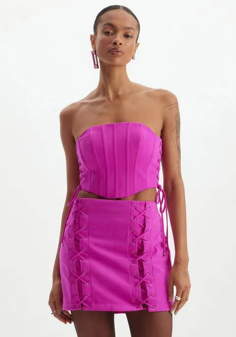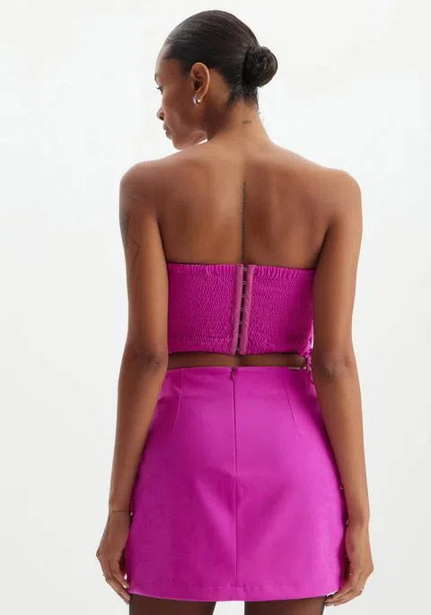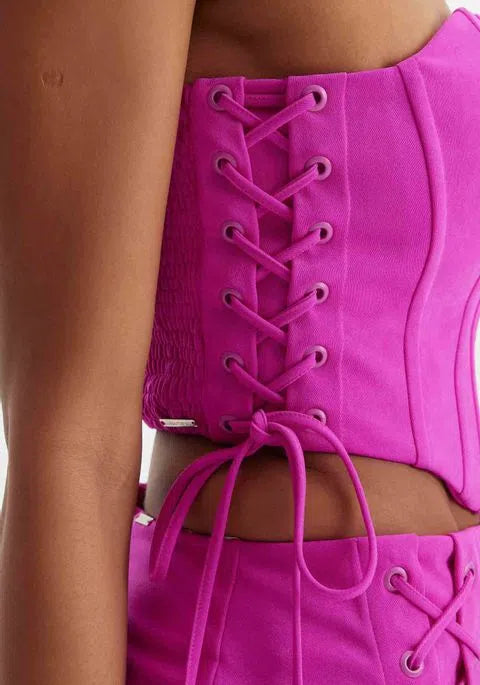 O top em estilo corset é perfeito para acompanhar diversas produções. Além do caimento justo, a peça possui modelagem cropped, decote tomara que caia e detalhes em amarrações com ilhós que garantem um visual único. Aposte.
