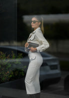 Camisa confeccionada em tecido malha elástica. Gola de lapela e manga comprida acabada em punho.
