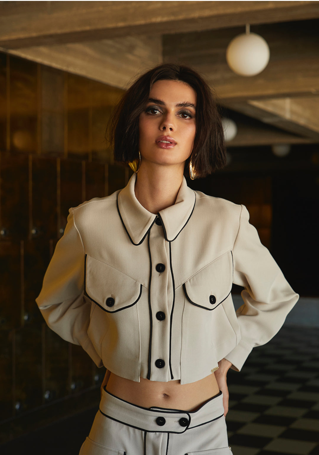 Bolsos de chapa á frente com lapela. Fecho frontal com botões em contraste.