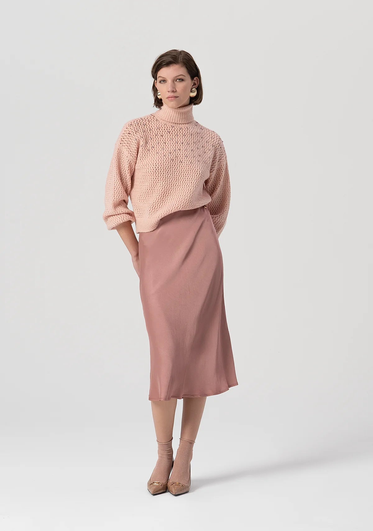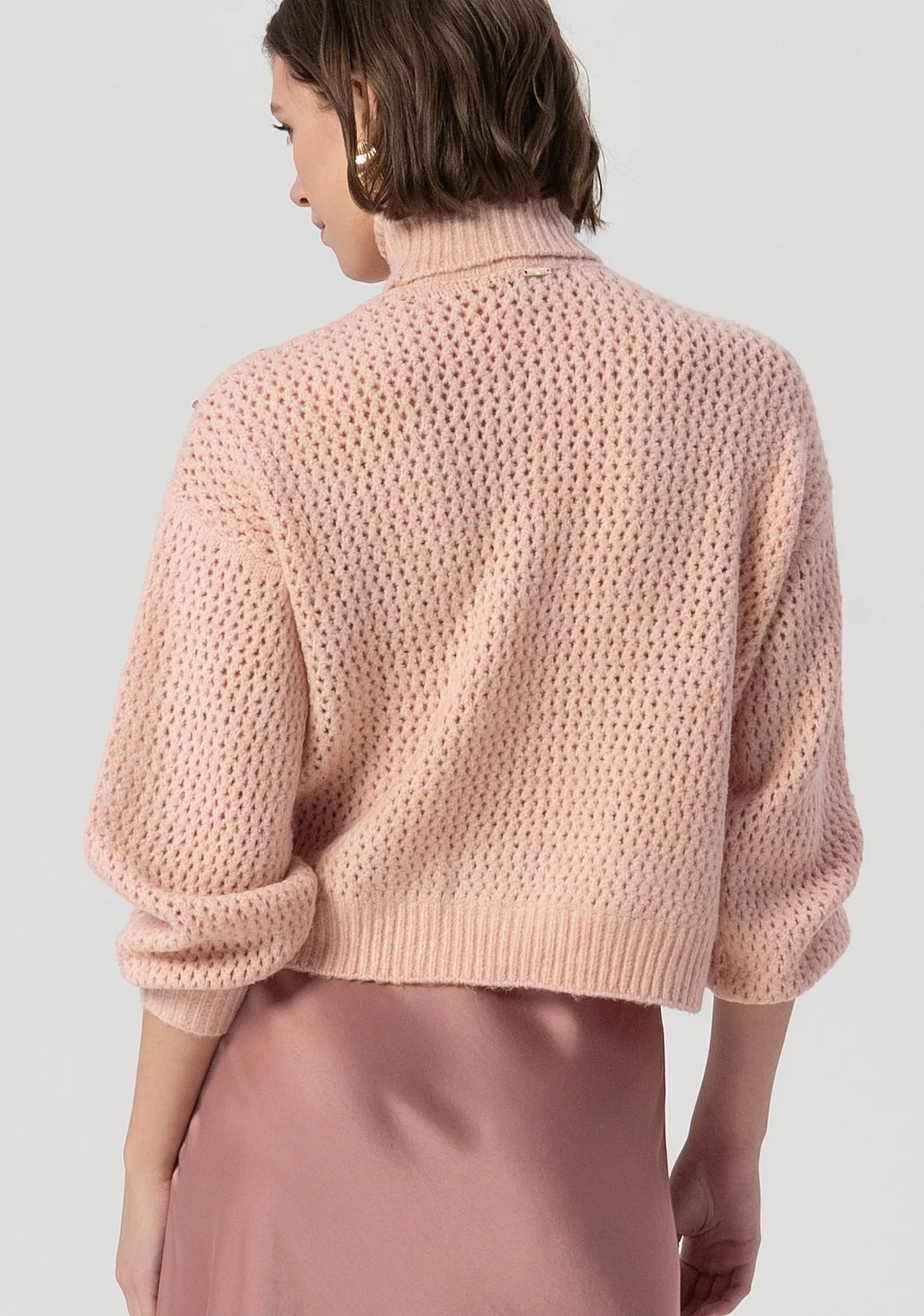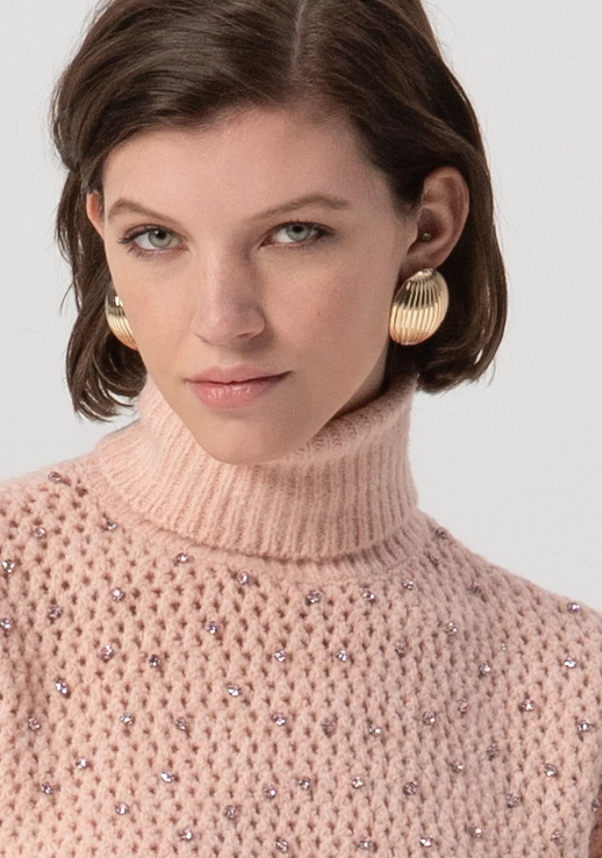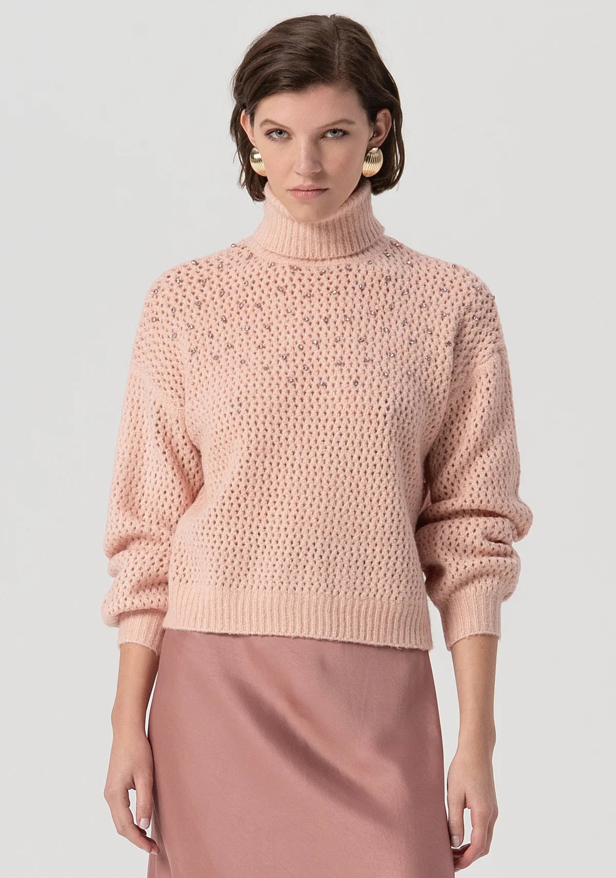 Knitwear over fit with overlock. High neck, shiny stones applied and long sleeves