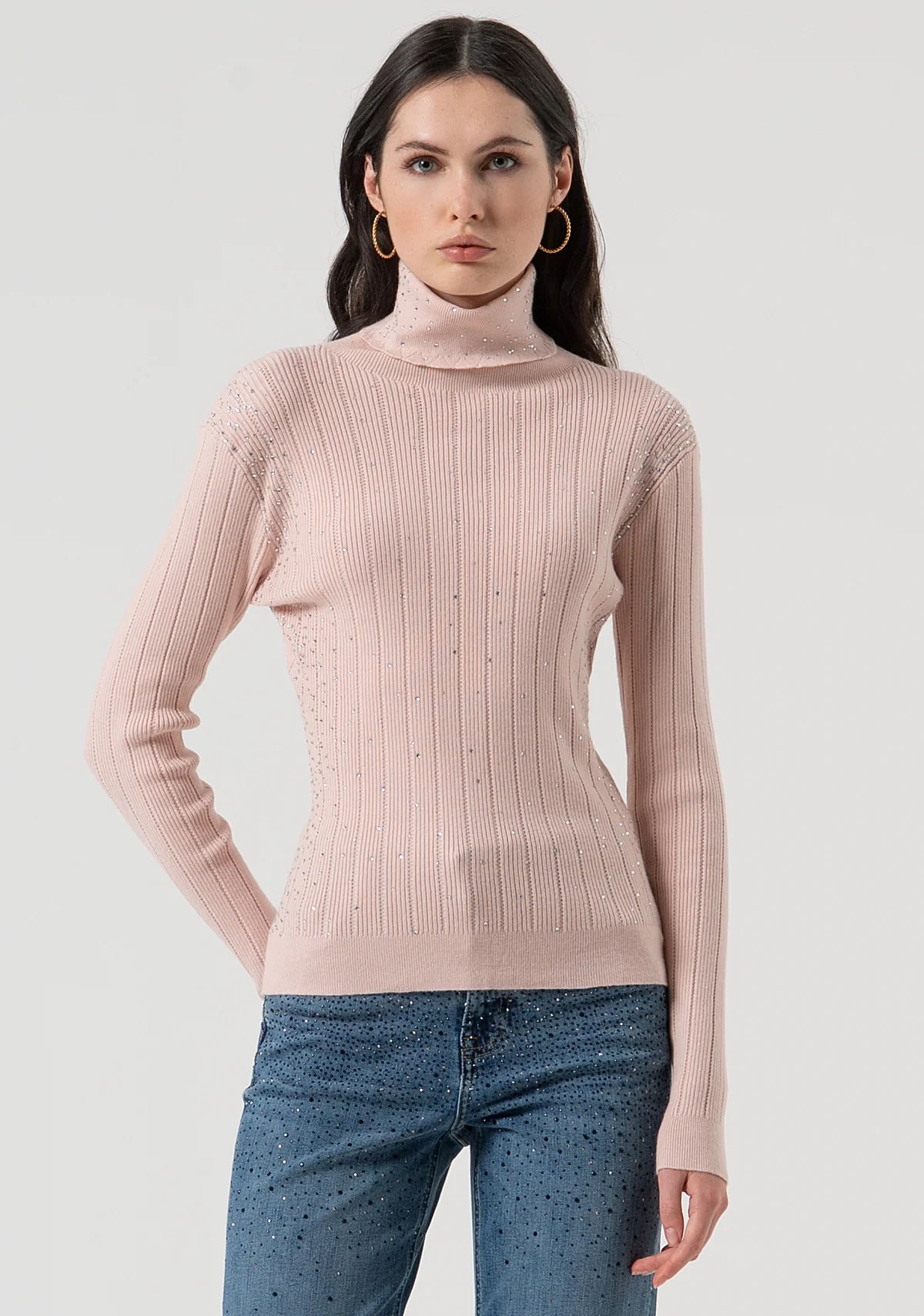 Knitwear slim fit with ribs and strasses. High neck and long sleeves