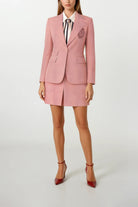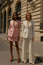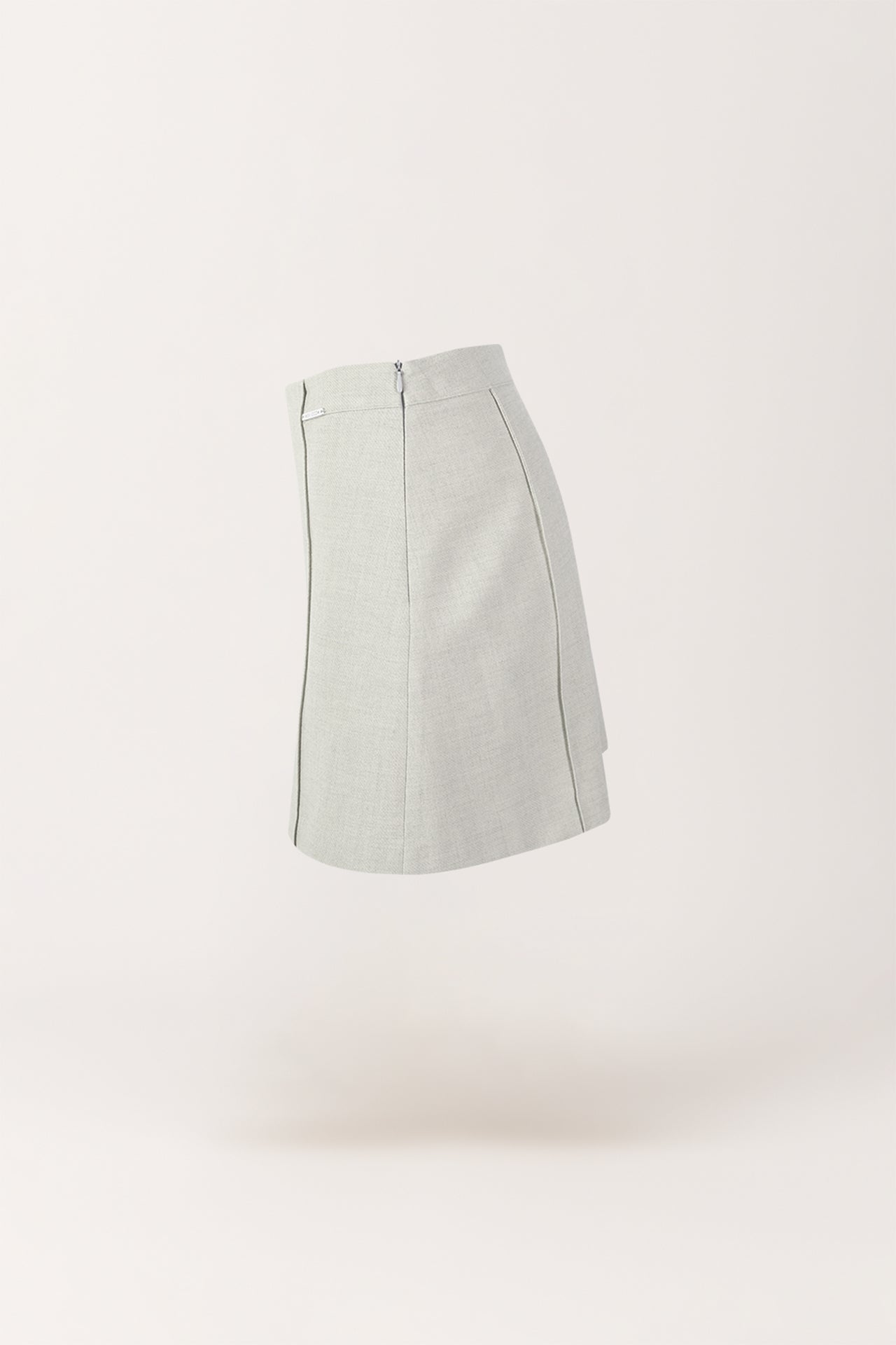 Saia-calção curta em tecido de alfaiataria com estrutura leve. Cintura média, abertura frontal e corte ligeiramente em A. O desenho limpo reforça a precisão da construção.