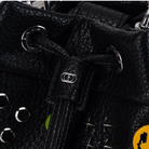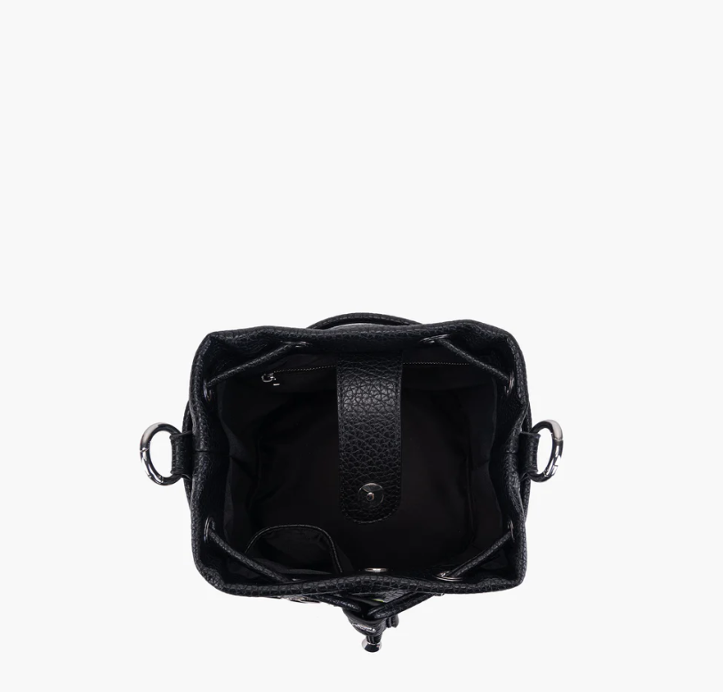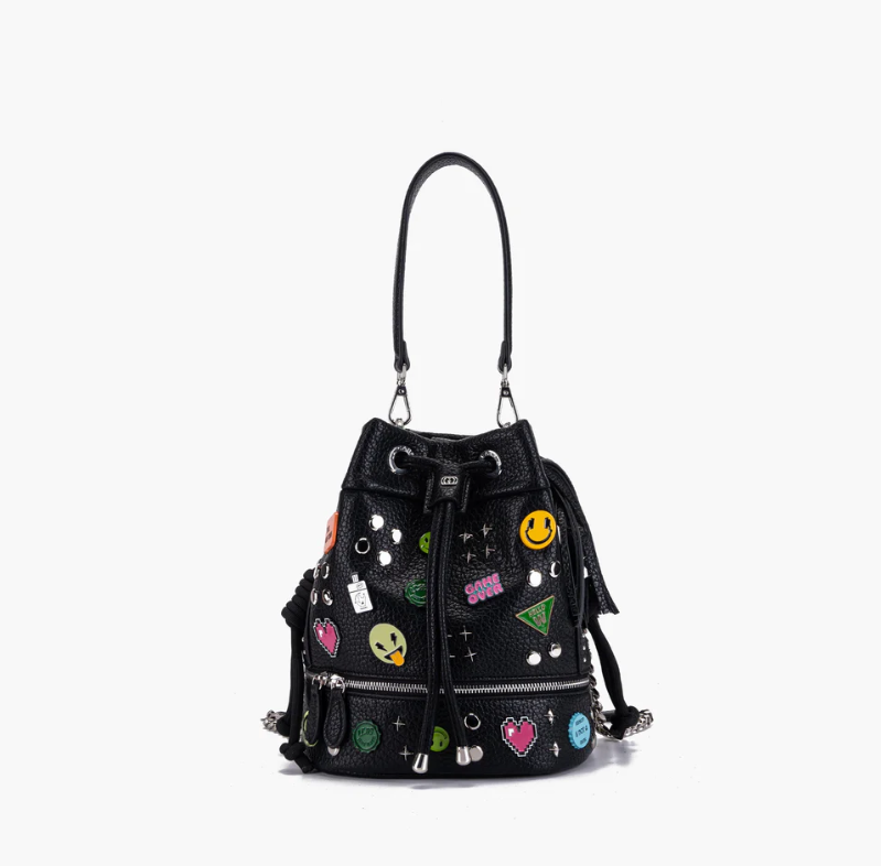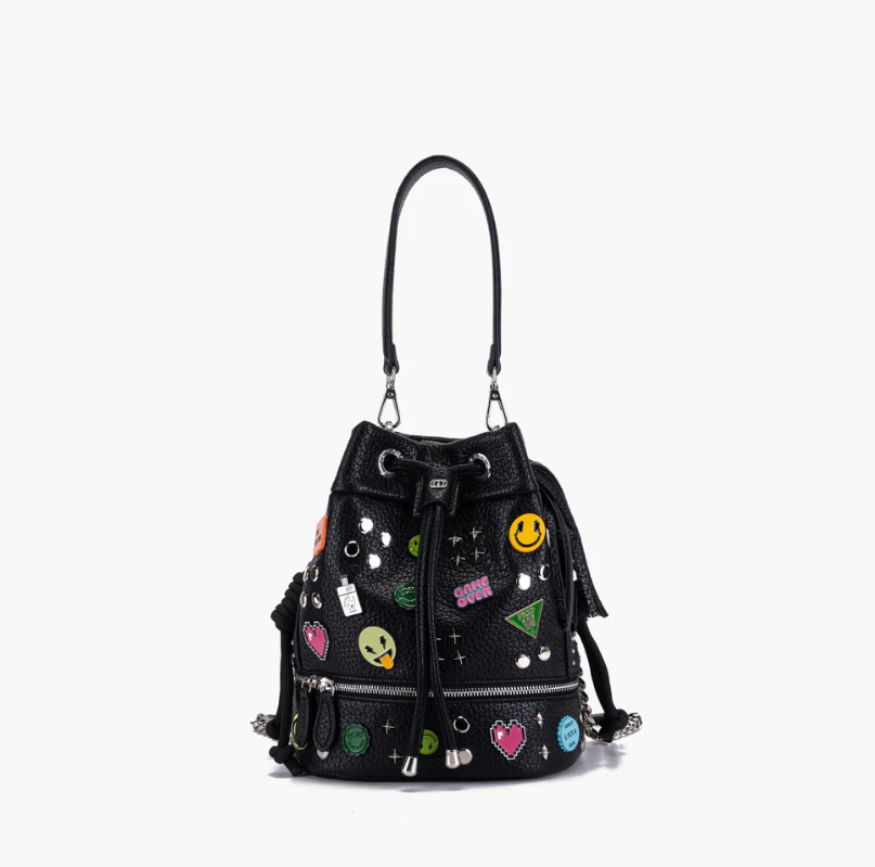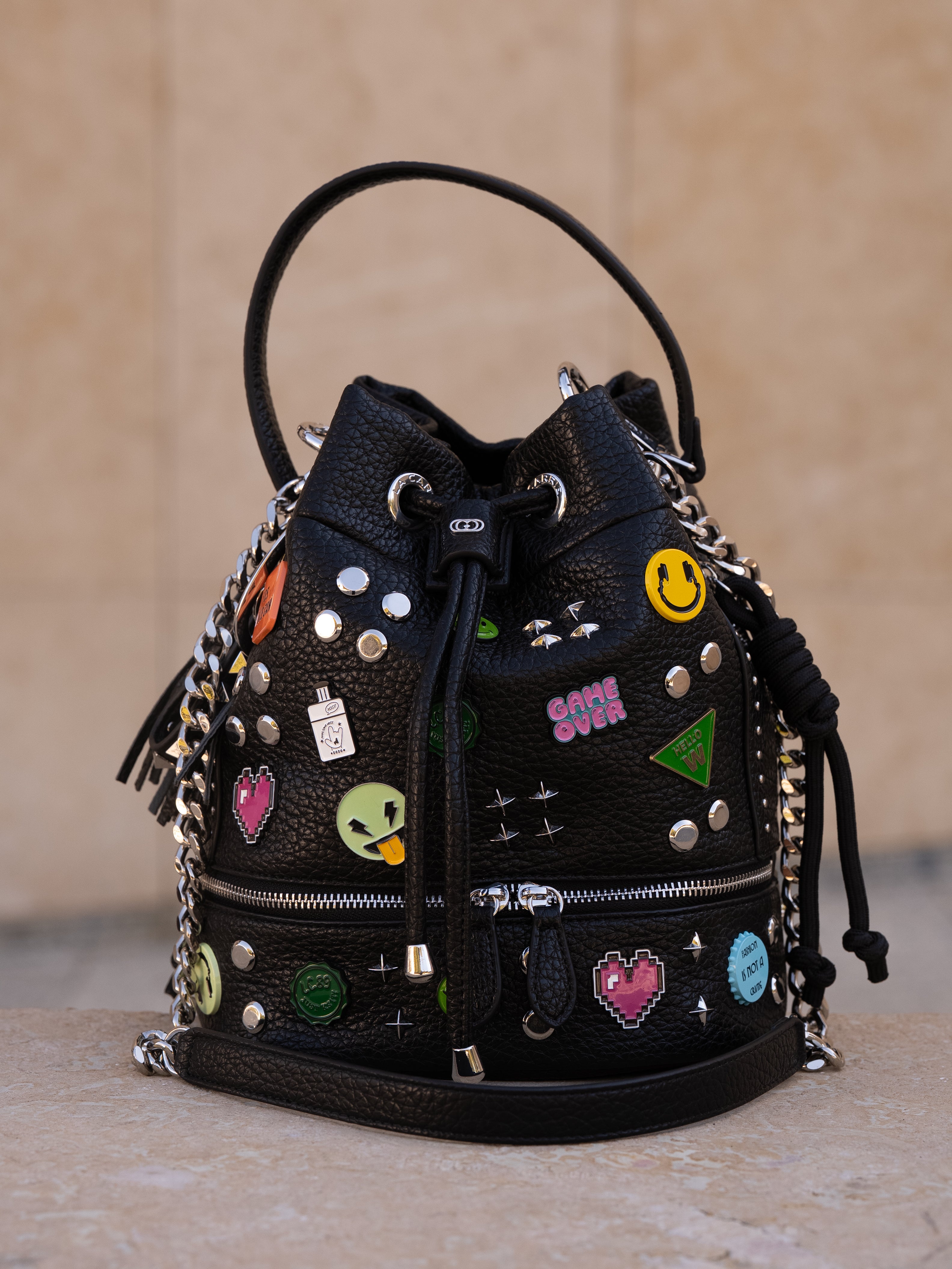 Hammered eco-leather bucket with colored pins applied, removable handle and shoulder strap