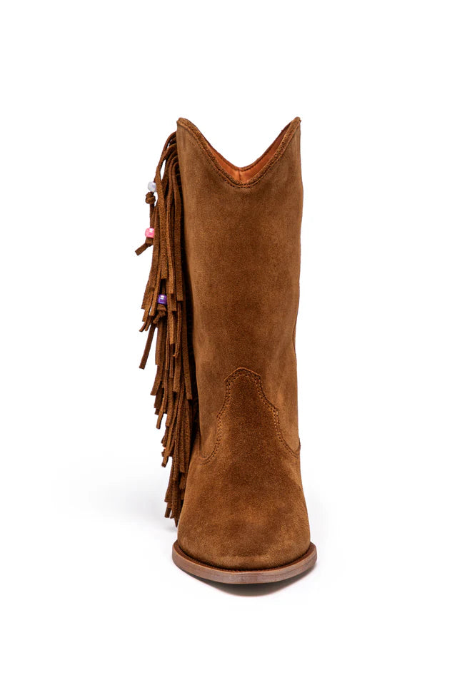 Handcrafted in Portugal from premium suede leather, this mid-calf boot features a classic pointed toe, a comfortable angled heel, and signature side fringes finished with subtle multicolour bead details. The warm brown tone enhances the texture of the suede, making it a versatile choice for both everyday wear and elevated looks.